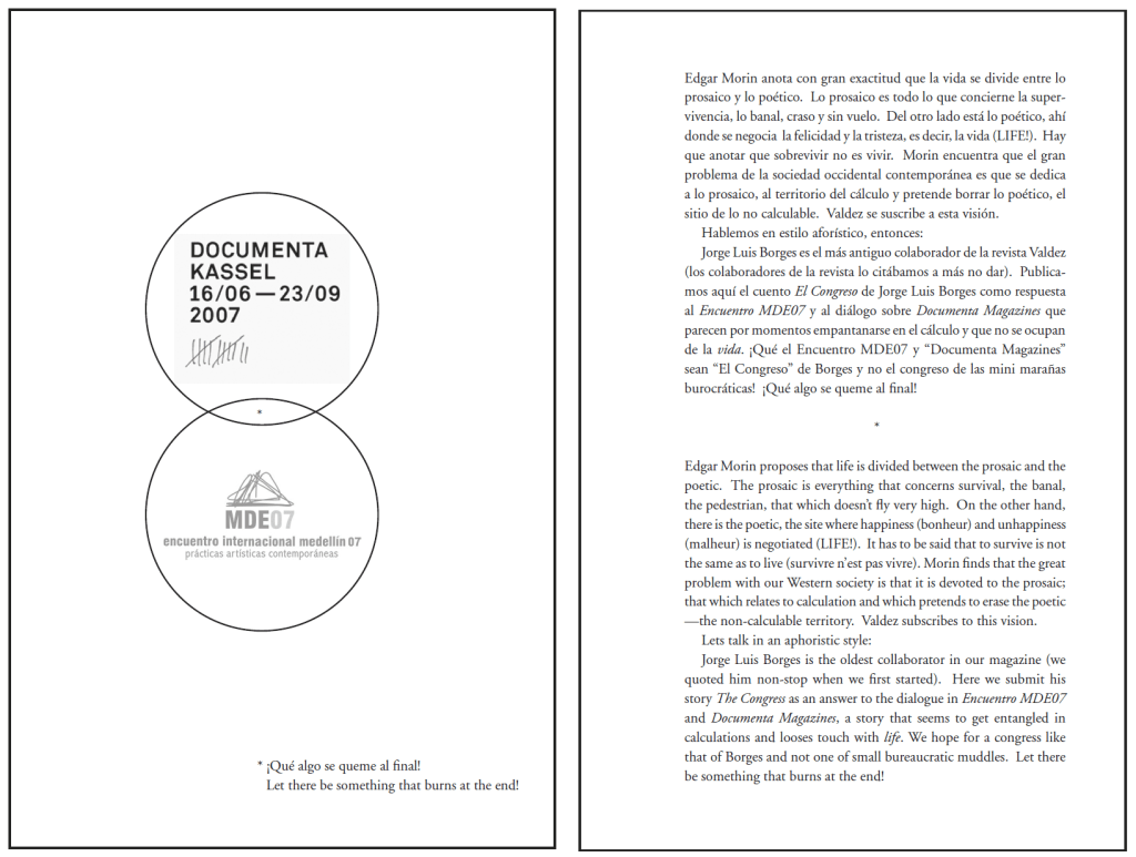 “voy a hablar de una revista, una revista que hago con dos amigos, con François Bucher y con Bernardo Ortíz, una revista con lomo que no tiene nombre pero que a falta de nombre tiene un apellido, la revista se llama Valdez. Recientemente François Bucher tuvo que enviar una descripción breve de la revista a un encuentro de publicaciones y esto fue lo que él escribió: “Valdez es una revista que tiene dos posiciones fundamentales: una es la de permanecer libre (en dos sentidos de la palabra) y la otra es la de rechazar ofertas de crecimiento para ser algo más que una revista (una especie de Bartleby editorial). Valdez comenzó como una diálogo local entre amigos en Colombia y —de manera similar a la cultura Amish de Pensilvanía, Estados Unidos, en el como ellos analizan el efecto de cada nueva tecnología sobre su sociedad— Valdez ha sido cuidadoso de no perder su sentido de lo anacrónico.