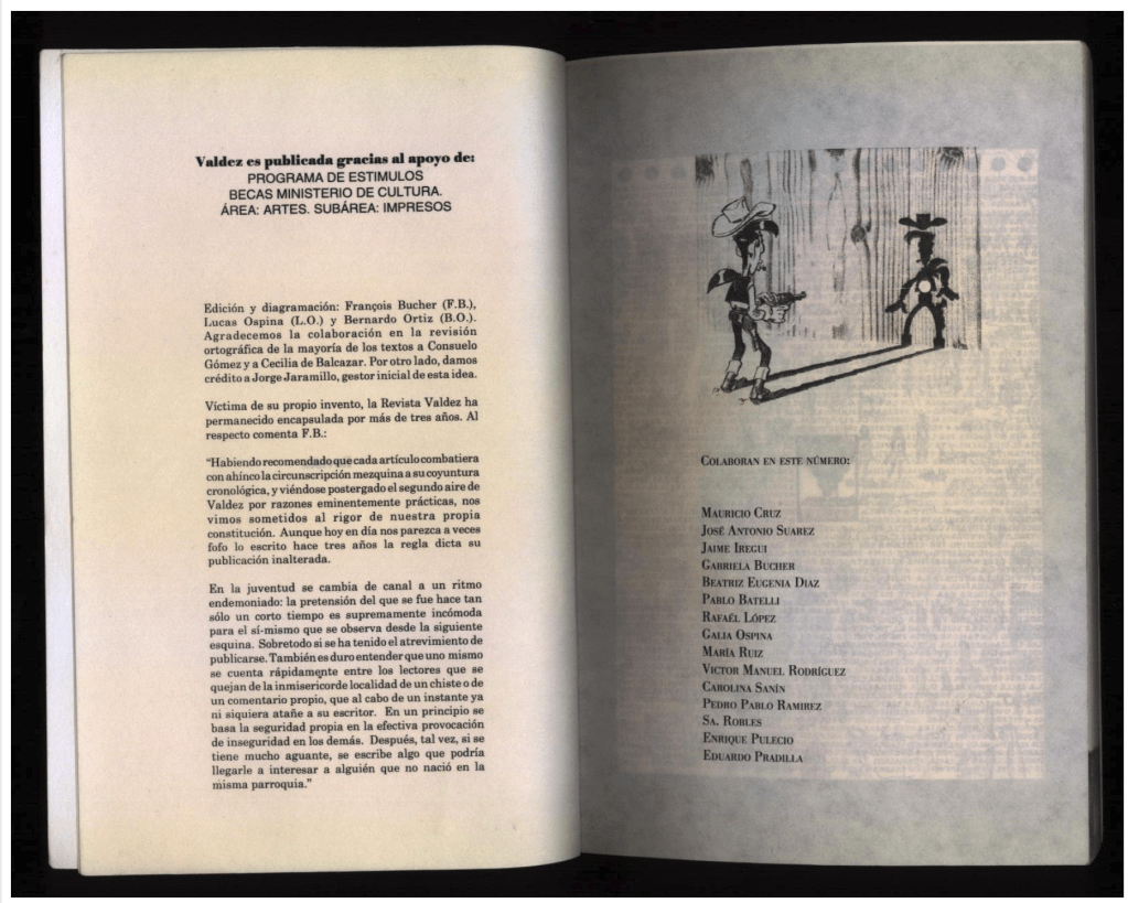 Inicialmente planteada por Bernardo Ortiz, Lucas Ospina y François Boucher, también autores de algunos de los textos, traducciones, fotografías, diseño y diagramación de la revista, “Valdez” se enfrentaba a manejar la autoridad de la palabra escrita, en una revista variada que, siempre con una mirada crítica y desenfadada, transitaba sin vacilar, del texto autorizado sobre temáticas de teoría contemporáneas, a los aportes de opinión de los tres jóvenes conceptores de la misma, guardando, sin embargo, un tono coherente, siempre dispuesto a sospechar de cómodas verdades, prejuicios y paradigmas.”