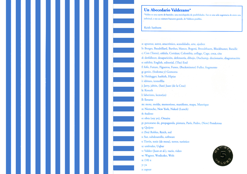 La revista se llama Valdez. La revista no tiene un editorial, tiene dos editoriales y tres editores. La revista traduce artículos y los publica sin el permiso de los autores pero con el conocimiento de los autores, la revista es libre porque es gratis y es gratis para poder ser libre. La revista solamente se publica cuando está lista, los editores leen muchos de los textos publicados sobre la edición ya impresa de la revista. La revista también es un objeto, uno de los editores aprecia su grosor. El género revista, o revista de arte, ha engendrado Valdez. El género revista nos dio su mano, nosotros le cogimos el codo y mucho, mucho más que la rodilla. Ya se han generado cinco números de Valdez.”
