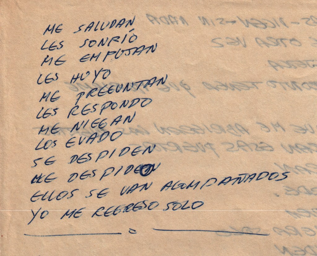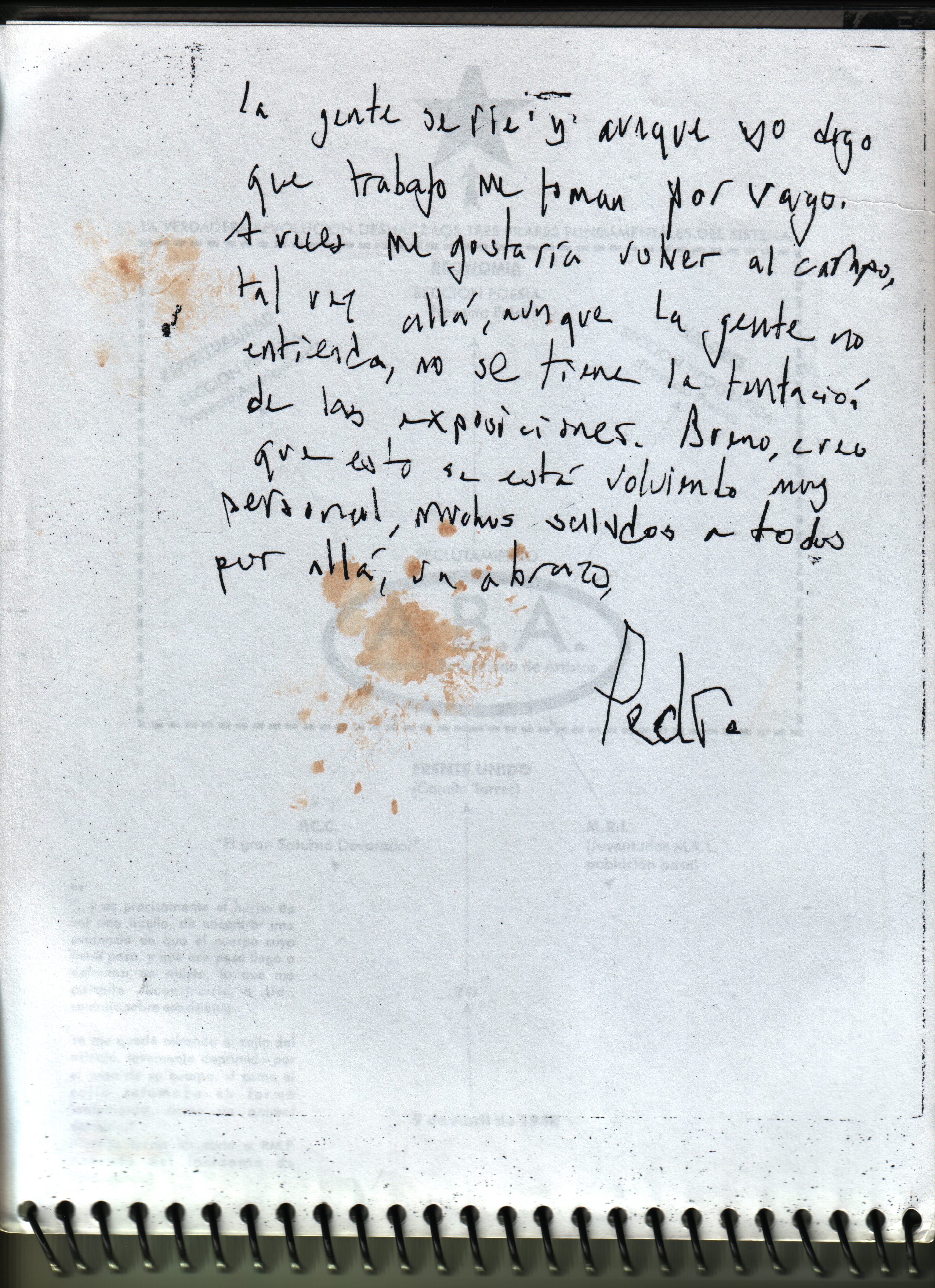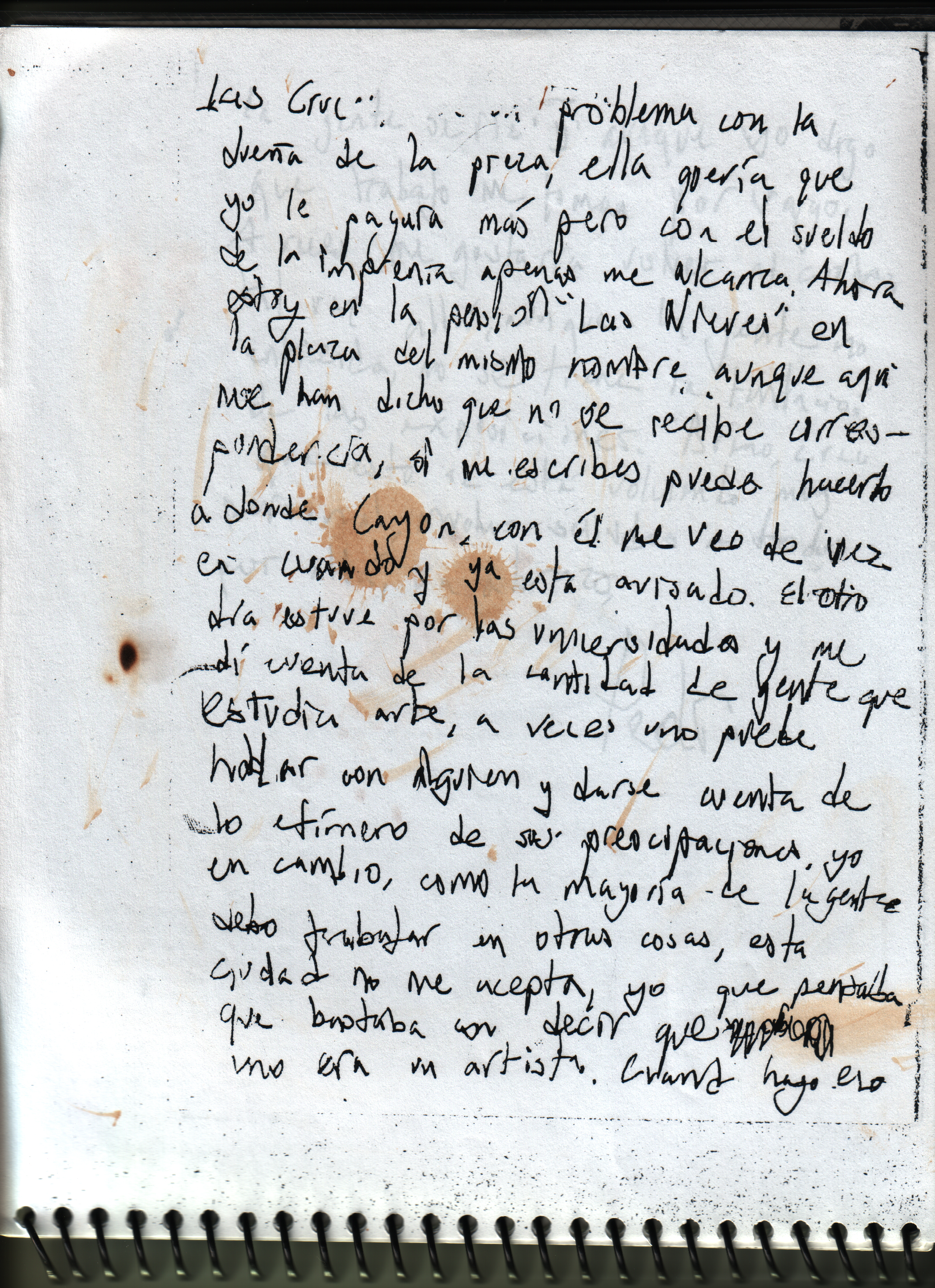 Con respecto a mí, no puedo decir mucho, nuevamente he intentado entrar al concurso nacional de artistas (sic) pero me han rechazado, sin embargo sigo haciendo mis pegotes pues en mis ratos libres es lo único que tengo. Claro que también leo mucho. Te cuento que me mudé de las Cruces pues tuve un problema con la dueña de la pieza, ella quería que le pagara más pero con el sueldo de la imprenta apenas me alcanza. Ahora estoy en la pensión “Las Nieves” en la plaza del mismo nombre aunque aquí me han dicho que no se recibe correspondencia, SI ME ESCRIBES PUEDES HACERLO A DONDE Cayón, con él me veo de vez en cuando y ya está avisado. El otro día estuve por las universidades y me di cuenta de la cantidad de gente que estudia arte, a veces uno puede hablar con alguien y darse cuenta de lo efímero de sus preocupaciones. Yo, en cambio, como la mayoría de la gente debo trabajar en otras cosas, esta ciudad no me acepta, yo que pensaba que bastaba con decir que uno era un artista. Cuando hago eso la gente se ríe y aunque yo digo que trabajo me toman por vago. A veces me gustaría volver al campo, tal vez allá, aunque la gente no entienda, no se tiene la tentación de las exposiciones. Bueno, creo que esto se está volviendo muy personal, muchos saludos a todos por allá, un abrazo,