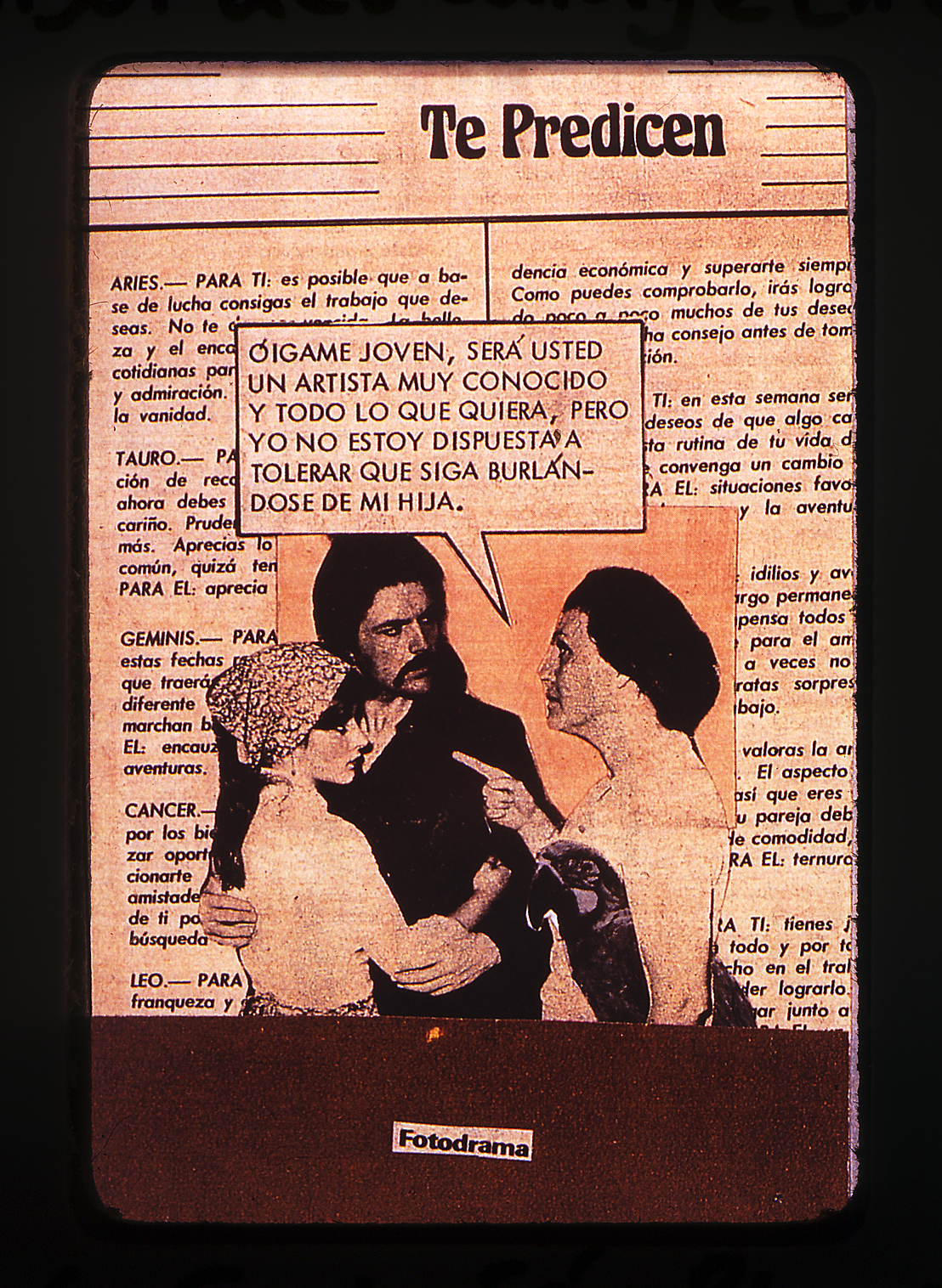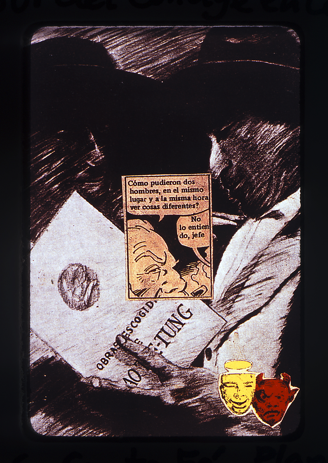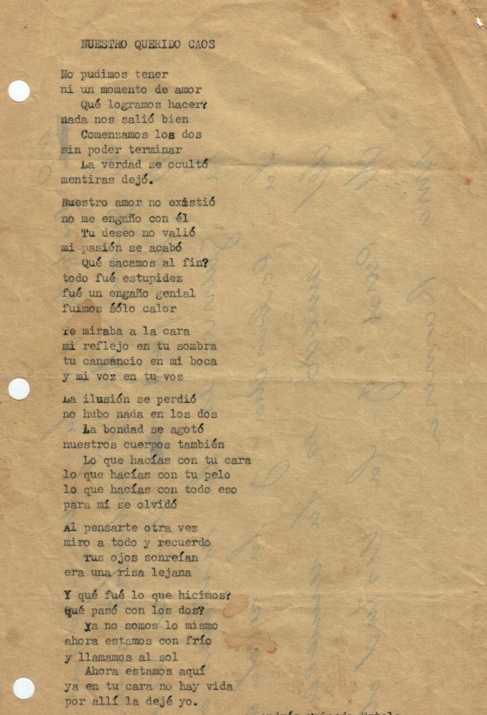 Con respecto a mí, no puedo decir mucho, nuevamente he intentado entrar al concurso nacional de artistas (sic) pero me han rechazado, sin embargo sigo haciendo mis pegotes pues en mis ratos libres es lo único que tengo. Claro que también leo mucho. Te cuento que me mudé de las Cruces pues tuve un problema con la dueña de la pieza, ella quería que le pagara más pero con el sueldo de la imprenta apenas me alcanza. Ahora estoy en la pensión “Las Nieves” en la plaza del mismo nombre aunque aquí me han dicho que no se recibe correspondencia, SI ME ESCRIBES PUEDES HACERLO A DONDE Cayón, con él me veo de vez en cuando y ya está avisado. El otro día estuve por las universidades y me di cuenta de la cantidad de gente que estudia arte, a veces uno puede hablar con alguien y darse cuenta de lo efímero de sus preocupaciones. Yo, en cambio, como la mayoría de la gente debo trabajar en otras cosas, esta ciudad no me acepta, yo que pensaba que bastaba con decir que uno era un artista. Cuando hago eso la gente se ríe y aunque yo digo que trabajo me toman por vago. A veces me gustaría volver al campo, tal vez allá, aunque la gente no entienda, no se tiene la tentación de las exposiciones. Bueno, creo que esto se está volviendo muy personal, muchos saludos a todos por allá, un abrazo,