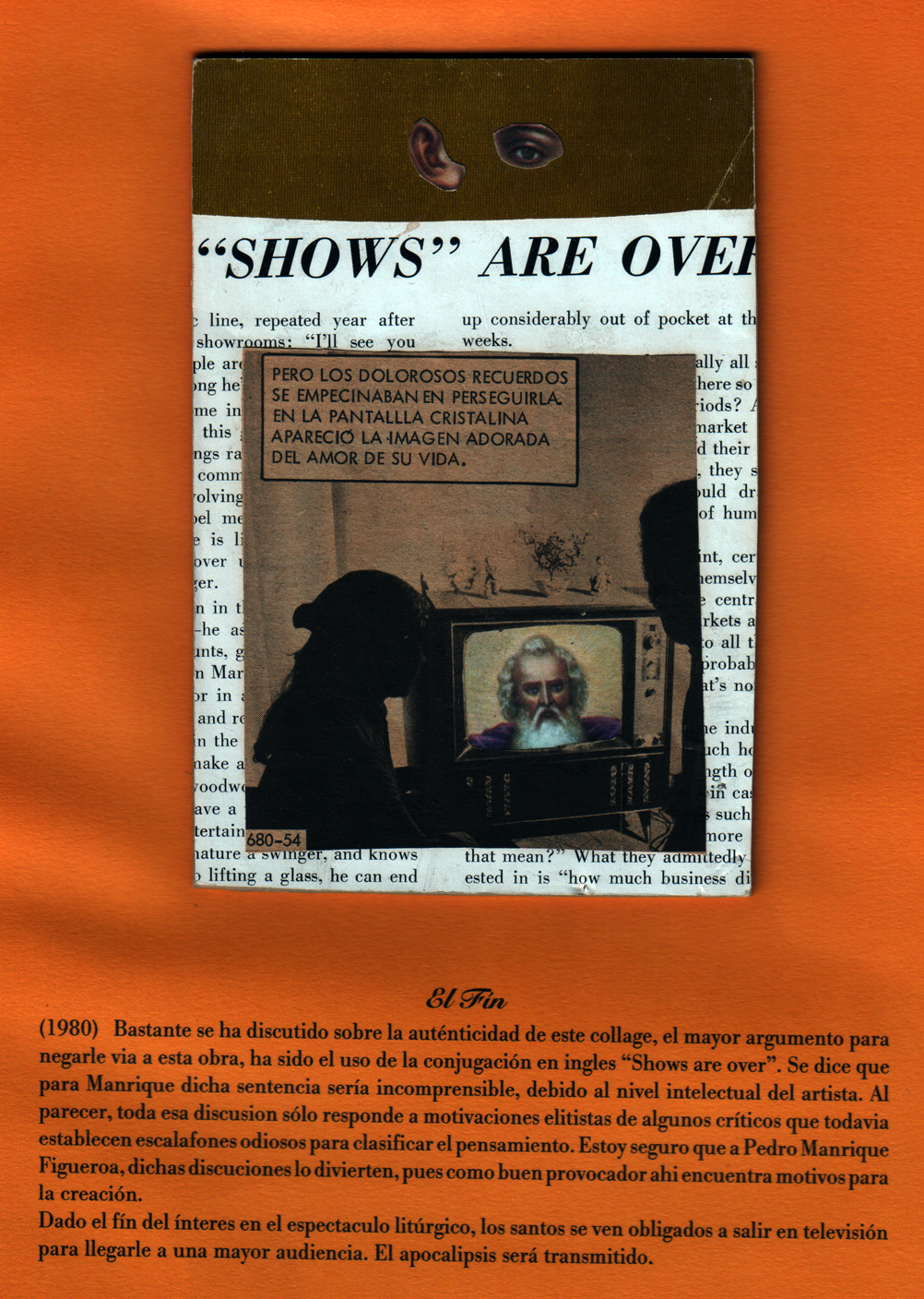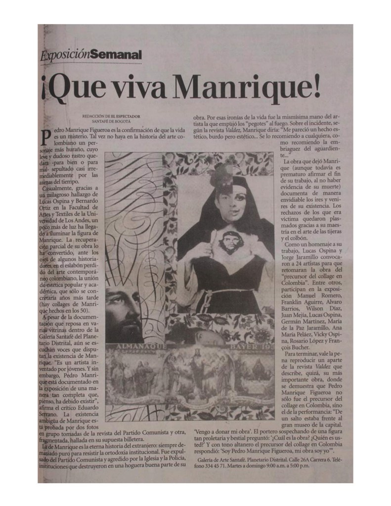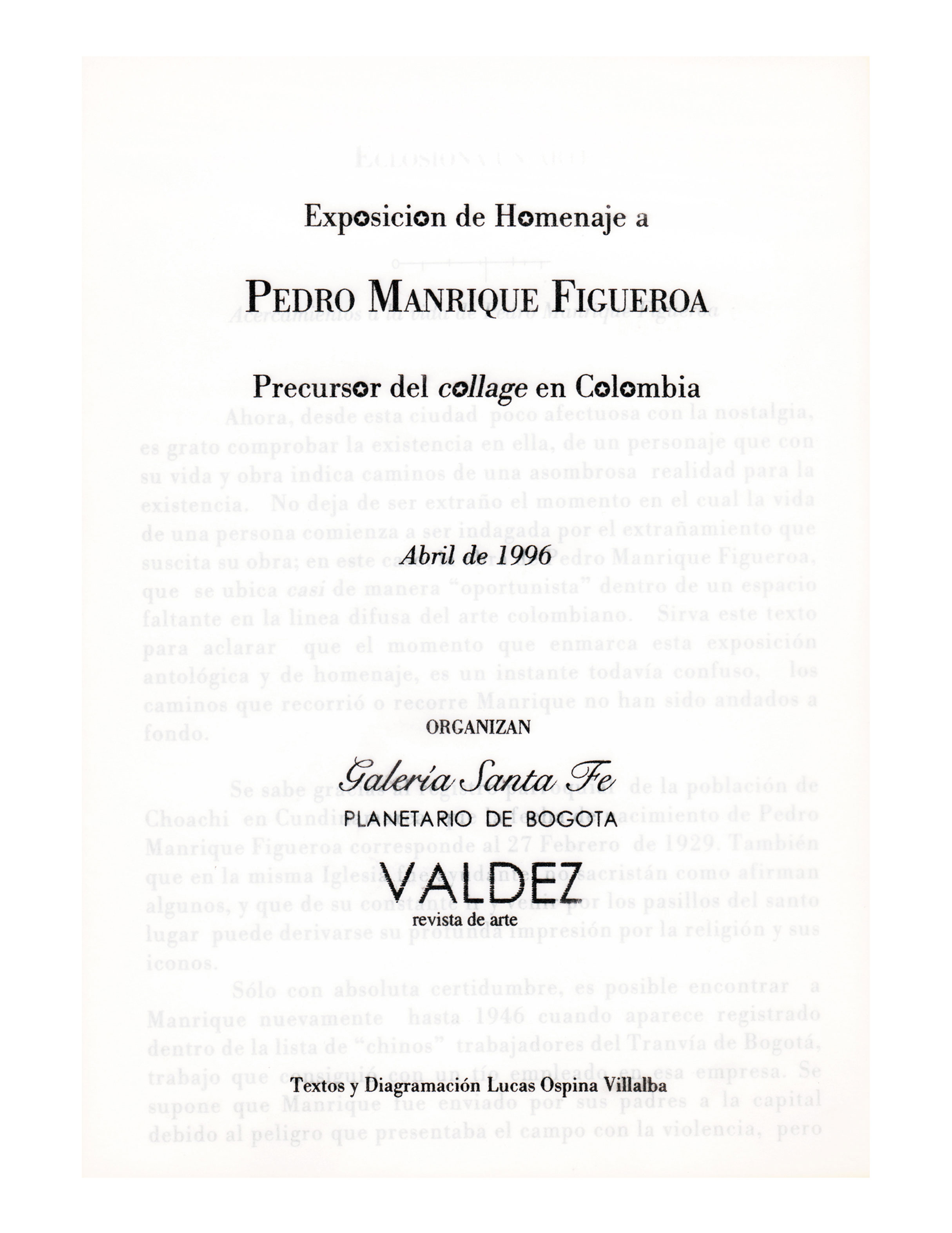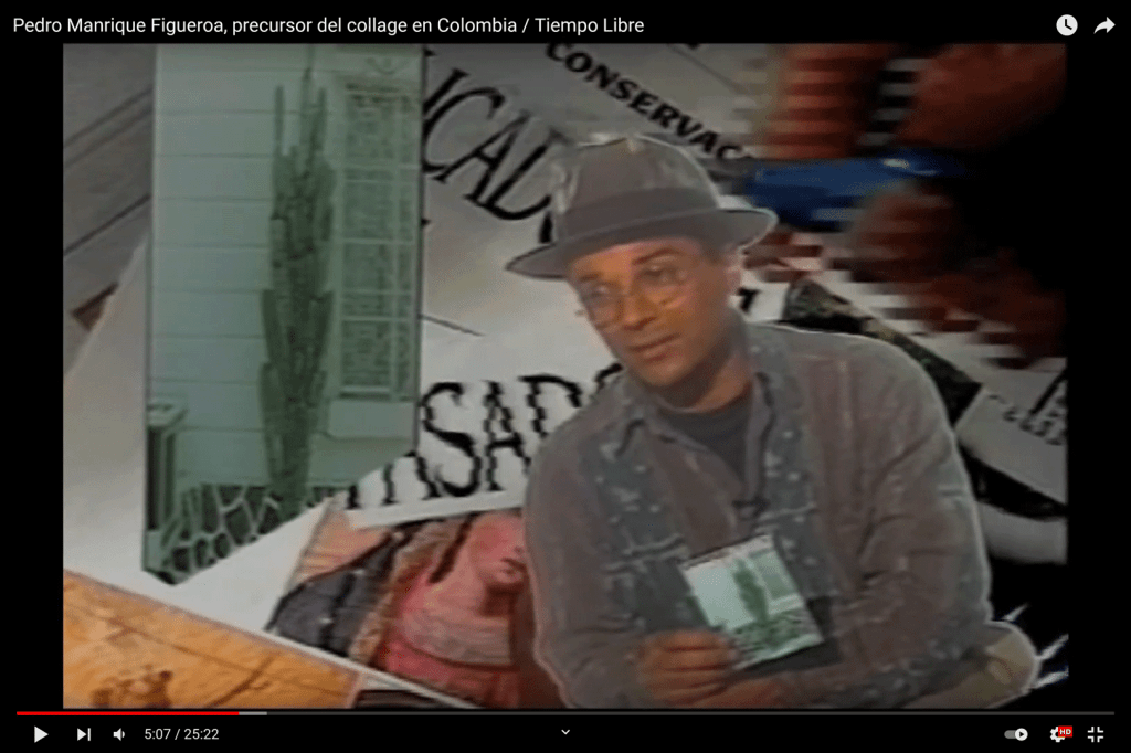 Programa Tiempo Libre de la unidad de televisión de Colcultura dedicado a la exposición Homenaje a Pedro Manrique Figueroa, precursor del collage en Colombia hecha en 1996 en la Galería Santa Fe del Planetario de Distrital. El programa fue dirigido por Elvia Beatriz Mejia, la realización fue de Johana Rodríguez y contó con la investigación y diseño conceptual de Adolfo Chaparro y la musicalización de Carlos Heredia. Participan Eduardo Pradilla, Ignacio Abello, Mauricio Nieto, Manuel Hernández, María Teresa Guerrero, Víctor Manuel Rodríguez, Francois Bucher y la aparición especial de Rogelio Sandoval como Pedro Manrique Figueroa. Agradecimientos al club de billares San Marino y a los testimonios de algunos de sus habituales de la época.
