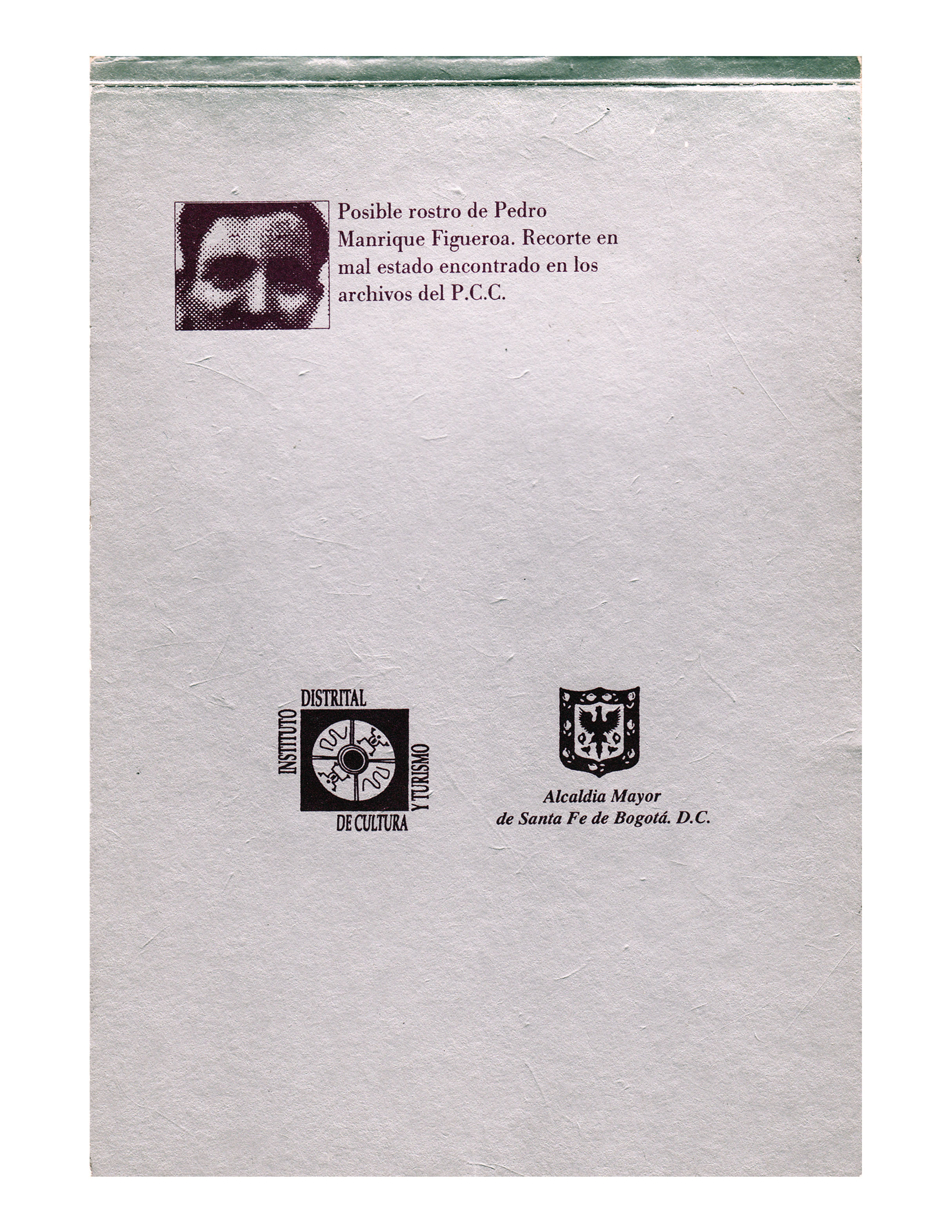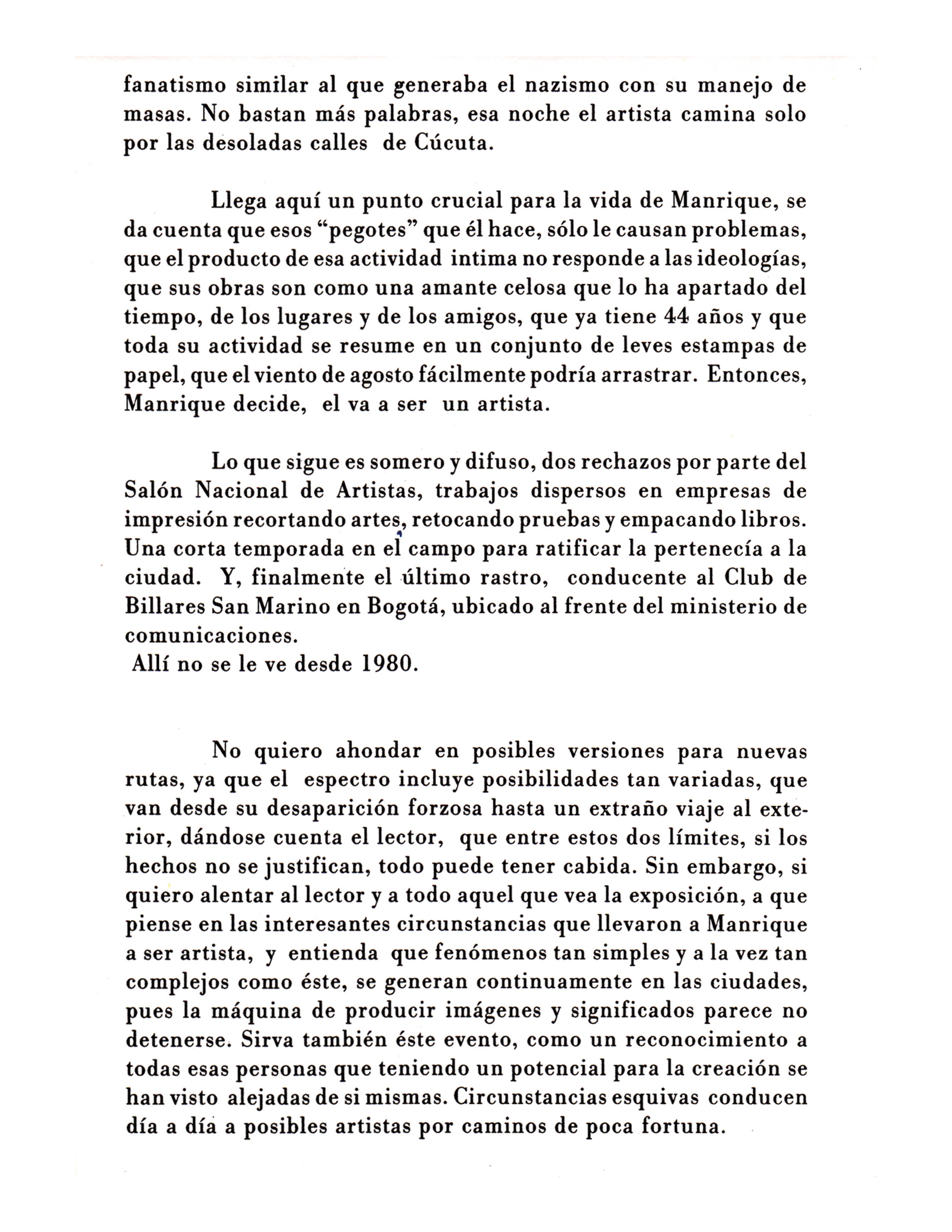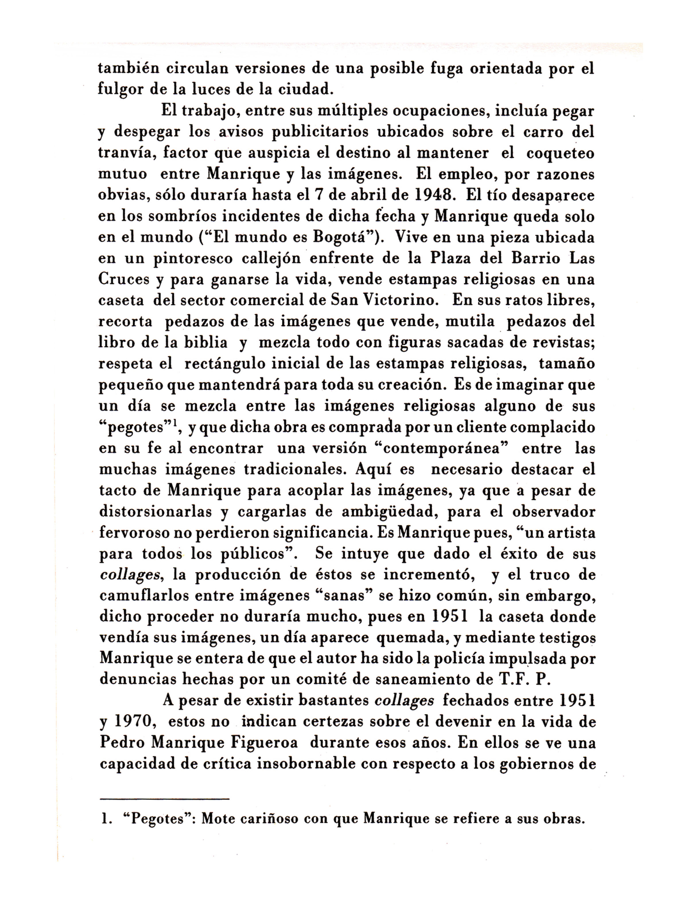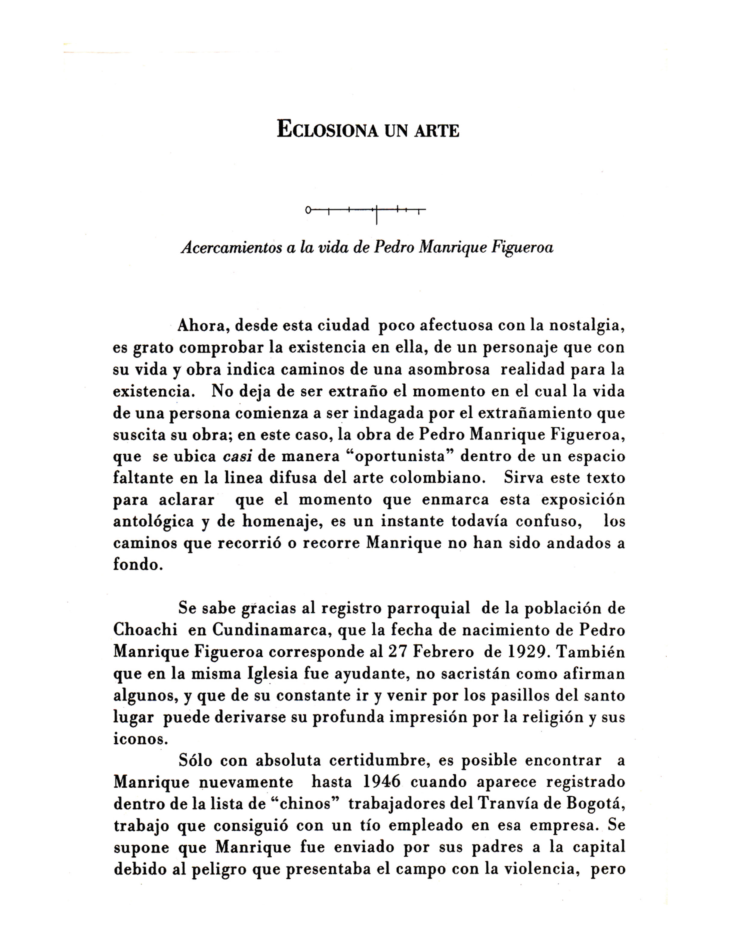 Programa Tiempo Libre de la unidad de televisión de Colcultura dedicado a la exposición Homenaje a Pedro Manrique Figueroa, precursor del collage en Colombia hecha en 1996 en la Galería Santa Fe del Planetario de Distrital. El programa fue dirigido por Elvia Beatriz Mejia, la realización fue de Johana Rodríguez y contó con la investigación y diseño conceptual de Adolfo Chaparro y la musicalización de Carlos Heredia. Participan Eduardo Pradilla, Ignacio Abello, Mauricio Nieto, Manuel Hernández, María Teresa Guerrero, Víctor Manuel Rodríguez, Francois Bucher y la aparición especial de Rogelio Sandoval como Pedro Manrique Figueroa. Agradecimientos al club de billares San Marino y a los testimonios de algunos de sus habituales de la época.