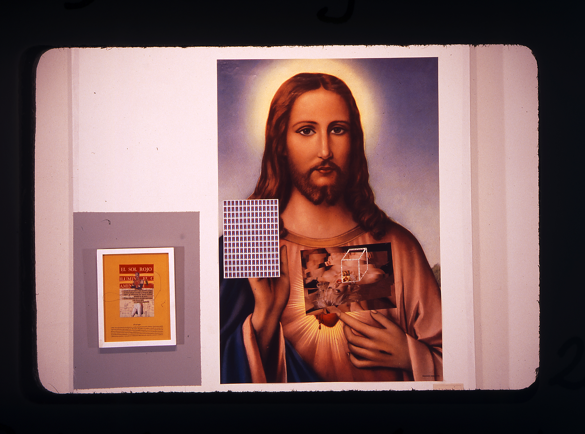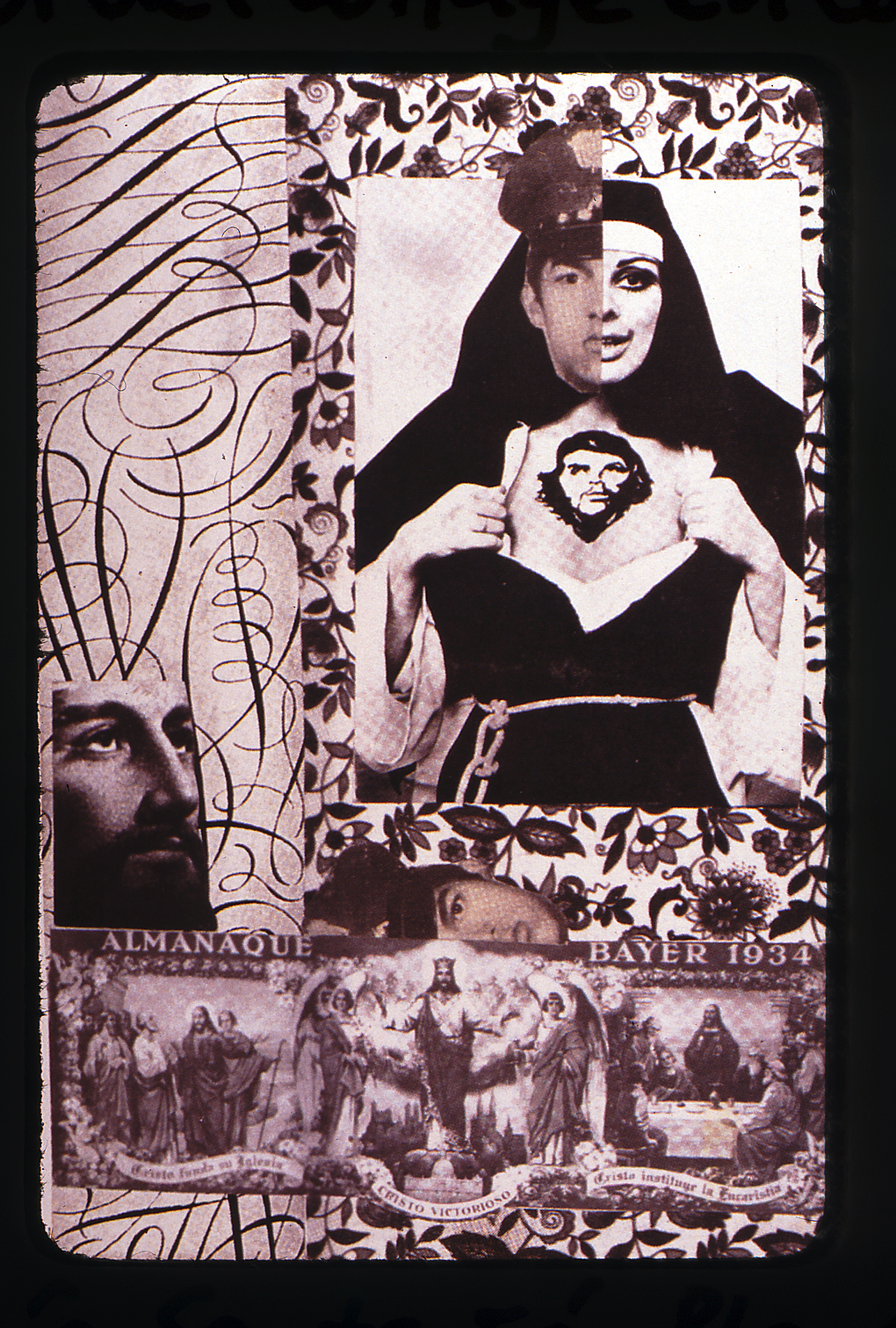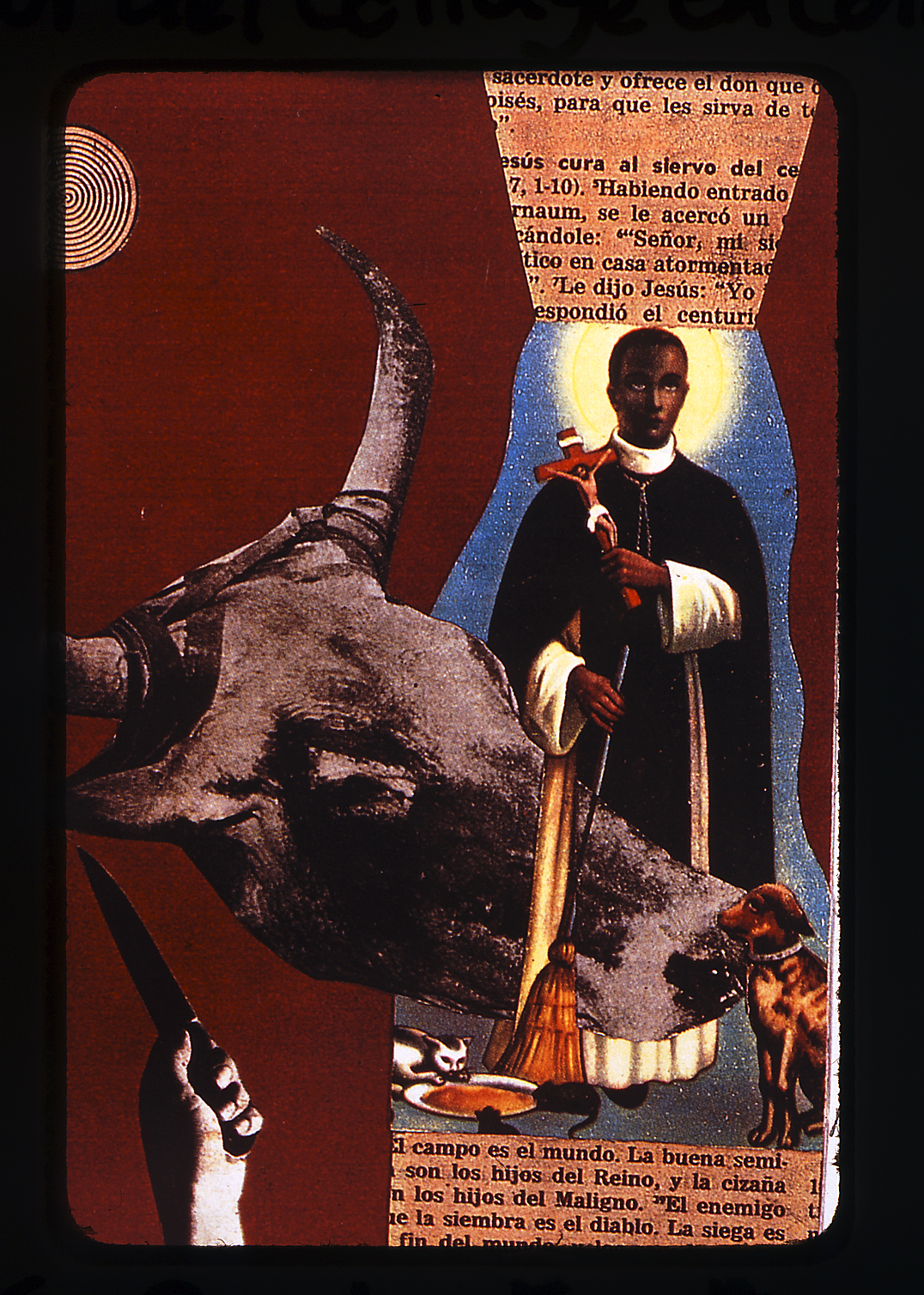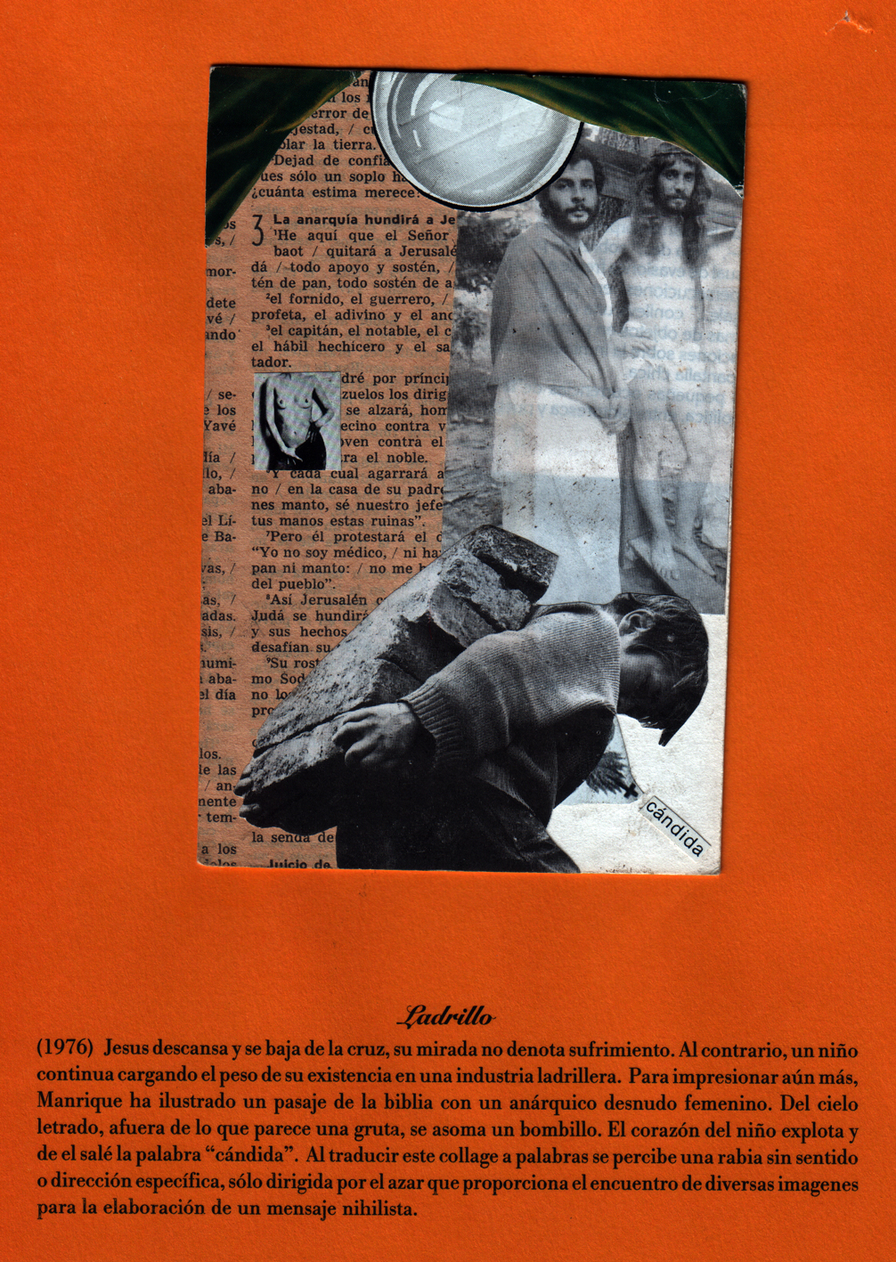 Collage de la época de San Victorino donde Manrique entre sus ventas de estampas religiosas camuflaba estampitas alteradas por sus inquietudes artísticas. En la imagen se pueden observar amputacionews directas de las páginas de la Biblia. Dichos fragmentos alegóricos juegan simbólicamente con el título, pues si bien aquí la Biblia no debe ser tocada, se delata el contraste con el país de la India, la barbarie con que las gentes de estas tierras sacrifican a los animales.