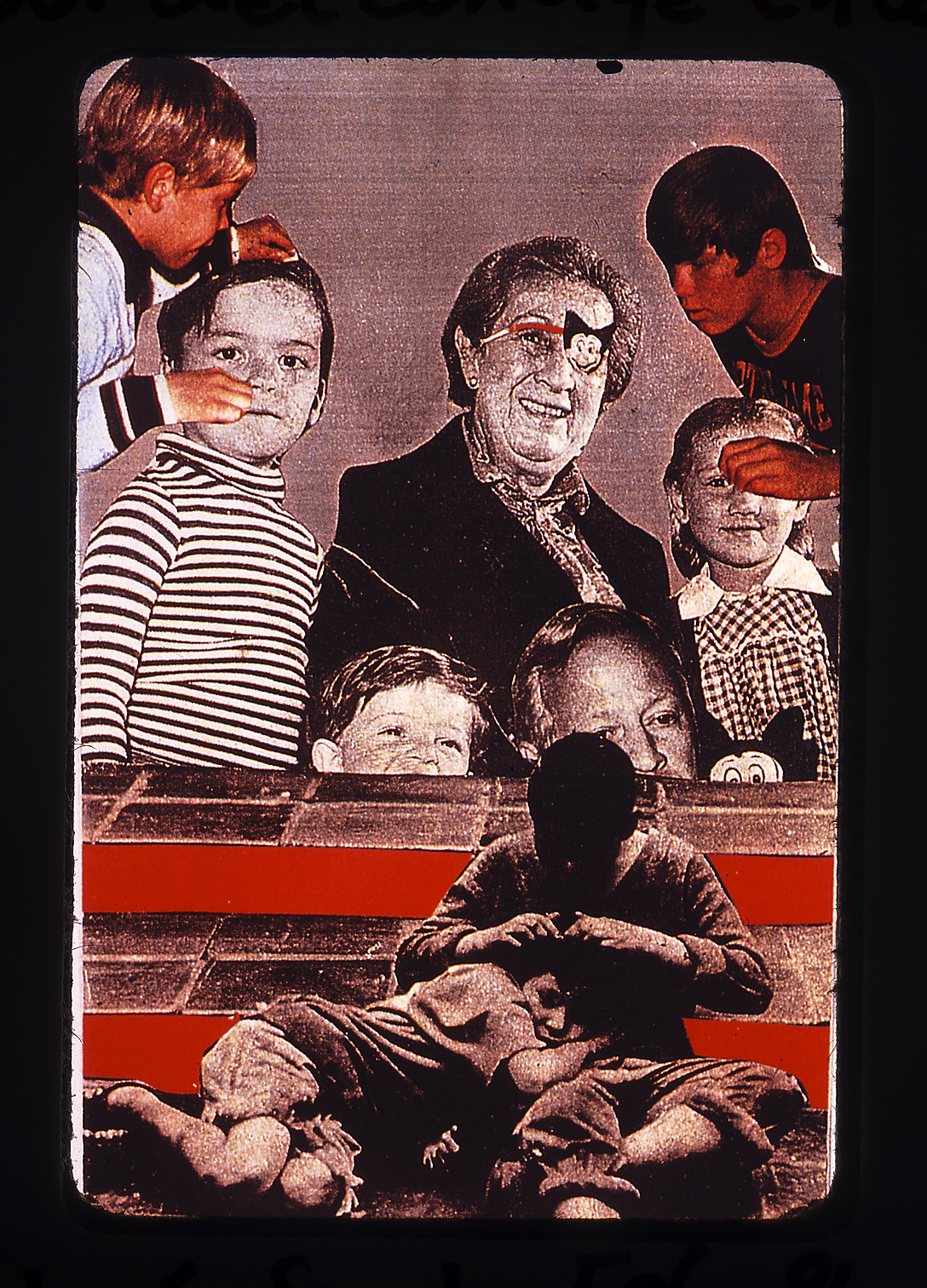 La presencia de parásitos contagiosos es muy común en los niños de clases populares, gracias a la magia del collage, dichos bichos son trasmitidos a los sobrinos de doña Berta Hernández de Ospina Pérez. Ella, talvez para distraerlos, se ha colocado un parche en el ojo con la figura del ratón Miguelito.