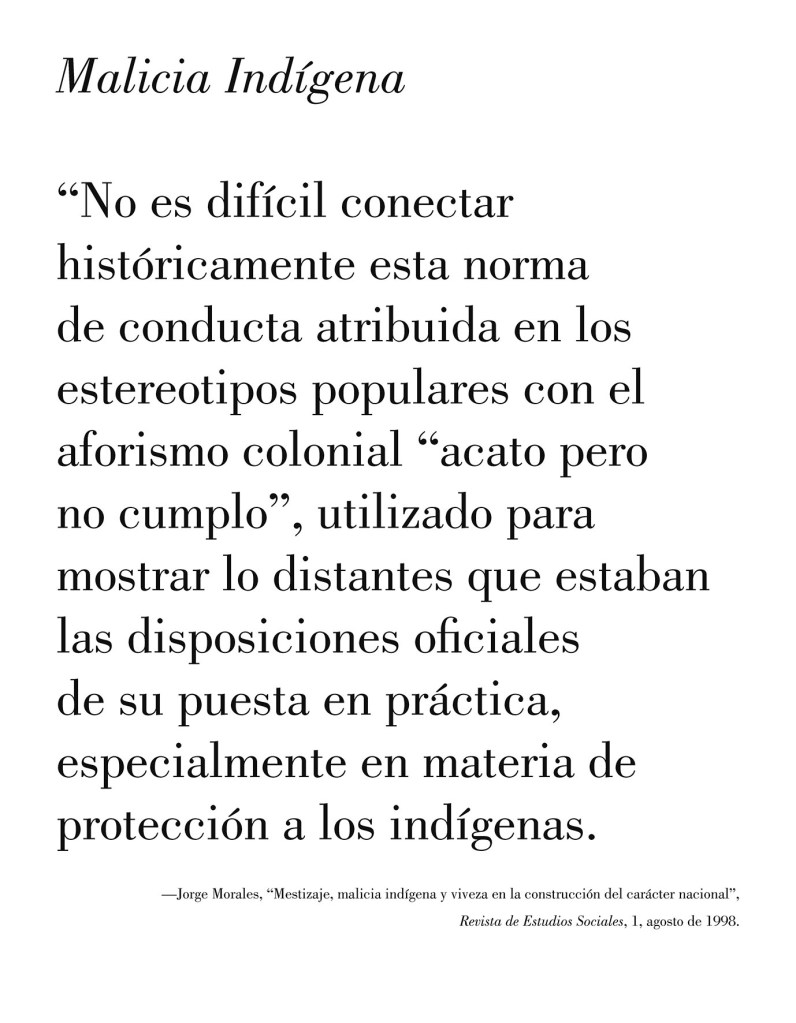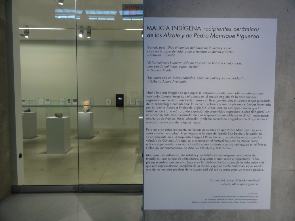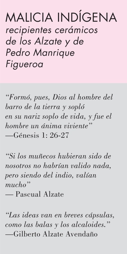 Malicia indígena, recipientes cerámicos de los Alzate y de Pedro Manrique Figueroa es un acto soberano de la imaginación donde se nos dice que el oficio artístico (y su vecino, el expositivo) pueden tener en la invención una de sus fuentes más perdurables. Una exposición para leer y observar, para mirar de cerca y después alejarse, para establecer relaciones cruzadas entre épocas históricas. Una exposición que sale y entra en la ficción alternativamente, que crea marcos y luego los destruye, que puede adquirir la apariencia de la realidad documental más contundente, pero a la vez utilizar las técnicas más alabadas del engaño.