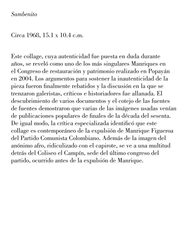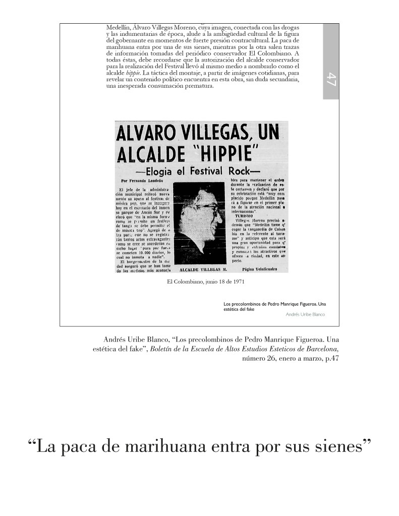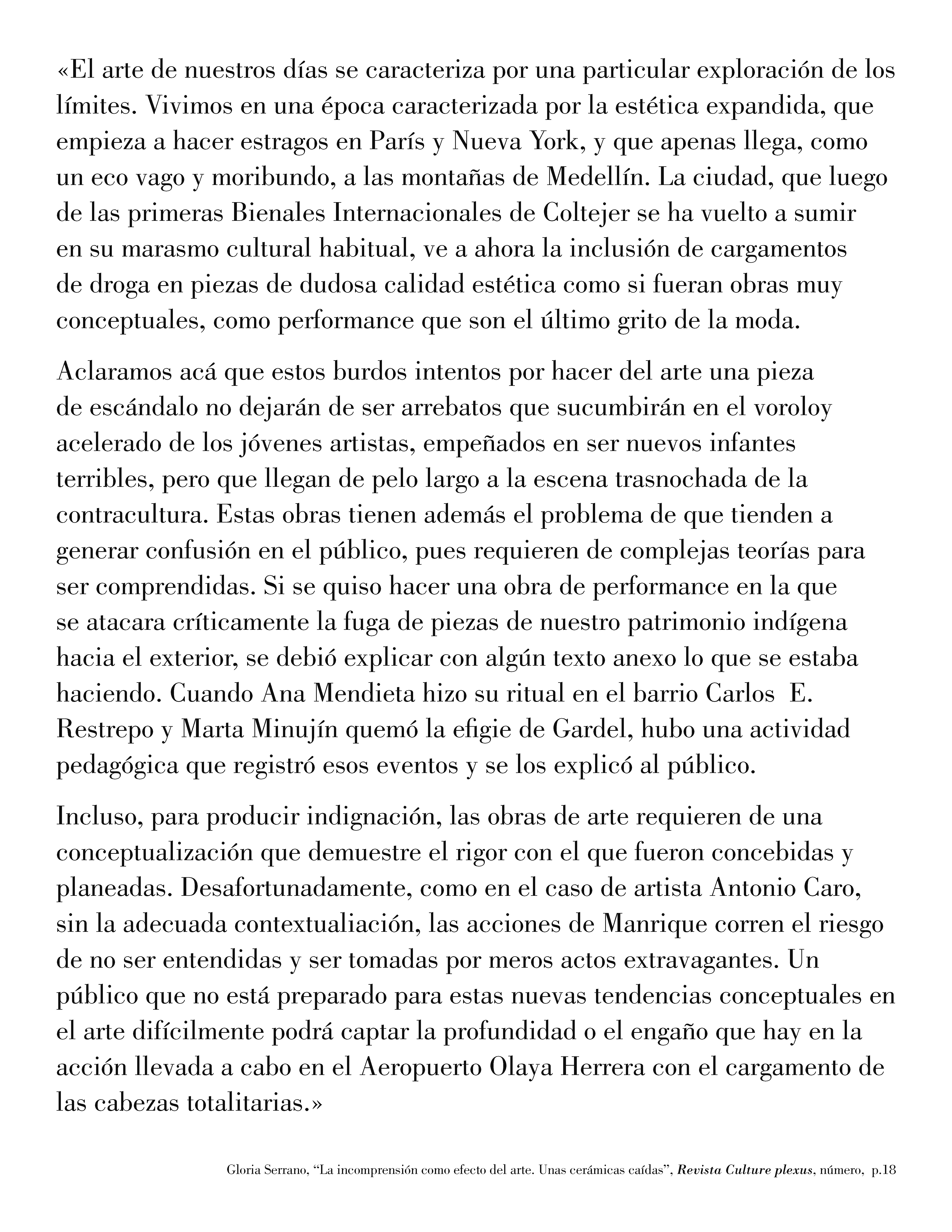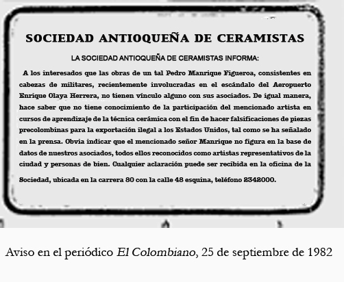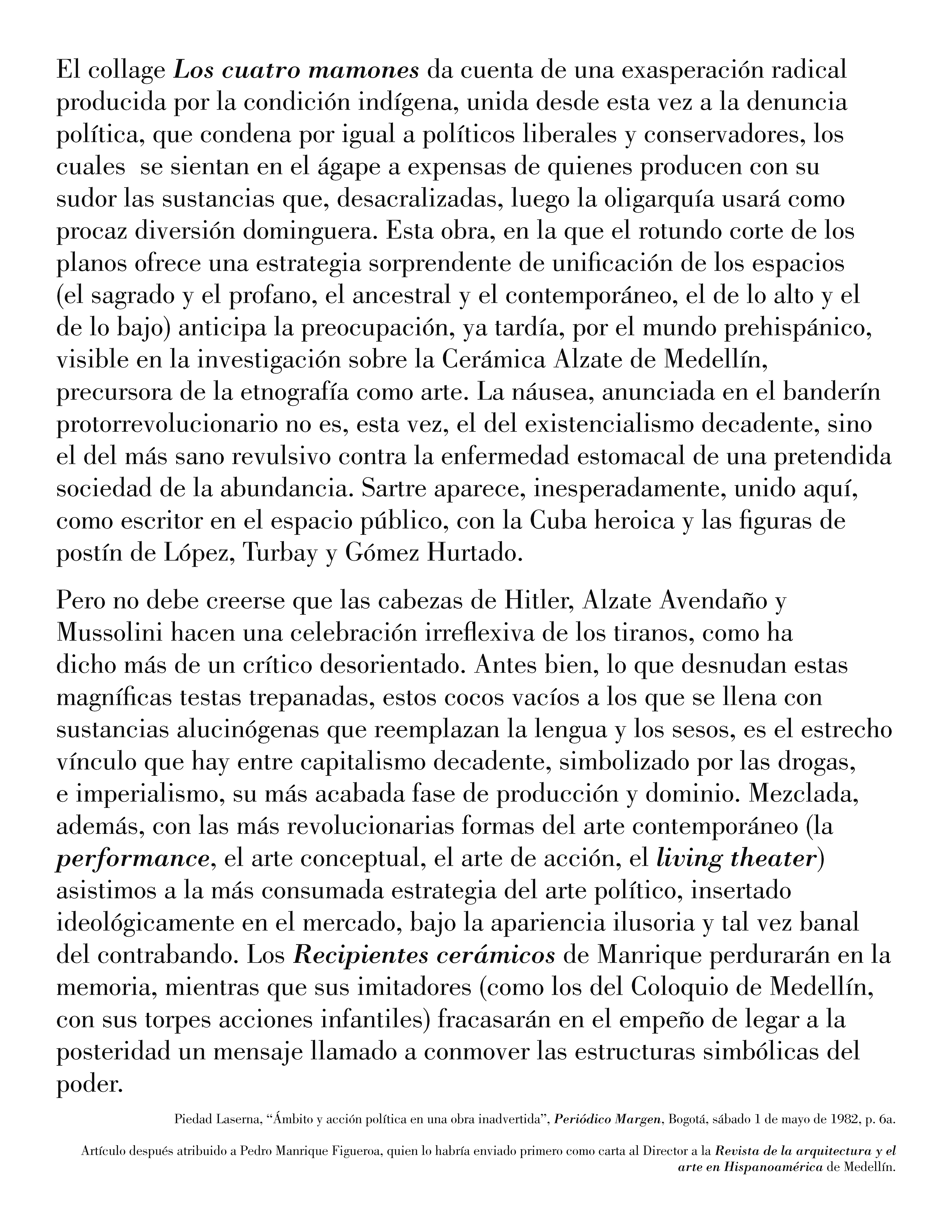 «La historia medellinense de Manrique Figueroa tiene varios movimientos: su arribo a mediados de los años sesenta para entrevistarse con uno de los descendientes de la familia Alzate y aprender las técnicas de la falsificación en cerámica, la asistencia como músico a cionado al Festival de Ancón en el año 71, la participación fallida como artista no objetual en el Coloquio del año 81 y la caída a mediados de los ochenta de un cargamento de cabezas fascistas realizadas en cerámica y rellenas de estupefacientes en el aeropuerto Olaya Herrera.»