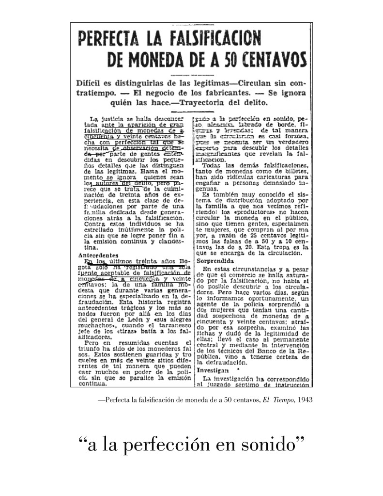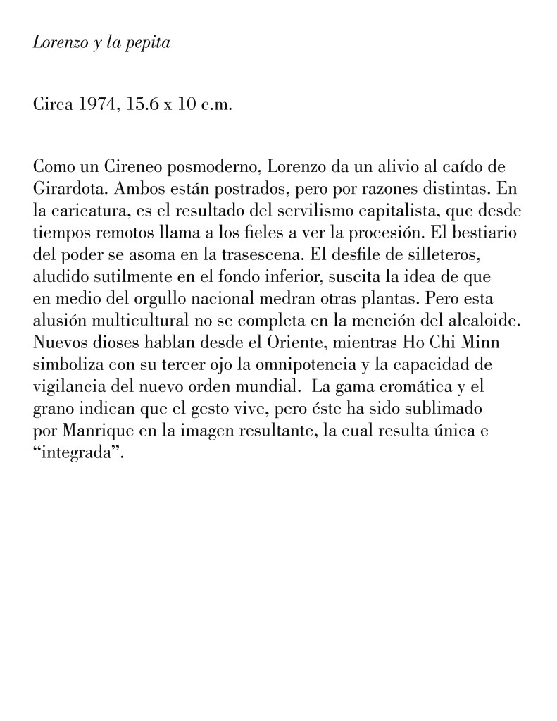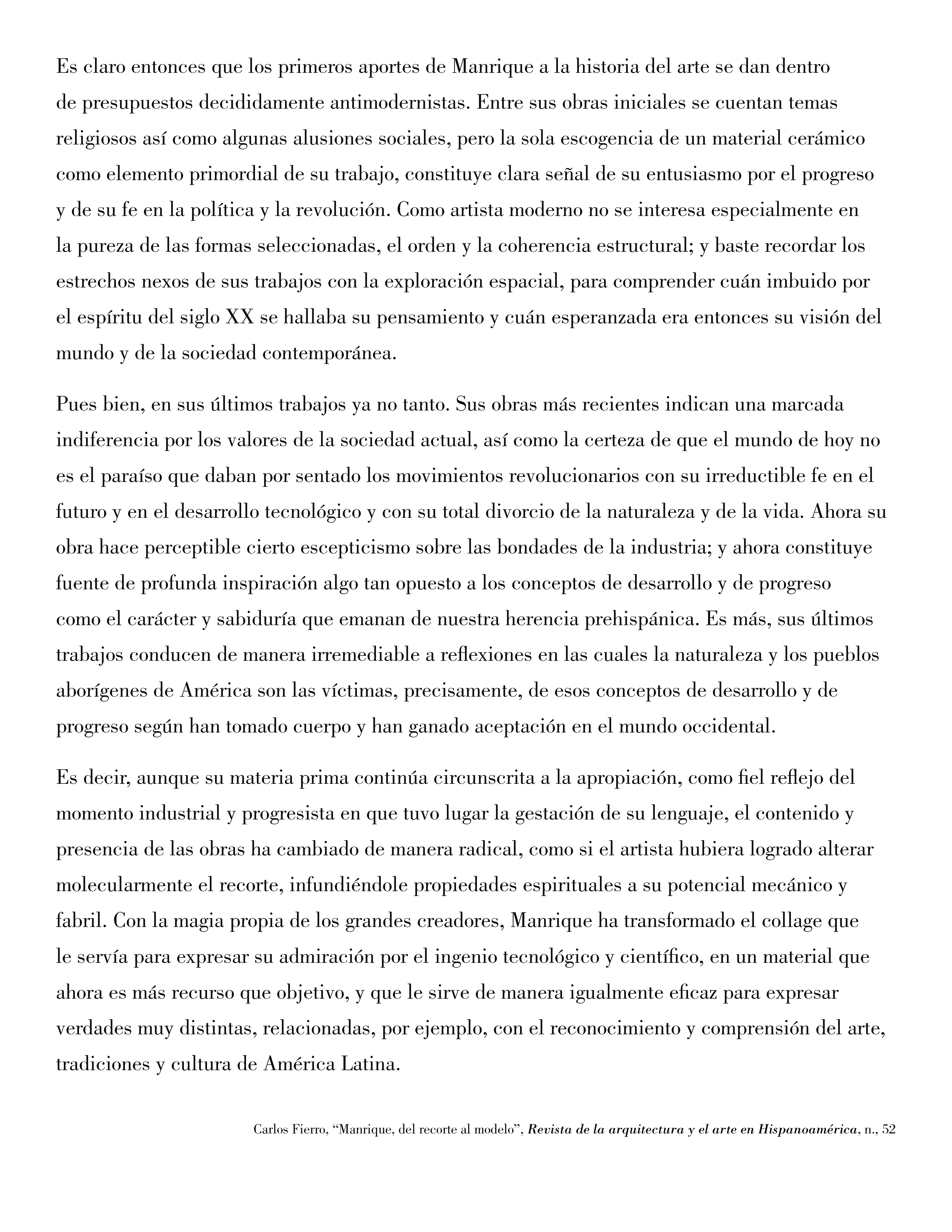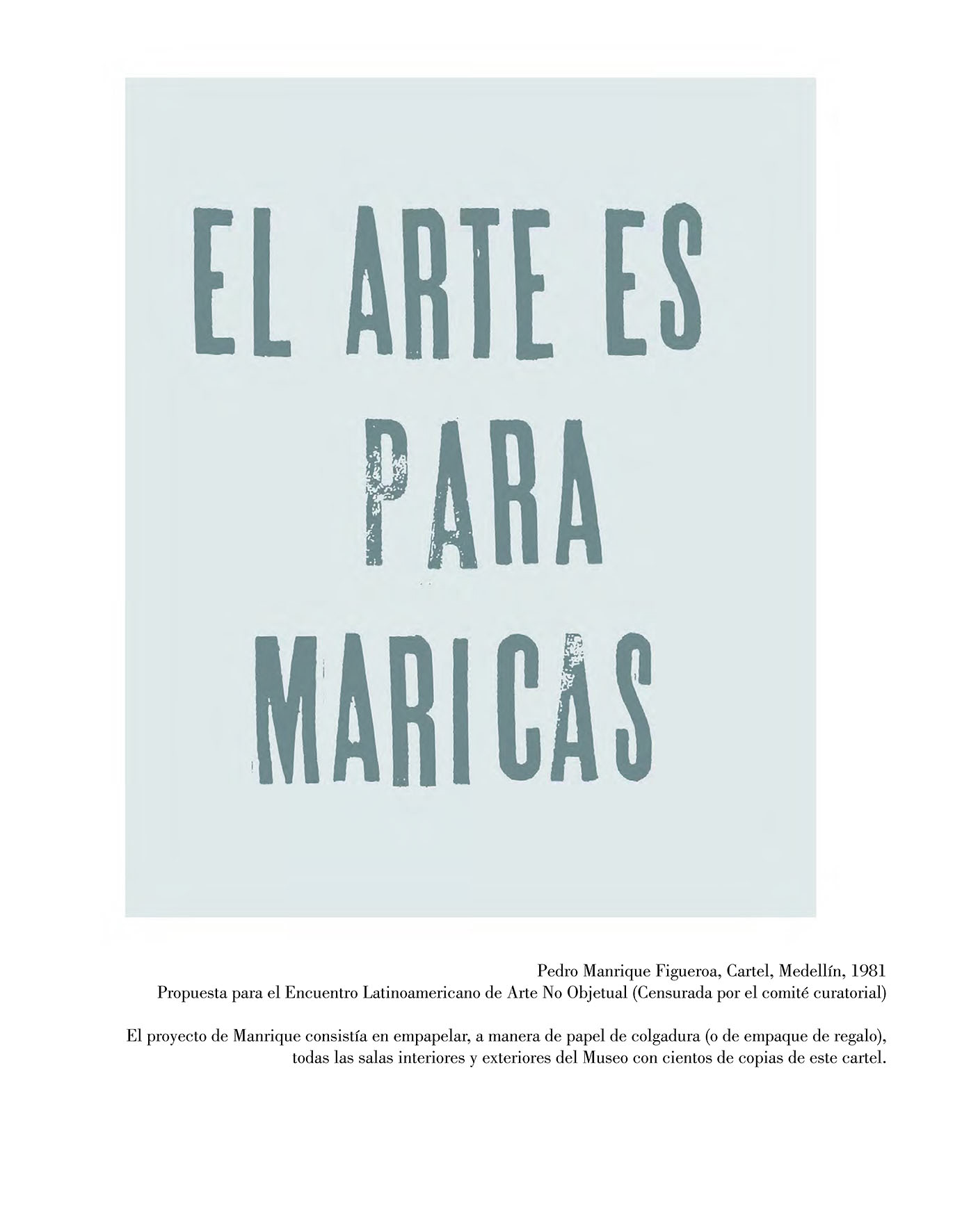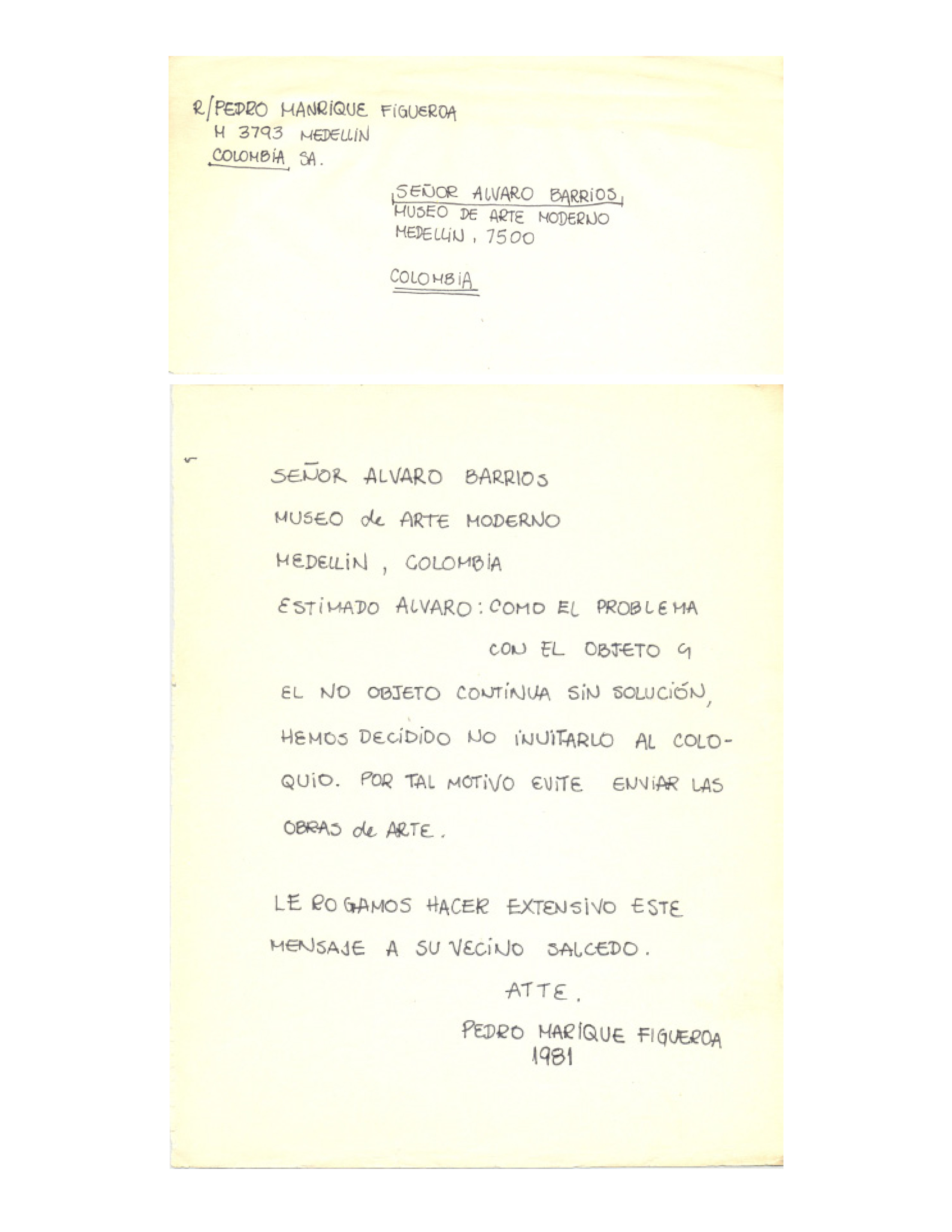 «La historia medellinense de Manrique Figueroa tiene varios movimientos: su arribo a mediados de los años sesenta para entrevistarse con uno de los descendientes de la familia Alzate y aprender las técnicas de la falsificación en cerámica, la asistencia como músico a cionado al Festival de Ancón en el año 71, la participación fallida como artista no objetual en el Coloquio del año 81 y la caída a mediados de los ochenta de un cargamento de cabezas fascistas realizadas en cerámica y rellenas de estupefacientes en el aeropuerto Olaya Herrera.»