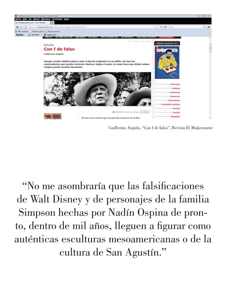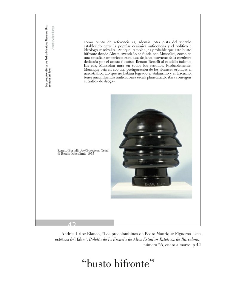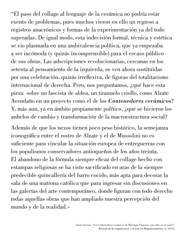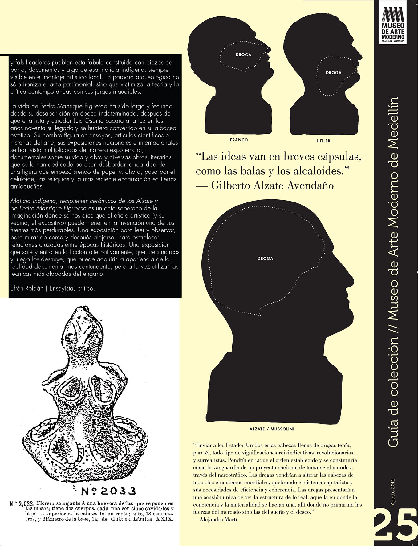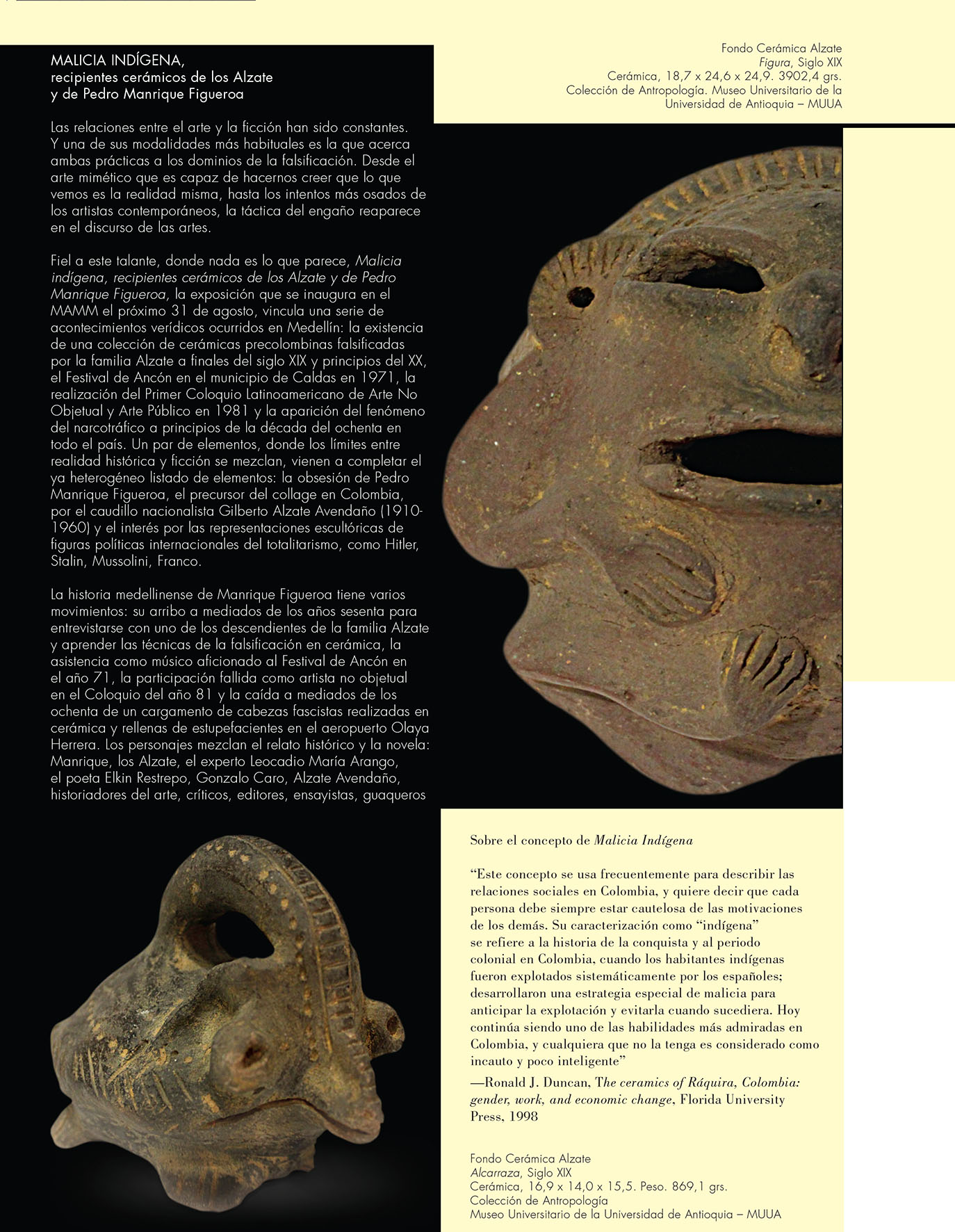 Fiel a este talante, donde nada es lo que parece, Malicia indígena, recipientes cerámicos de los Alzate y de Pedro Manrique Figueroa, la exposición que se inaugura en el MAMM el próximo 31 de agosto, vincula una serie de acontecimientos verídicos ocurridos en Medellín: la existencia de una colección de cerámicas precolombinas falsificadas por la familia Alzate a finales del siglo XIX y principios del XX, el Festival de Ancón en el municipio de Caldas en 1971, la realización del Primer Coloquio Latinoamericano de Arte No Objetual y Arte Público en 1981 y la aparición del fenómeno del narcotráfico a principios de la década del ochenta en todo el país. Un par de elementos, donde los límites entre realidad histórica y ficción se mezclan, vienen a completar el ya heterogéneo listado de elementos: la obsesión de Pedro Manrique Figueroa, el precursor del collage en Colombia, por el caudillo nacionalista Gilberto Alzate Avendaño (1910-1960) y el interés por las representaciones escultóricas de guras políticas internacionales del totalitarismo, como Hitler, Stalin, Mussolini, Franco.