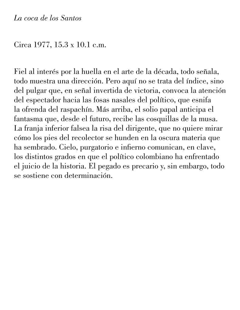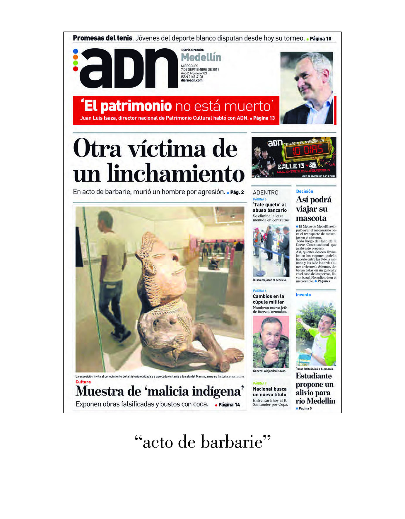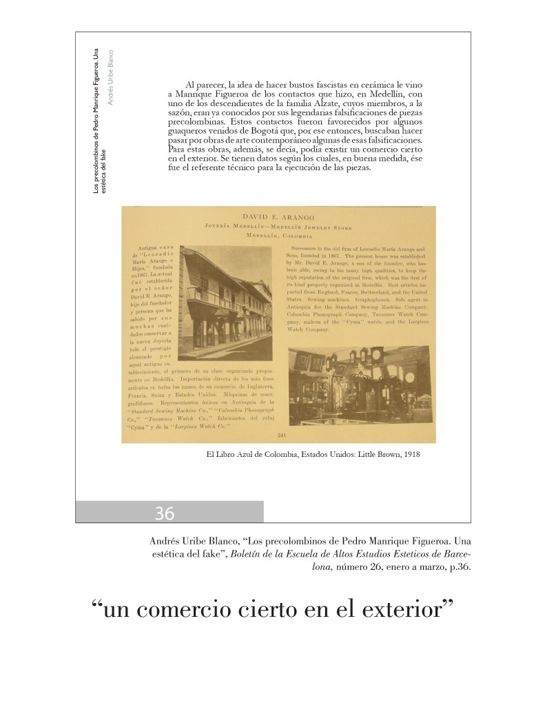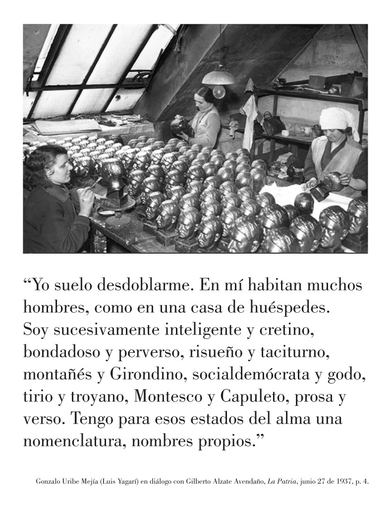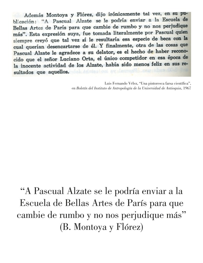 Fiel a este talante, donde nada es lo que parece, Malicia indígena, recipientes cerámicos de los Alzate y de Pedro Manrique Figueroa, la exposición que se inaugura en el MAMM el próximo 31 de agosto, vincula una serie de acontecimientos verídicos ocurridos en Medellín: la existencia de una colección de cerámicas precolombinas falsificadas por la familia Alzate a finales del siglo XIX y principios del XX, el Festival de Ancón en el municipio de Caldas en 1971, la realización del Primer Coloquio Latinoamericano de Arte No Objetual y Arte Público en 1981 y la aparición del fenómeno del narcotráfico a principios de la década del ochenta en todo el país. Un par de elementos, donde los límites entre realidad histórica y ficción se mezclan, vienen a completar el ya heterogéneo listado de elementos: la obsesión de Pedro Manrique Figueroa, el precursor del collage en Colombia, por el caudillo nacionalista Gilberto Alzate Avendaño (1910-1960) y el interés por las representaciones escultóricas de guras políticas internacionales del totalitarismo, como Hitler, Stalin, Mussolini, Franco.
