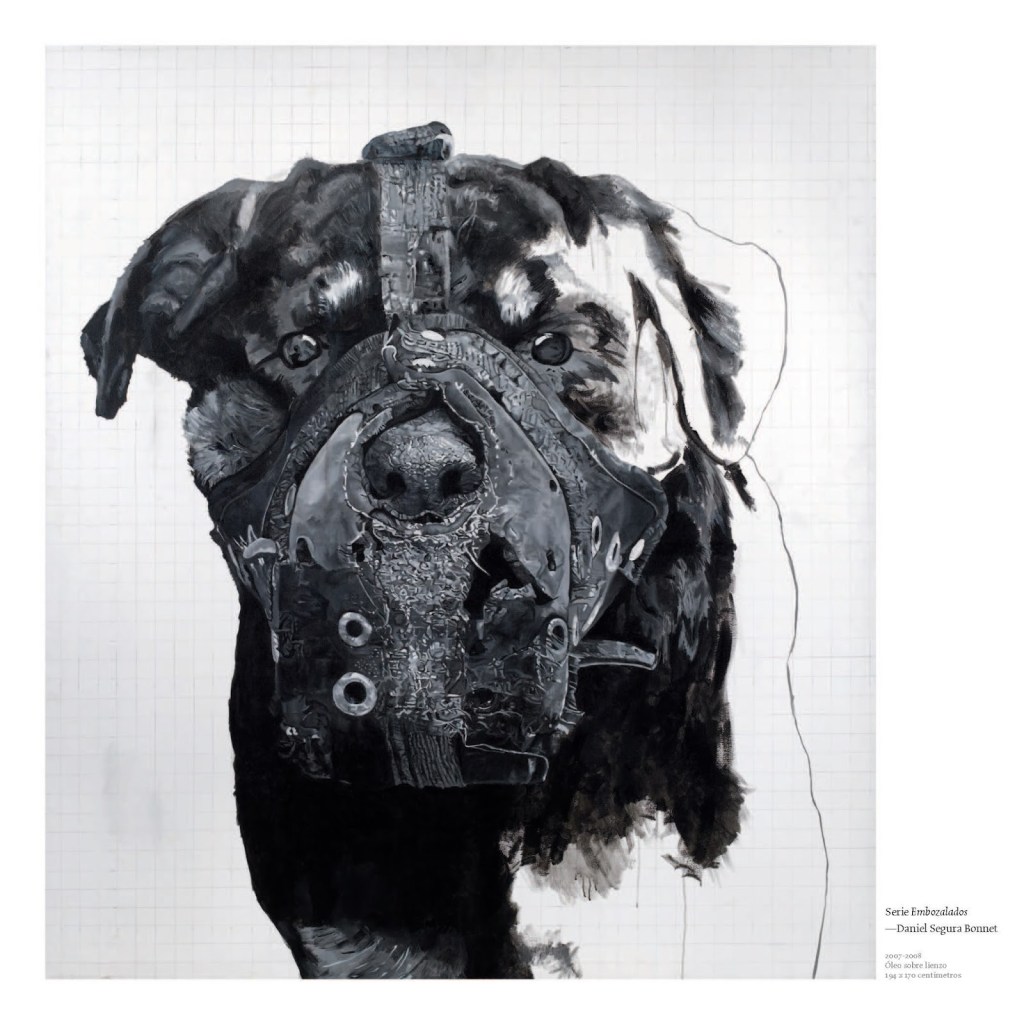 Fue así como empezaron a aparecer en sus pinturas y dibujos los perros rottweiler del esquema de seguridad de la institución. Daniel Segura había hecho un seguimiento visual y fotográfico de años al fenómeno inquietante de los perros embozalados, buscaba una imagen que mereciera ser mostrada; los ángulos, la luz, la composición, el marco justo que realzara una escena turbadora pero subrepticia.