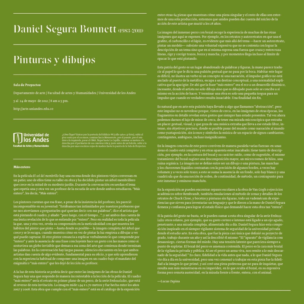 A la luz de esta historia se podría decir que entre las imágenes de las obras de Daniel Segura hay una que responde de manera incontestable a la lección de la película. El cuadro “más entero” sería el retrato en primer plano de un perro, de la serie Embozalados, que está al reverso de esta invitación. La imagen mide 1.94 x 1.70 metros y fue hecha entre los años 2007 y 2008. Esta obra que cumple con el “más entero” está en el catálogo de la exposición entre otras 64 piezas que muestran cómo una pieza singular y el resto de ellas son extremos de una sola producción, extremos que unidos pueden dar cuenta del núcleo de la
