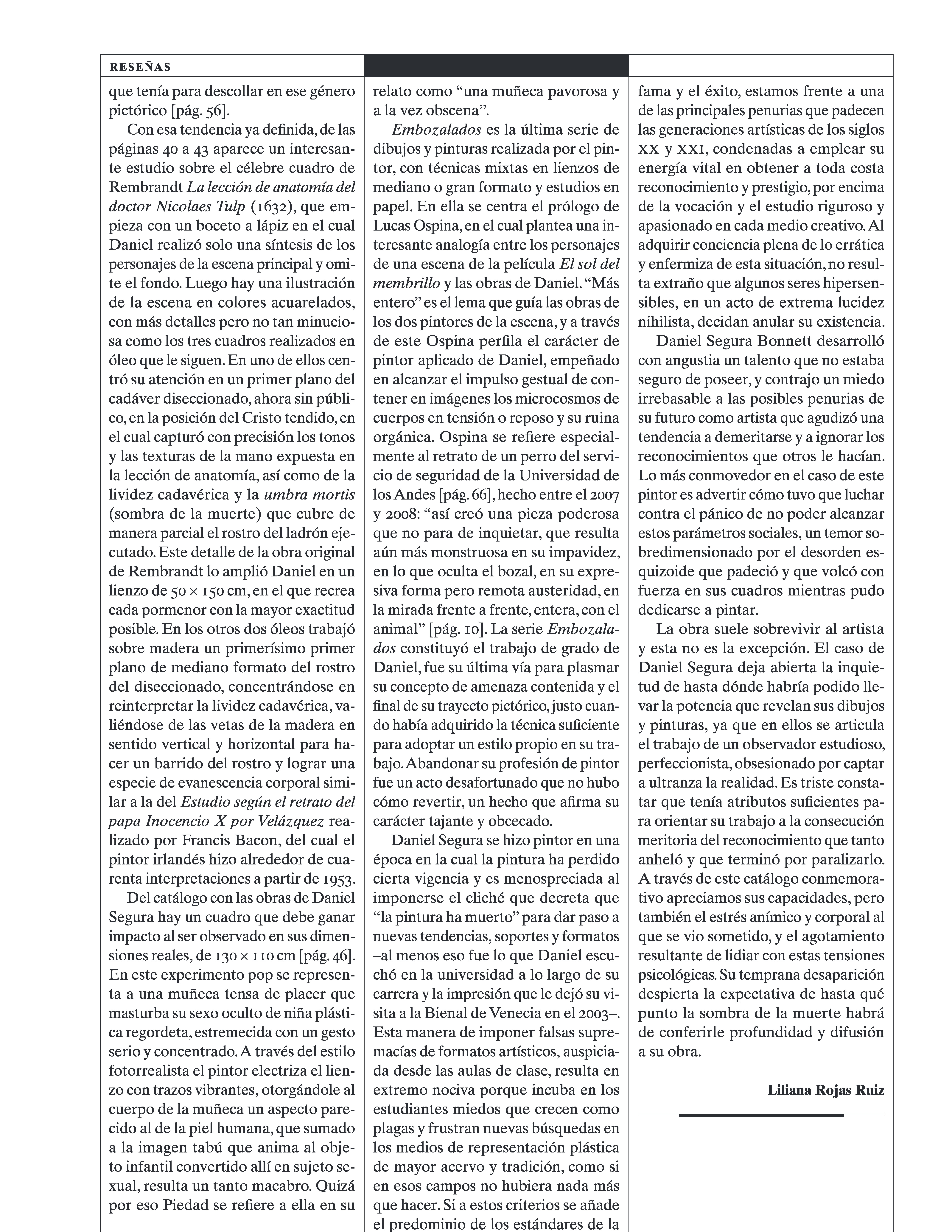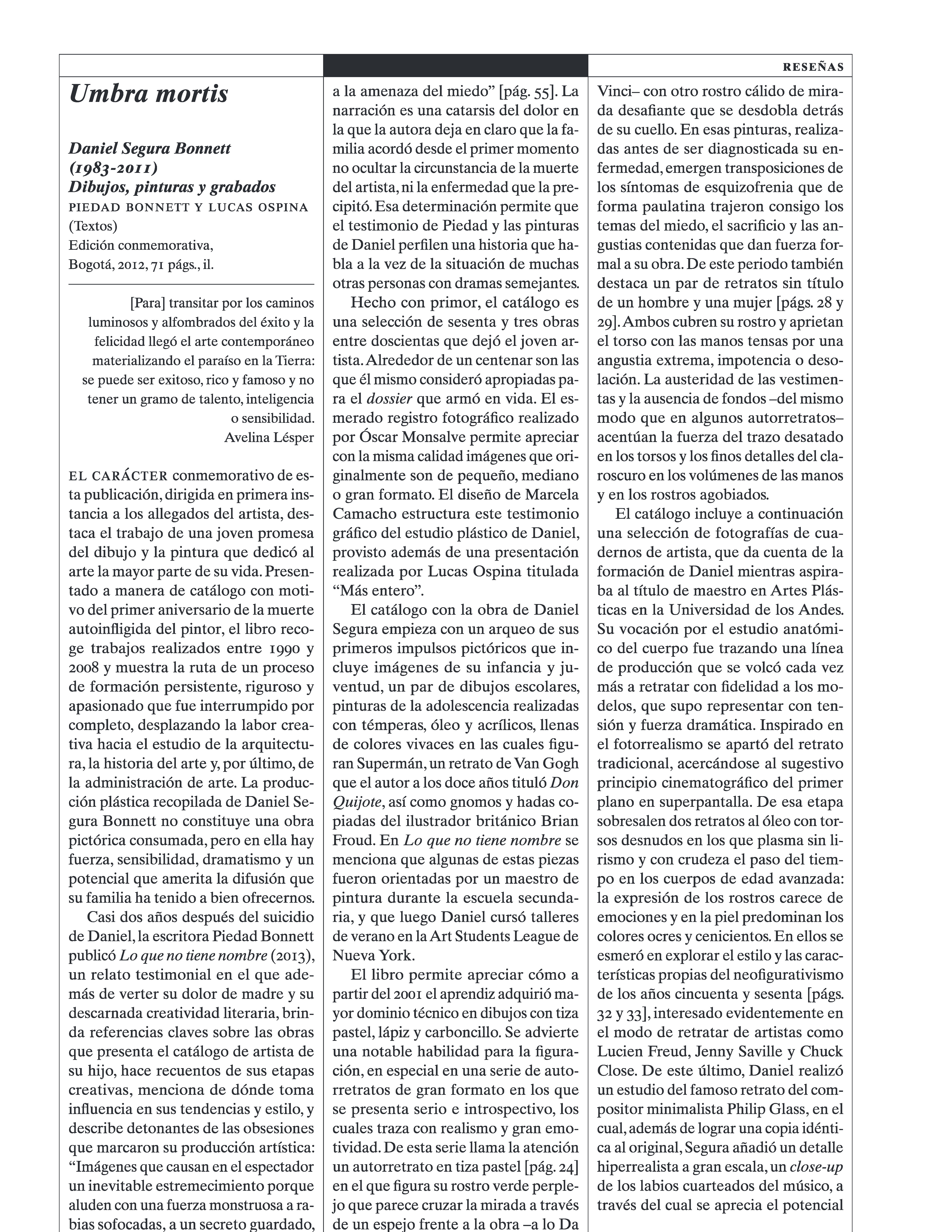 El joven artista murió a los 28 años, estudiaba en Nueva York, se lanzó al vacío desde un edificio. Antes había terminado arte en la universidad donde ahora expone. Su paso por este lugar también tuvo sus trámites y recovecos. En los primeros semestres se retiró porque, aunque le gustaban algunas clases, consideró que había poco énfasis en lo técnico. No desestimaba las materias donde picoteaban las canteras de Bajtín, Barthes, Benjamin, Berger, Bürger y compañía, pero sentía que mientras el arrume de fotocopias crecía, el tiempo para el ejercicio manual disminuía; los silogismos verbales que refinaban su capacidad crítica parecían sustituir el aprendizaje silencioso que da la experiencia, pasaba más tiempo leyendo sobre arte, haciendo trabajos y ejercicios para clases de arte, que viendo o haciendo arte.