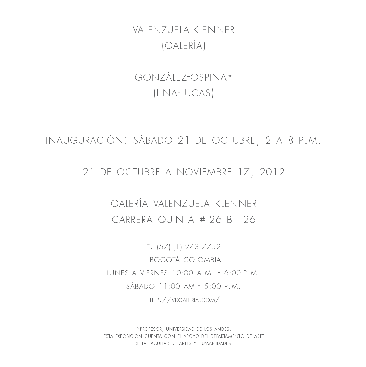 Cada piso de la galería se dividió en dos partes con una línea de tiza roza. El lado norte fue para Lina González. El lado sur para Lucas Ospina. En el momento del montaje cada artista llevó una serie de piezas (dibujos, pinturas, esculturas y collage) que montó en su espacio. El nombre de la exposición —Esta es la nostra (cosa)— fue tomado de un graffiti hecho en una de las puertas de la galería en los años ochenta, posiblemente un comentario a uno de los usos del edificio en esa época: el expendio de drogas ilegales.