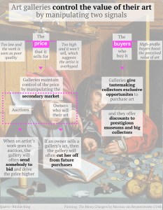 K, un artista emergente,hace dos piezas. El marchante A vende cada pieza a US$5.000 a B y C, dos coleccionistas prestigiosos. A se queda con el 50 por ciento de la venta y arregla con B y C para que oferten las piezas de K en una subasta. Antes de la oferta el artista se presenta en sociedad: K va con A, B y/o C, a inauguraciones y fiestas; un curador D, asociado a alguna institución, lo entrevista o firma un catálogo promocional con un texto genérico; publicaciones de arte en las que pautan galerías vinculadas a K, o con lazos con A, B y/o C, se referirán a él; circulará el rumor de que K estará en una curaduría colectiva en un museo donde solo exponen individualmente los consagrados.