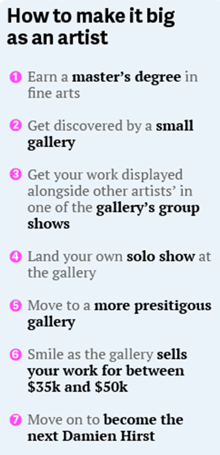 K, un artista emergente,hace dos piezas. El marchante A vende cada pieza a US$5.000 a B y C, dos coleccionistas prestigiosos. A se queda con el 50 por ciento de la venta y arregla con B y C para que oferten las piezas de K en una subasta. Antes de la oferta el artista se presenta en sociedad: K va con A, B y/o C, a inauguraciones y fiestas; un curador D, asociado a alguna institución, lo entrevista o firma un catálogo promocional con un texto genérico; publicaciones de arte en las que pautan galerías vinculadas a K, o con lazos con A, B y/o C, se referirán a él; circulará el rumor de que K estará en una curaduría colectiva en un museo donde solo exponen individualmente los consagrados.
