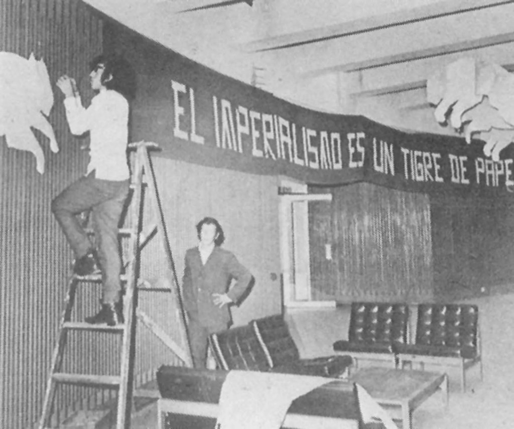 Usted está tocando un tema profundo. En ese momento [los años setenta] había un ambiente saturado en Bogotá con lo del arte político. Como datos históricos estaba Clemencia Lucena con una posición muy definida sobre esa temática y estaba el Libro Rojo de Mao Zedong. Había posiciones muy encontradas, actitudes, todas eran posiciones maniqueistas y yo estaba, ahora con esta distancia lo puedo decir, yo estaba sufriendo el problema y cuando se me ocurrió hacer esa solución, digamos, visual, grafica o formal del “imperialismo es un tigre de papel” me liberé de hacer algo correctamente político, algo fundamentado y algo definido o nítido y eso. Era una consigna que decía textualmente “el imperialismo es un tigre de papel” y yo hice, literalmente, un tigre de papel. Yo no sé por qué la gente se puso con tanta bobada, no tendrían mejor cosa que discutir y me atacaron, yo que no había hecho nada sino poner muy bonita una frase, muy importante y literalmente hacer un tigre de papel. A partir de esa expresión me liberé de lo correctamente político y creo en esa libertad que tienen los artistas.