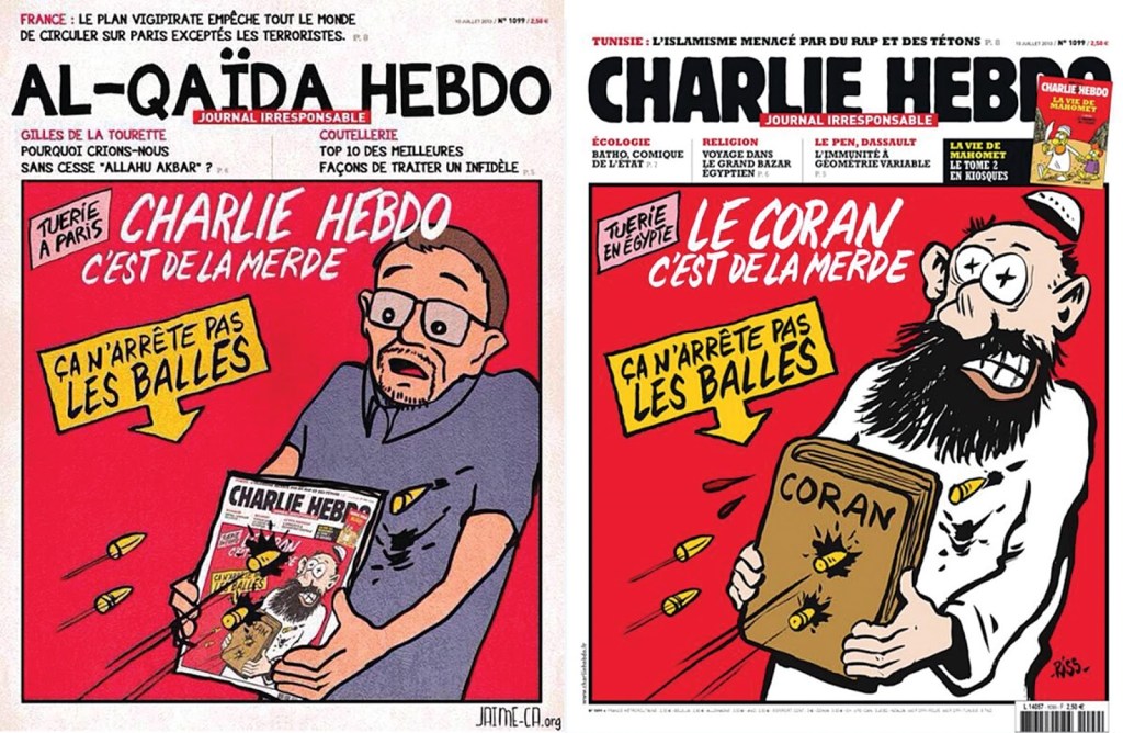 Por internet circula una sátira que satiriza una portada de Charlie Hebdo. En ella vemos a Stéphane Charbonier, el editor en jefe asesinado, que sostiene un ejemplar de su revista como escudo para intentar defenderse contra balas que lo atraviesan. La imagen canibaliza una portada previa del hebdomadario en la que un hombre, con un atuendo de musulmán, intentaba usar el Corán como defensa ante las balas. La frase de la portada original decía “El Corán es la mierda”, la frase de la sátira de la sátira reza: “Charlie Hebdo es una mierda”.