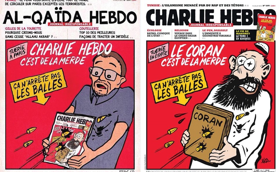 Por internet circula una sátira que satiriza una portada de Charlie Hebdo. En ella vemos a Stéphane Charbonier, el editor en jefe asesinado, que sostiene un ejemplar de su revista como escudo para intentar defenderse contra balas que lo atraviesan. La imagen canibaliza una portada previa del hebdomadario en la que un hombre, con un atuendo de musulmán, intentaba usar el Corán como defensa ante las balas. La frase de la portada original decía “El Corán es la mierda”, la frase de la sátira de la sátira reza: “Charlie Hebdo es una mierda”.
