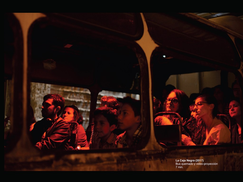 En el primer piso de la exposición de Carlos Castro en el espacio El Dorado está la carcasa de una buseta calcinada. El esqueleto metálico, en la mitad de una sala con condiciones de garaje, permanece bajo un nuevo cuidado: la puerta abre y cierra, los asientos se refaccionaron y, en el espacio entre la cabina del conductor y los pasajeros, se templó una tela blanca sobre la que se proyecta un video con un sonido que rodea toda la ruta. La función comienza, el mismo ayudante que le pide a los visitantes subir es quien cierra la puerta y activa el control que da comienzo a la función.