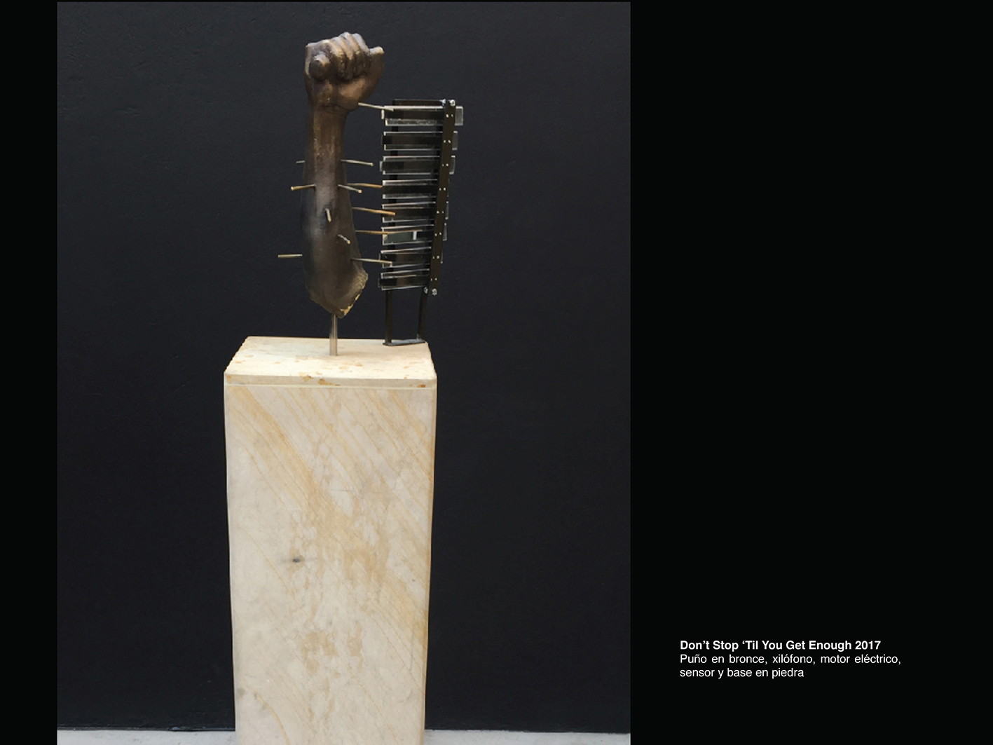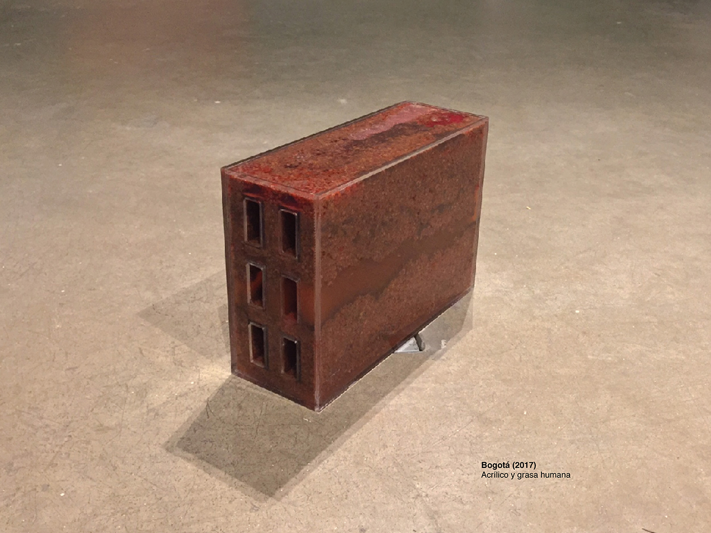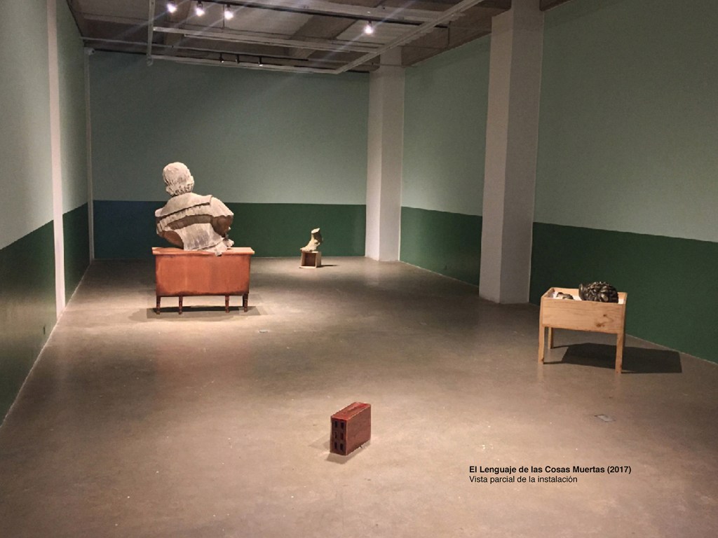 Cuando el video termina, el portero abre la puerta e indica que más adelante y en los pisos siguientes continúa la exposición. Antes de subir, en el nicho entre la escalera y la pared, hay una construcción hechiza: una caneca de petróleo cortada por la mitad donde reposa una gran cabeza de prócer, propia de la estatuaria pública, insertada en una varilla, un gran pincho que gira al ritmo lento del eterno retorno de lo mismo de los asaderos de pollo. La cabeza está bañada por el líquido oscuro y viscoso que contiene la caneca y moja a ese dinosaurio de la historia del país, al parecer se trata del busto de un hombre asesinado, ¿será el político Luis Carlos Galán (1989) o el comunero José Antonio Galán (1782)?