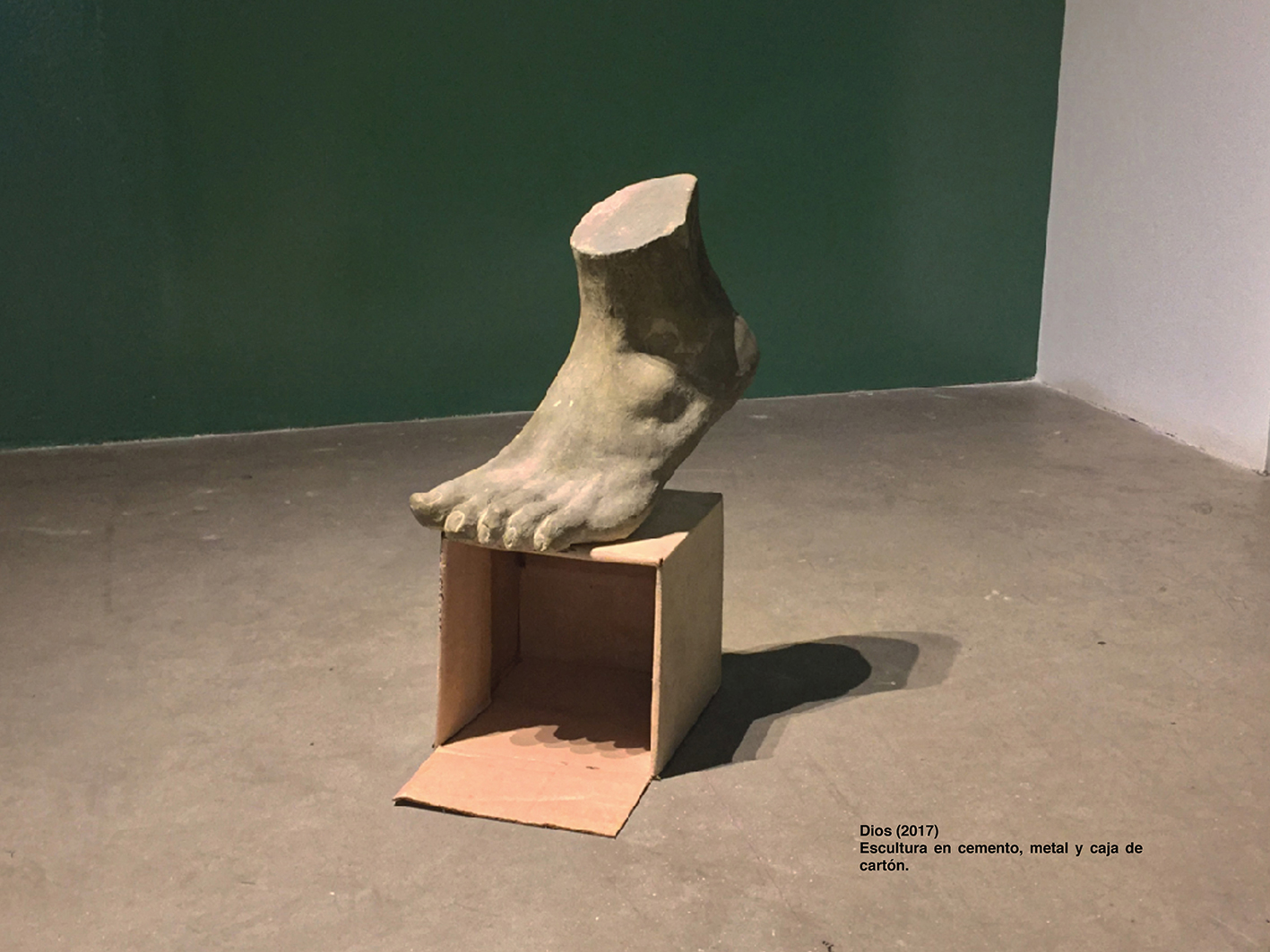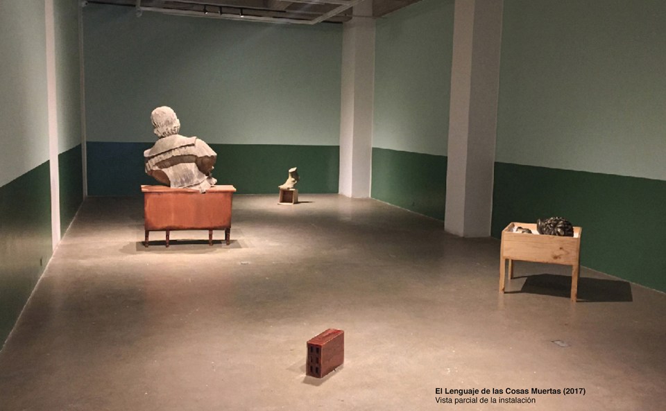 El lenguaje de las cosas muertas que muestra la exposición —en un video escolar, un conjunto de piezas y ensamblajes escultóricos con cabezas, manos y pies de talla mínima y monumental, una frase en latín que sangra tinta, una serie de pinturas, una cadena de vidrio llena de grasa humana— es la evidencia ruinosa de un pasado que nunca se fue. Es un lastre para el artista de cuarenta años que es Carlos Castro. Aquí están el perseguido y el perseguidor, y sus herramientas para enfrentar, engañar o desentenderse del tiempo devorado por aquello mismo que pretendía devorar.