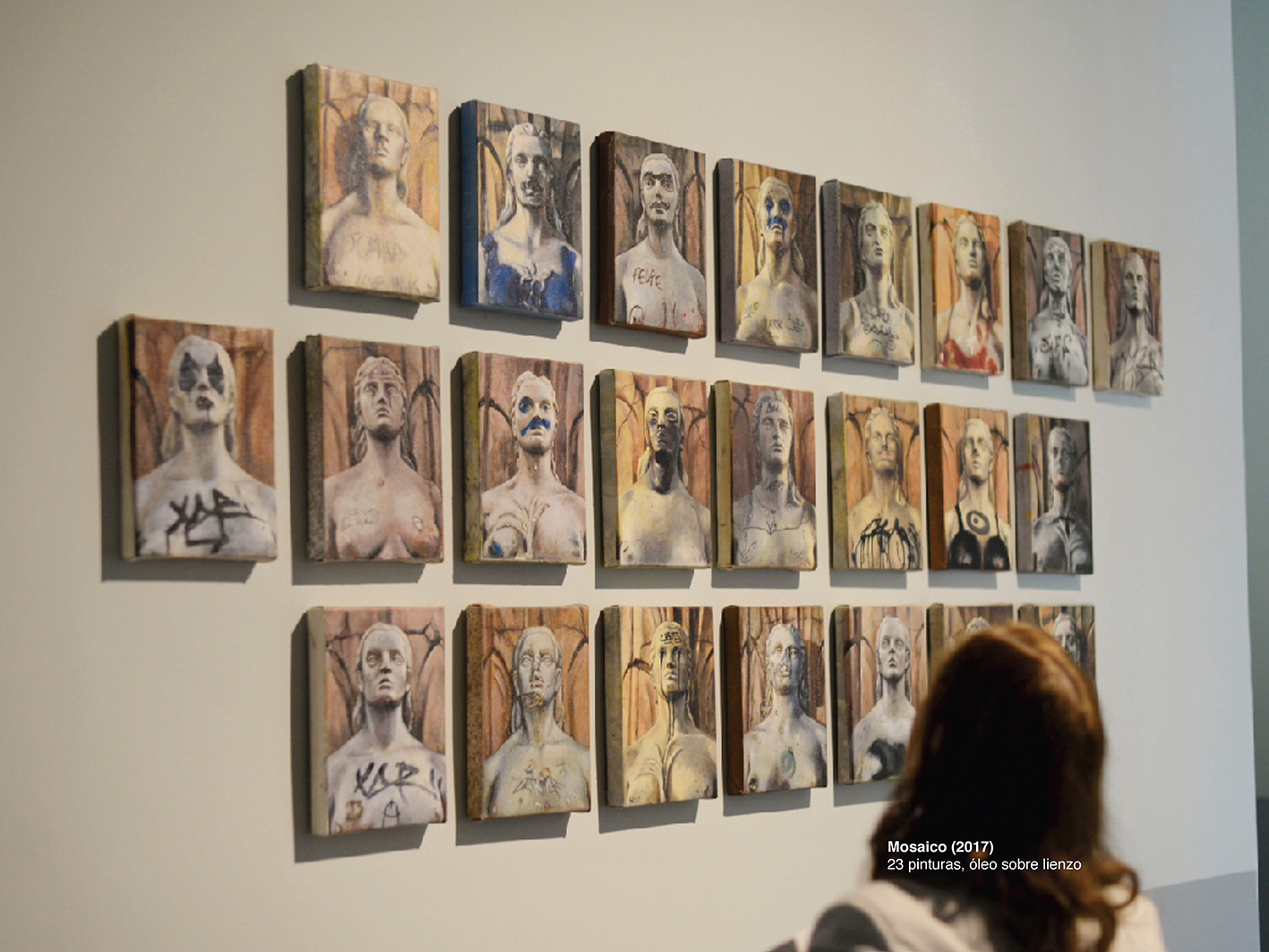Sí, la búsqueda puede ser difusa. Castro evade el proselitismo panfletario o el didactismo moral, se encierra en la forma como contenido y desde este enclaustramiento delata pequeños goces. En su técnica hay un trabajo artesanal que rehúye el automatismo virtuoso. En la exactitud y precisión de los ensamblajes hay un goce casi de joyero que trabaja al compas de la música metalera de los mecanismos internos y externos de sus piezas. Este placer también se manifiesta en lo pictórico, en la secuencia de 23 óleos pequeños trabajados a partir de fotografías de un monumento, el busto repetido de una india americana con facciones europeas que ha sido grafiteado y vandalizado, luego restaurado, vuelto a grafitear y vandalizar, y así por décadas.