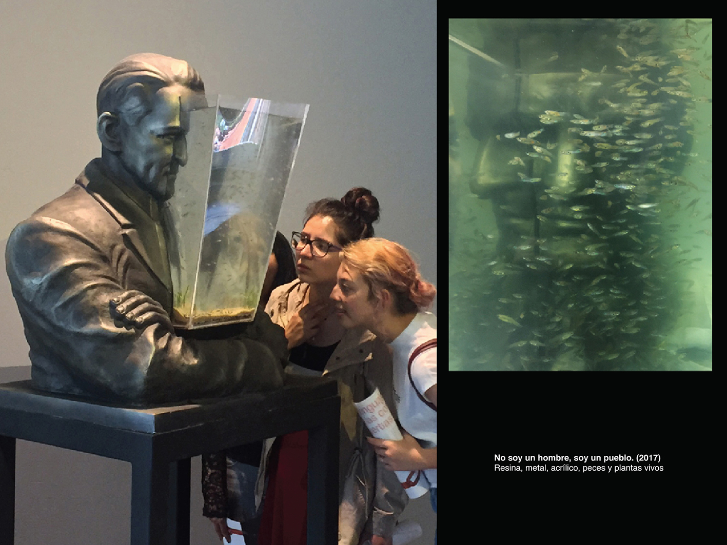 En Colombia podríamos sumar una variable adicional a la ecuación rusa, no solo se trataría de un pueblo “analfabeta, alcohólico y místico”, habría que añadir que es huérfano de padre. El país puede estar lleno de padres de la patria, pero en el orden femenino de la Constitución o de la ley, la fascinación por la figura patriarcal ausente tiene un alto valor emocional y, cuando el caudillo llega, su arraigo suple en la vida pública el vacío que se vive en lo privado. Esta explicación con ribetes sicoanalíticos es una caricatura que se escenifica en torno a la figura heroica de un caudillo popular al que se le perdona todo. Un padre con sus ascensos y sus caídas, sus verdades y sus mentiras, pero poderoso en su embrujo autoritario y que aún después de muerto —en vida real o política—, sigue como cadáver insepulto dominando la imaginación del país, tal como el Jorge Eliecer Gaitán de la exposición, en un acuario rectangular con peces diminutos, unos animalitos que chocan una y otra vez, lelos, contra el vidrio, mientras otros, tal vez muertos, flotan en el fondo.