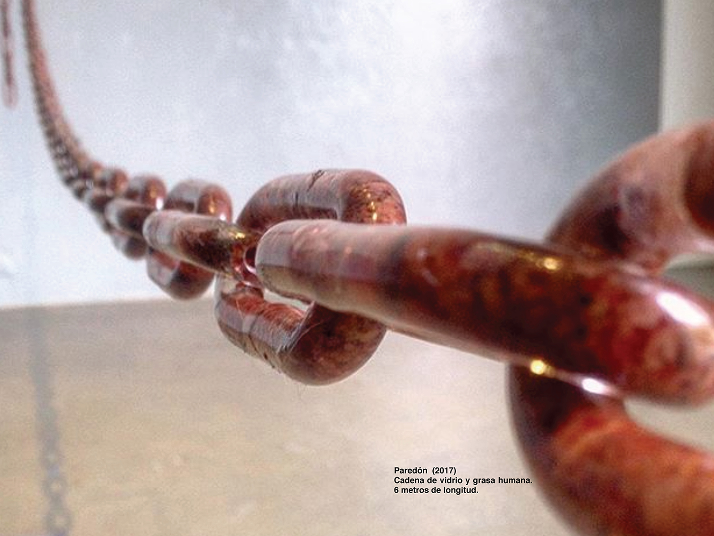 En el tercer piso de la exposición vemos un gran espacio, que remata contra una ventana que da a la Carrera Quinta, acordonado de lado a lado por una solitaria cadena de vidrio rellena de grasa humana; la unión es frágil, hay unas marcas en el piso que dictan una distancia sugerida para acercarse. En algunas partes hay señales menores de quiebres y remiendos. A la espalda de esta pieza hay un gran panel con los agujeros del calado de una frase en latín: Nova et Vetera (Nuevo y viejo). De las letras fluyen ríos y ríos de tinta.