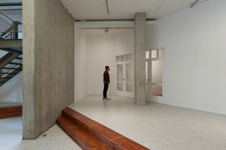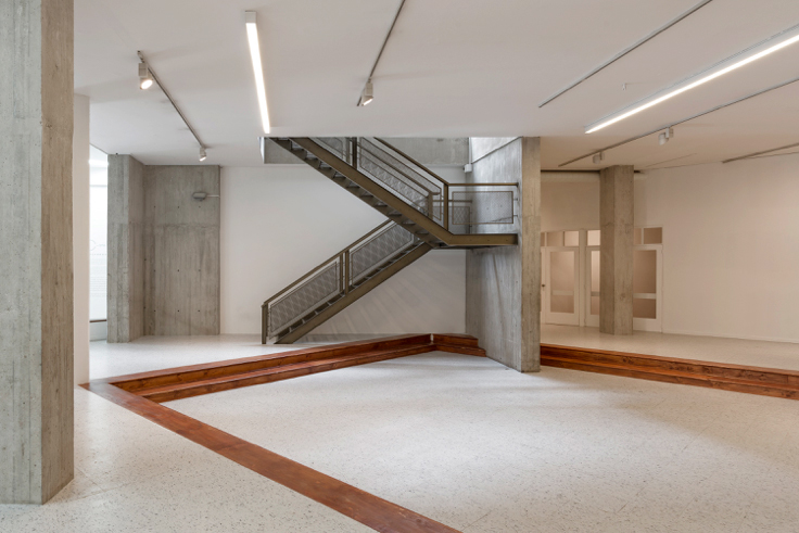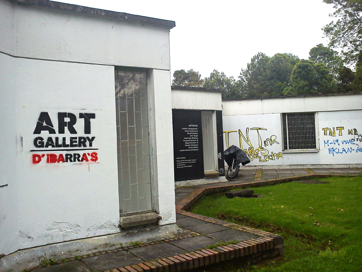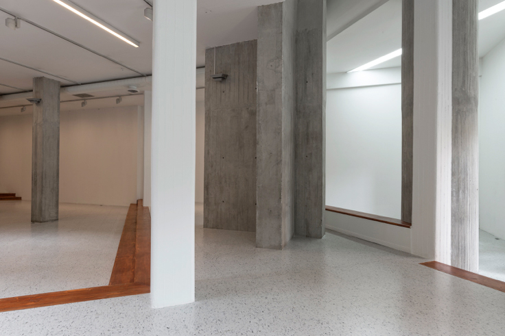 El otro lugar, el de NC-arte, es el espacio de un antiguo colegio al que solo se le dejó la fachada republicana como cascarón exterior. Adentro, su arquitectura es apenas estructural, sin correspondencia con los niveles y ventanas del fantasma de su antigua cara. Al interior sobresalen varios juegos de columnas en concreto crudo que marcan recorridos por un espacio generoso donde destacan blancas y altas paredes y una escalera metálica que lleva a una sala pequeña en el segundo piso y luego asciende hacia las oficinas.