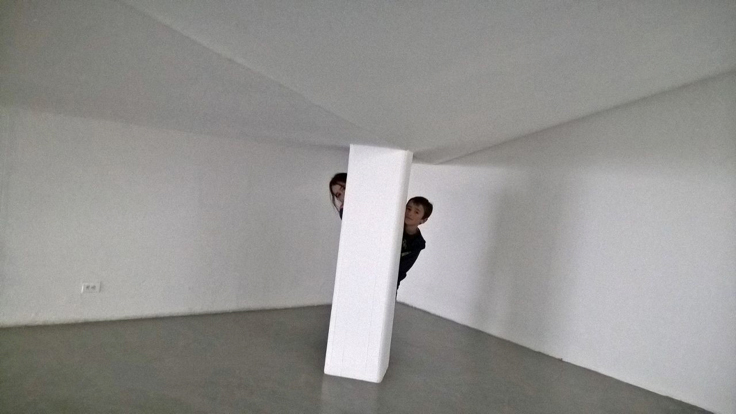 En la exposición, el vacío de ambos lugares no equivale a nada, al contrario, en el cruce de ambos espacios aparece una arquitectura extraña de puntos ciegos, pequeños cuartos accesibles e inaccesibles, una profusión de columnas, barreras y límites. Esto es claro en el segundo piso, donde el descenso dramático del techo —la representación escenográfica del límite superior del Museo de Arte de la Universidad Nacional— obliga a sortear la inclinación y a una sensación paradójica donde lo que se gana en altura —poder tocar el techo— implica un empequeñecimiento, pues hay que agacharse para recorrer el lugar y solo los niños pueden andar en esta maqueta de la finitud humana sin anticipar un golpe en la cabeza.