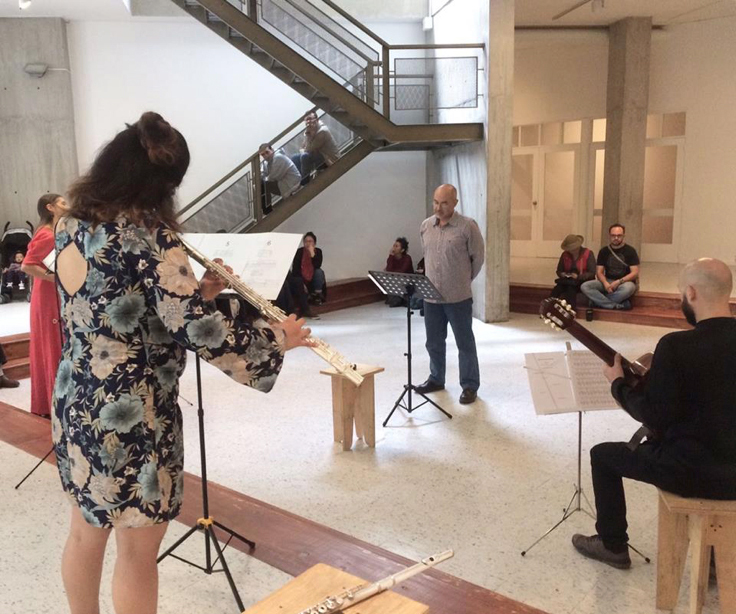 La música de la exposición es para seis tipos de instrumentos —flauta, clarinete, percusión, guitarra, violonchelo y voz—, y a los músicos se los convoca en diferentes combinaciones y horarios. Cada encuentro tiene un carácter único y diferente que responde a un sentido unitario en un tiempo y momento específico. Su práctica es aleatoria, hay experimentación y margen para improvisar. Las piezas son como un ensayo anterior a una pieza final que nunca llega, y evocan el carácter fragmentario propio de la música contemporánea donde la notación, ejecución, duración y repetición se ven atravesados por abstracciones, disonancias, complejos ritmos de capas y cambios bruscos de textura.