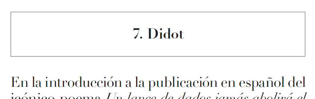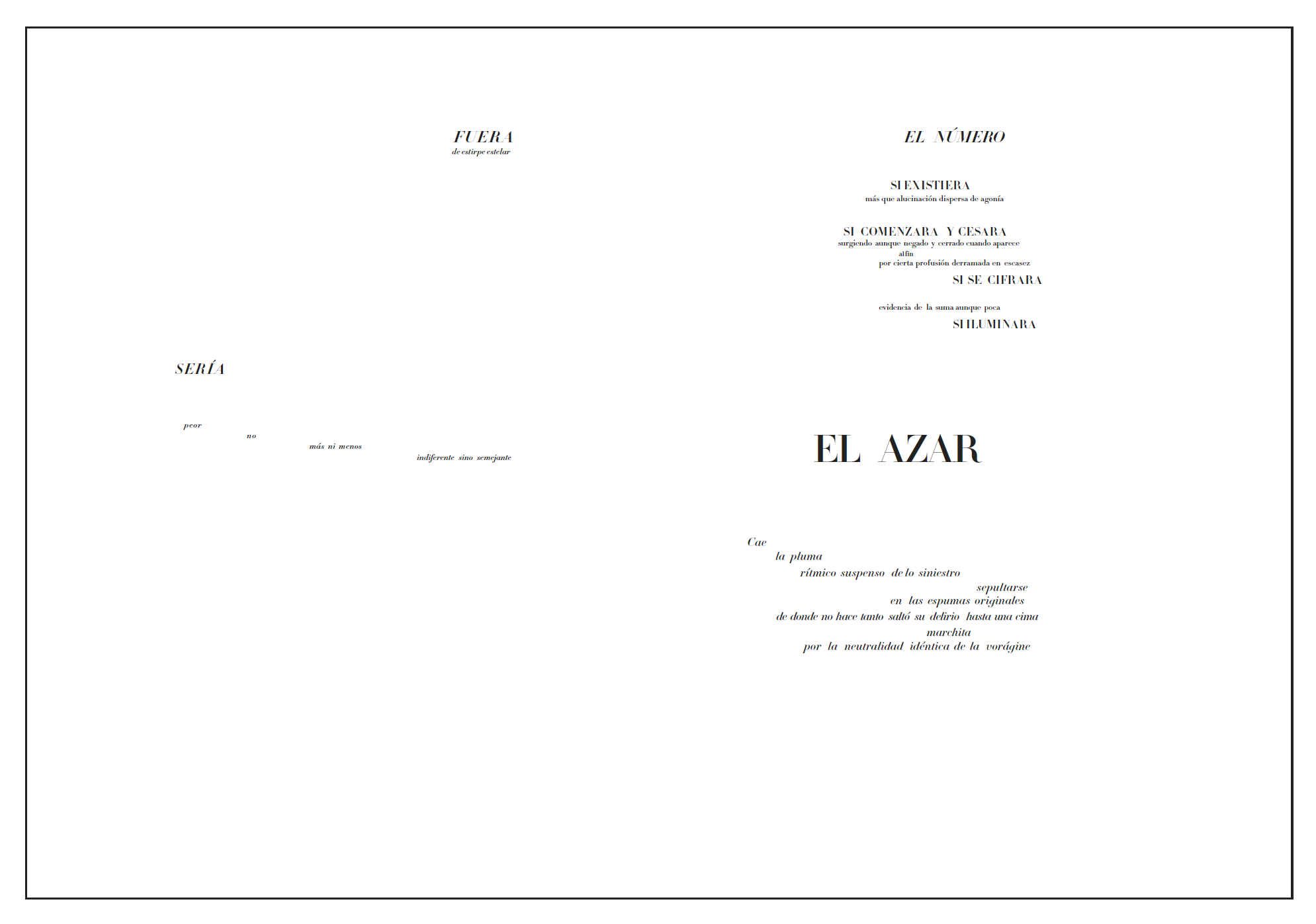 En la introducción a la publicación en español del icónico poema Un lance de dados jamás abolirá el azar, de Stephane Mallarmé, el escritor Samuel Bernal cuenta la historia del fracaso editorial de la primera edición de esta “música para los ojos” compuesta por el enigmático escritor francés. “Las ambiciones de Mallarmé eran mucho mayores”—dice Bernal— “Mallarmé se arremangó para hacer la labor de un artesano de los libros: él mismo, exhaustivo, propuso el diseño de los cuerpos tipográficos en Didot, sus diferentes caras y tamaños, y la distribución estricta del blanco en el pliego. Una íntegra lección inaugural —y revolucionaria— de tipografía expresiva. El espíritu del libro moderno se manifiesta por vez primera: la tipografía se vuelve un medio de expresión de alto valor; los blancos de la página son “palabras” inmensas; dos páginas forman una sola —como si fuera una pantalla de cine—.
