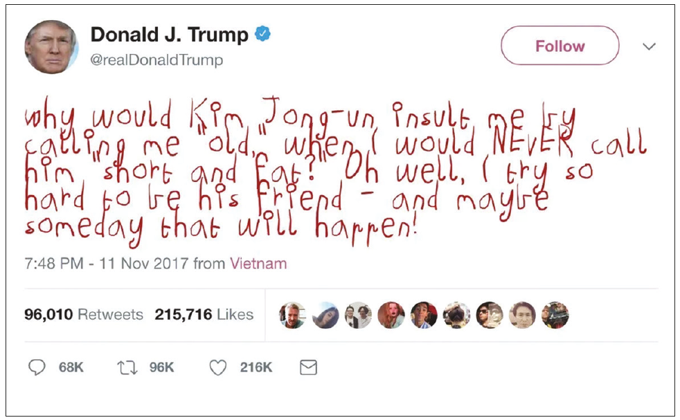 El Daily Show, un programa de comedia de la televisión estadounidense, puso en el dominio público una aplicación para el navegador Chrome: el hackeo permite leer los trinos del presidente número cuarenta y cinco de los Estados Unidos en caracteres mamarrachos que evocan el carácter tiránico e infantil del mandatario: