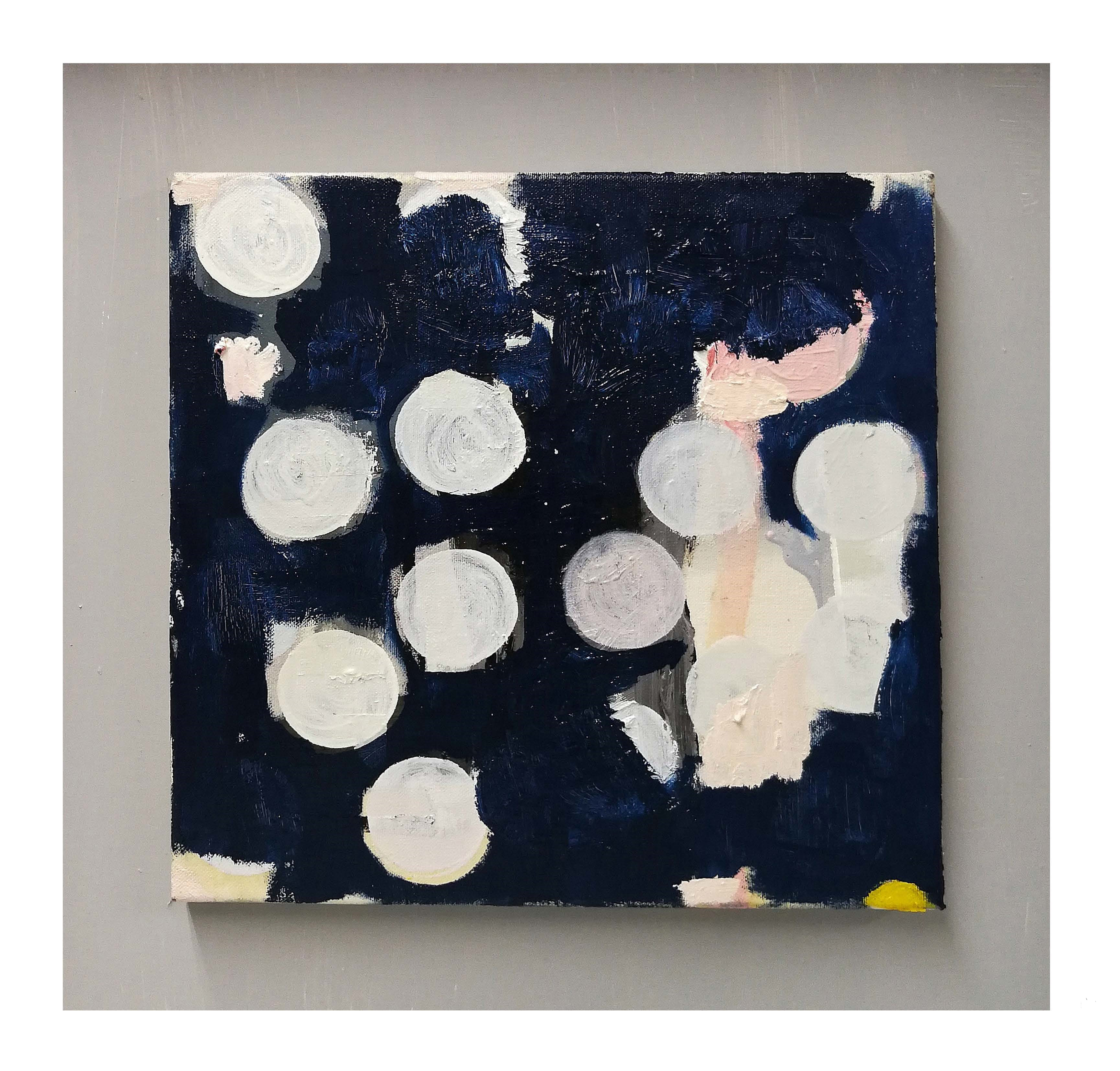 Artistas conceptuales como On Kawara y Daniel Buren también tenían eso de que ya sabían siempre qué iban a hacer. De mucho tiempo atrás. Fechas el uno y rayas el otro. Bueno, On Kawara hasta que se murió, y Daniel Buren hasta que cambió sus rayas verdes por los frondios vitrales de colores que nos dejó y que ni siquiera se atrevió a recoger. Lucas parece establecer ciertas reglas básicas para sus proyectos: eróticos en acuarela, individuales en pincel negro, cocteles en gran formato, políticos con seudónimo. Los que nos ocupan hoy son cuadros, cuadros cuadrados, pequeños, directamente sobre la tela. Dejando un margencito, aplica, cubre, raya y pone manchoncitos redondos, manchoncitos ovalados. Varias bolitas esta vez.