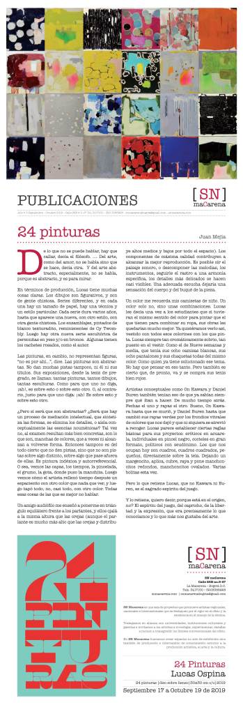 Las pinturas, en cambio, no representan figuras, “no es por ahí…”, dice. Las pinturas son abstractas. No dan muchas pistas tampoco, ni él ni sus títulos. Sus exposiciones, desde la tesis de pregrado, se llaman: tantas pinturas, tantos dibujos, tantas esculturas. Como para que uno no diga, ¡ah!, es sobre esto o sobre esto otro. O, al contrario, justo para que uno diga: ¡ah! Es sobre esto y sobre esto otro.