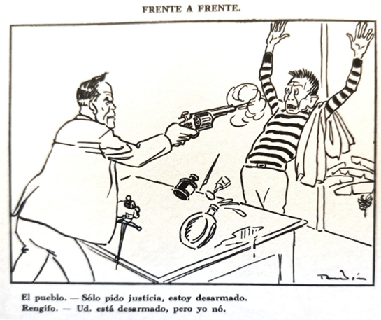 [Ricardo Rendón, «Frente a frente», Álbum de caricaturas. Bogotá, Editorial de Cromos, 1928]