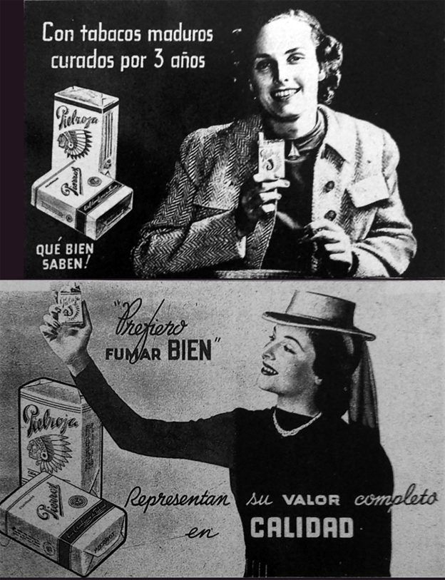 En paralelo a la inmensa imagen del Pielroja en letreros de neón, afiches y calendarios, hubo sucesivas campañas de afiches, algunos encargados a agencias suizas con modelos rubias, para dotar de un aura de glamur a esta marca, como un pitillo que, a pesar de no tener filtro, era amable con el pulmón femenino en una época en que estaban apagadas las alarmas del cáncer y fluían sin cortapisas los engaños de la poderosa industria tabacalera.