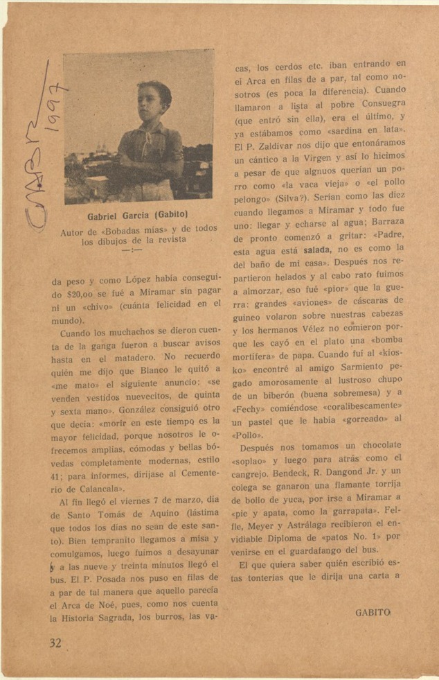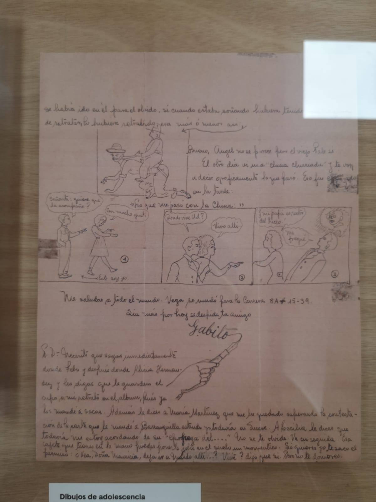 Pero una particularidad de García Márquez, que deja ver la exposición Todo se sabe: el cuento de la creación de Gabo en la Biblioteca Nacional, es que nunca separó completamente las imágenes de las palabras. Lo evidencian sus dibujos juveniles: en 1941, a los catorce años, García Márquez creó toda una revista colegial en la que ilustró todos los textos, trazó mapas de geografía bocetados y portadas que integraban gráfica y titulares caligráficos por vías de la fotomecánica de la época.
