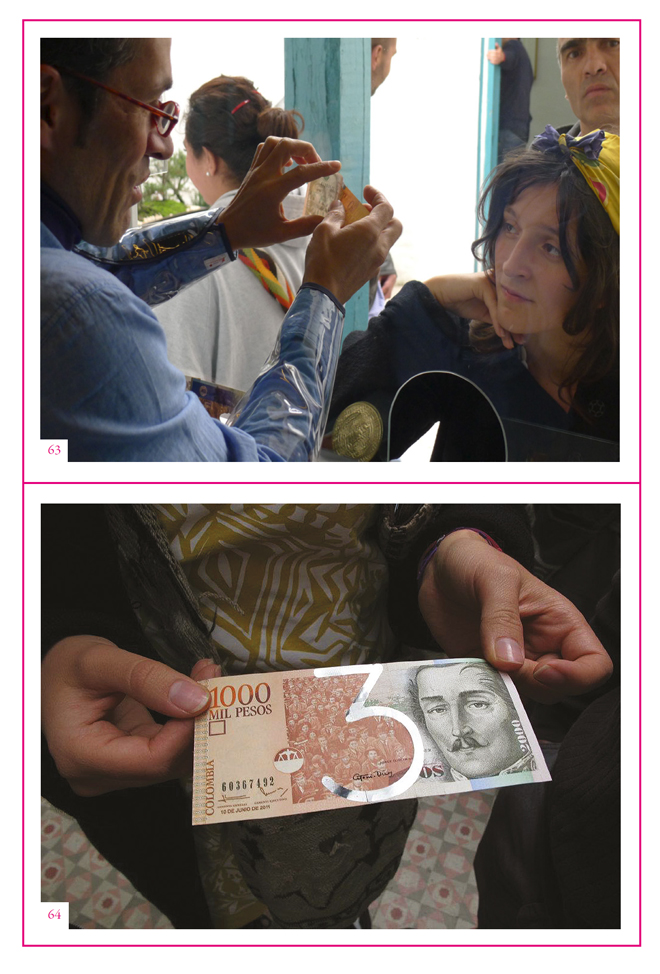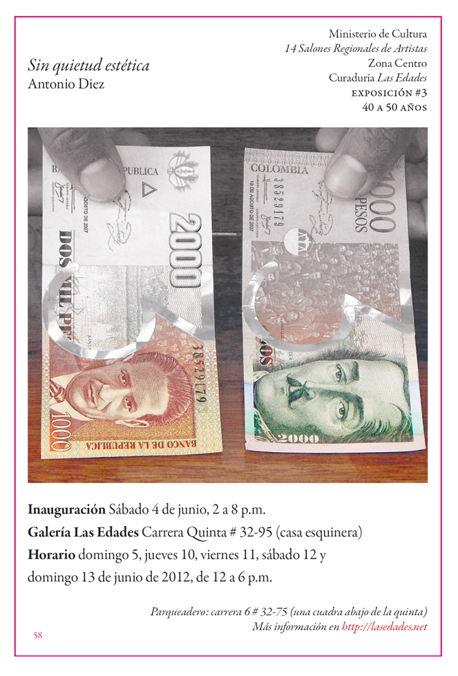 El artista ha fracasado, una y otra vez, en sus intentos por acceder a la fama, a la fortuna y al reconocimiento del valor de su trabajo: ha sido estafado por colegas o patrones, se ha empleado pintando fachadas y cuadros por encargo, ha vendido pinturitas de flores en galerías no reconocidas por la glamorosa escena artística, ha cuidado casas, ha plantado plantas, ha hospedado perros en el patio de su casa, que hoy está a punto de ser demolida, etcétera. El artista ha andado en bicicleta, ha debatido públicamente, ha perdido pleitos, ha pintado flores, paisajes, vanitas y yipaos ha querido dinero, ha odiado el dinero, ha roto el dinero y ha hecho un nuevo dinero: un dinero inútil y falso con cuya falsedad ha comerciado impunemente. En conclusión, el artista, este artista llamado Antonio Díez, ha vivido de sus peleas, de sus pasiones, de sus carencias y de sus pérdidas. O quizás, más exactamente, el artista ha vivido de hacerle el quite a sus pérdidas, apasionándose con modestia, ocupando el tiempo en actividades ajenas a ese mundo de fantasías propias de quien hace “carrera” como “artista” y, como lo ha hecho con los billetes, ha intentado sacar provecho del comercio de esas cosas que son su vida y que él ha empezado a pasar impunemente como arte junto a otras que, como arte, han tenido poca fortuna en el medio artístico.