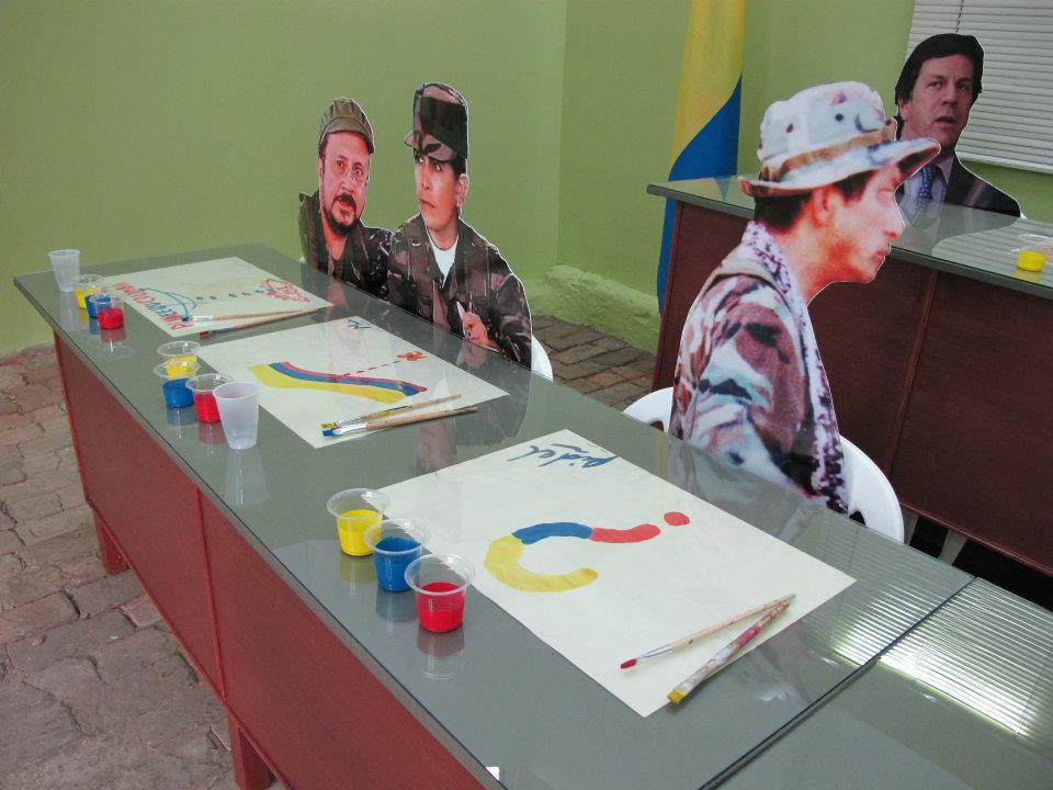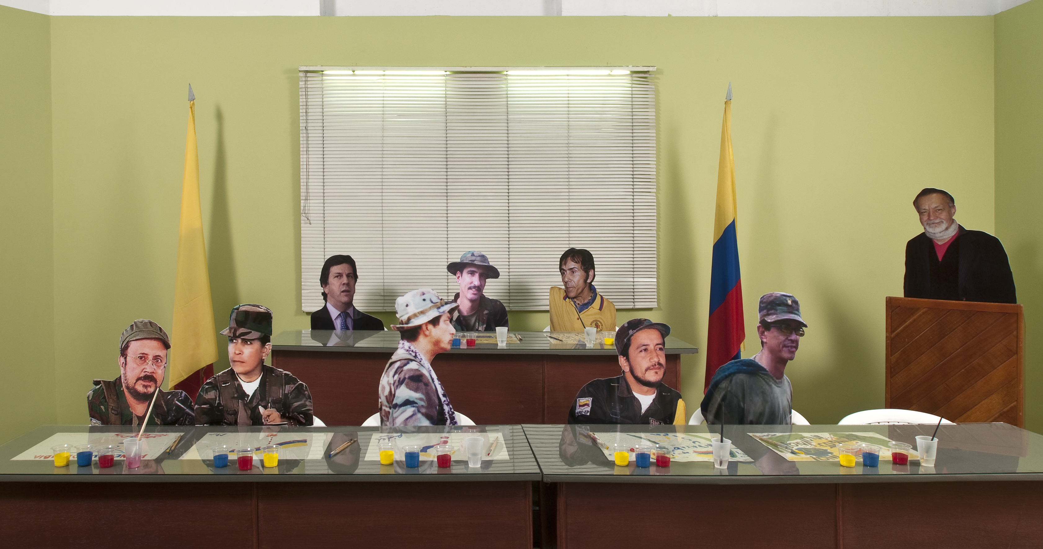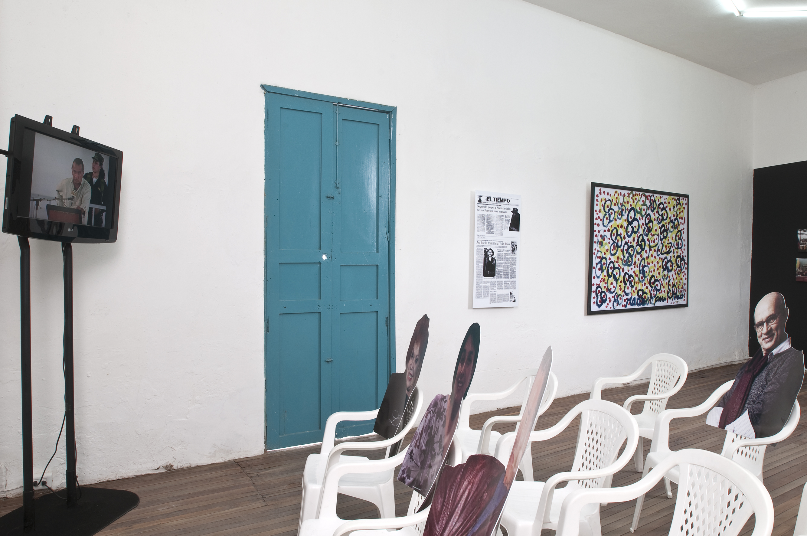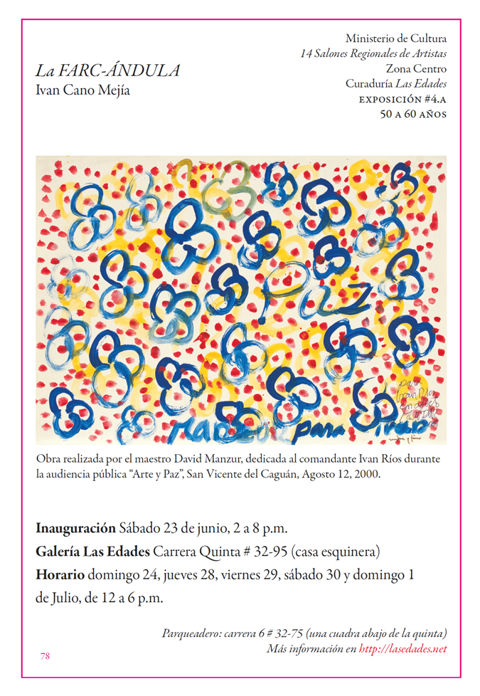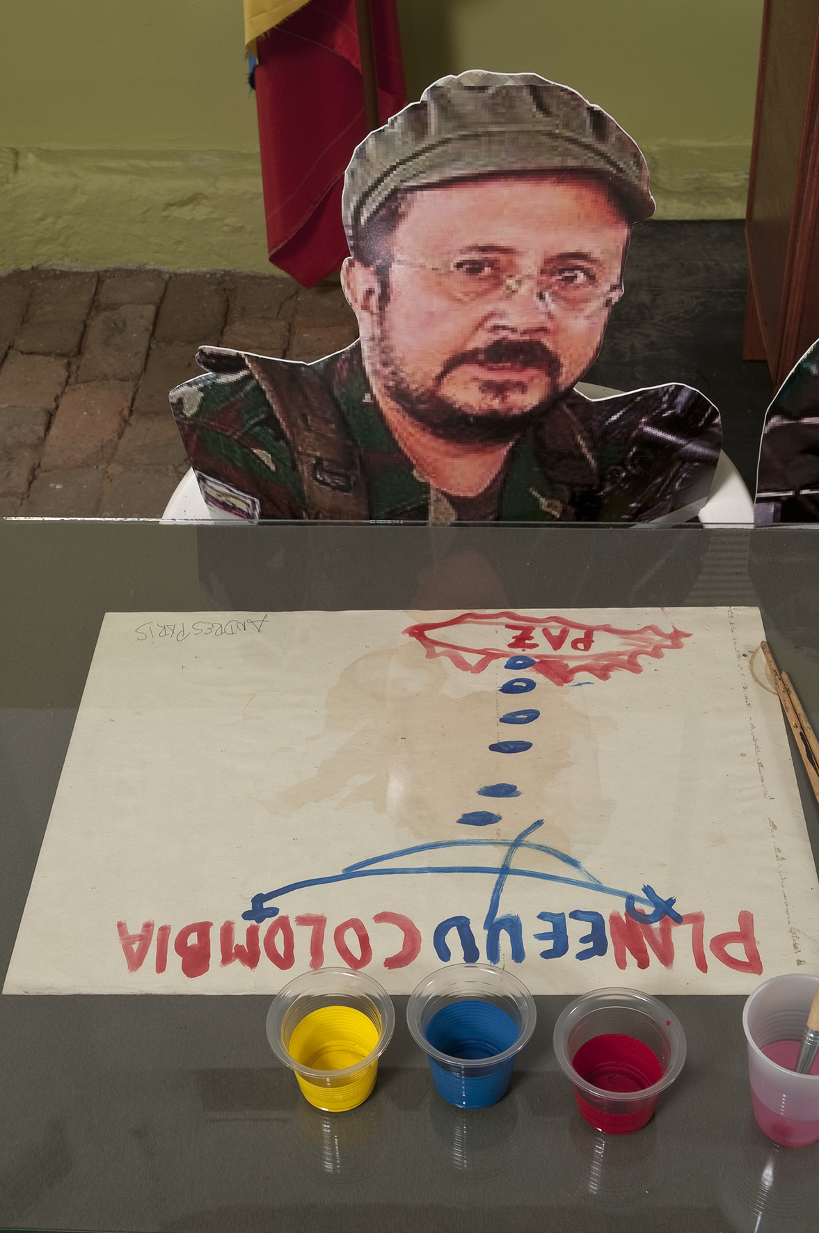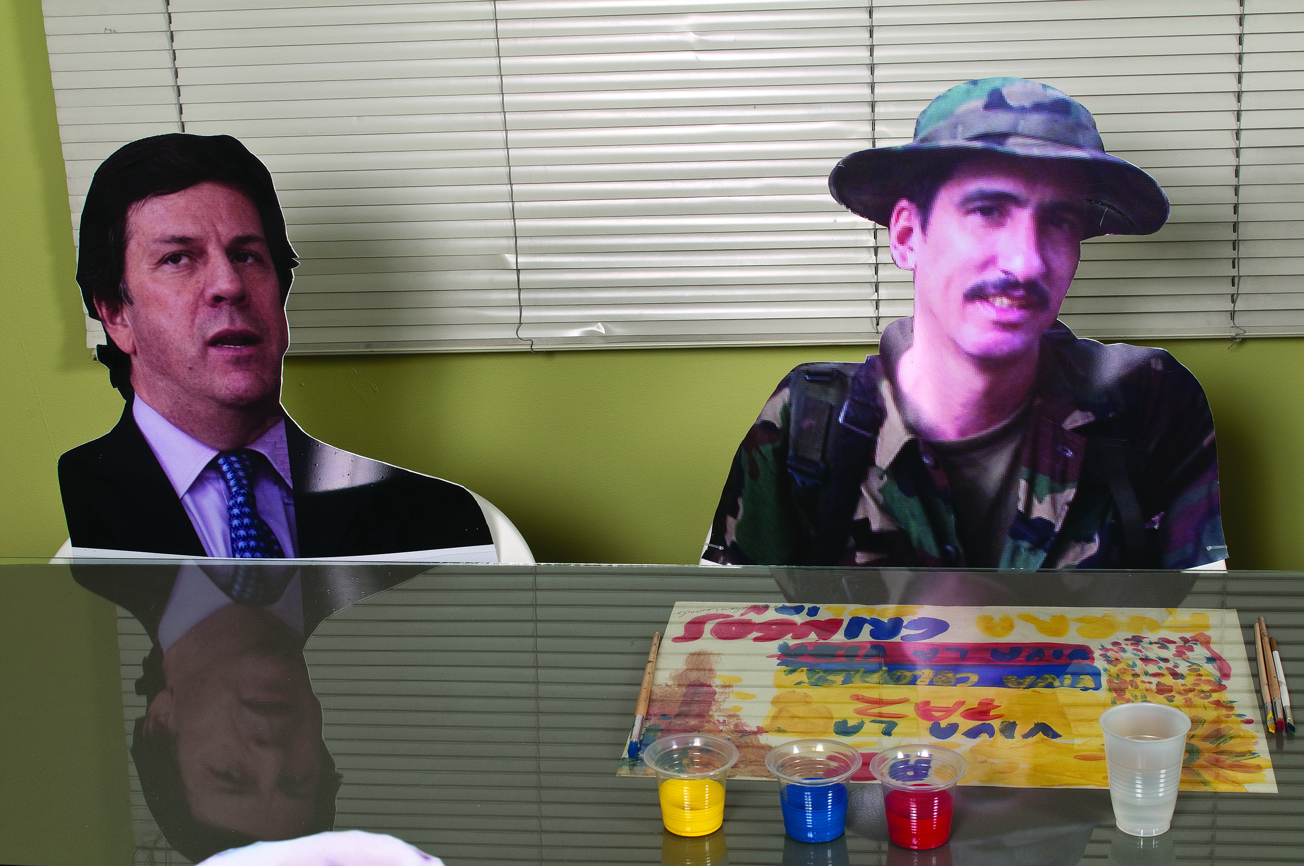 Dos salas donde predominan las sillas de plástico baratas, los colores de la bandera colombiana y la imagen del artista David Manzur (en el plotter de un cartón que pintó, en ocho fotografías, en video). Un proyecto de Iván Cano Mejía, que decidió asistir en agosto de 2000 como representante de una organización de artistas a las mesas de diálogo convocadas durante las negociaciones de San Vicente del Caguán. Llegó, habló con la guerrillera encargada de organizar el capítulo de cultura. Le dijo que había llevado una actividad. Ella lo escuchó y aceptó: cada humano sentado en la mesa principal recibiría 1/4 de papel y vinilos amarillo, azul, rojo. No debían preocuparse por los pinceles; de lo que sí, era de saber qué hacer con lo que les habían dado.