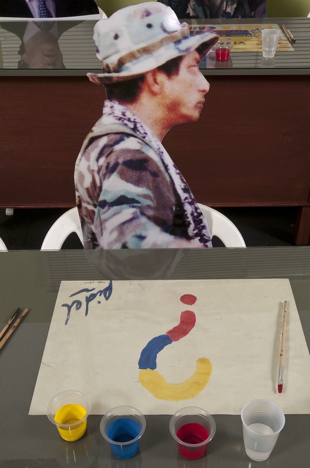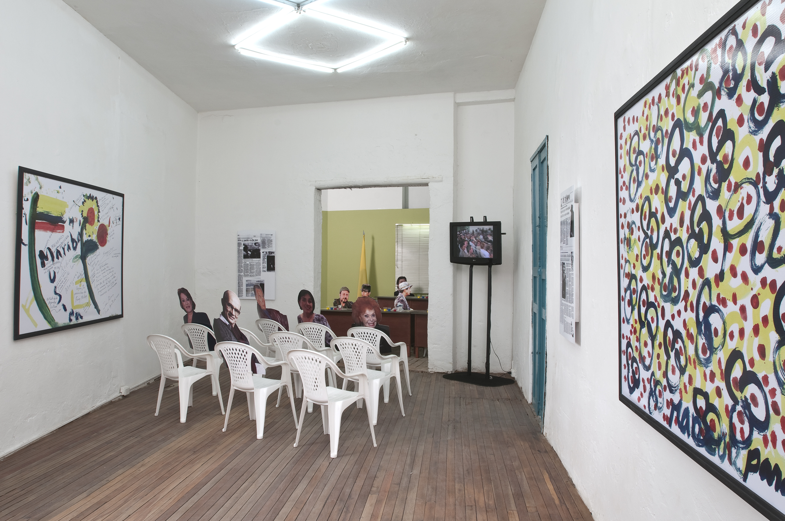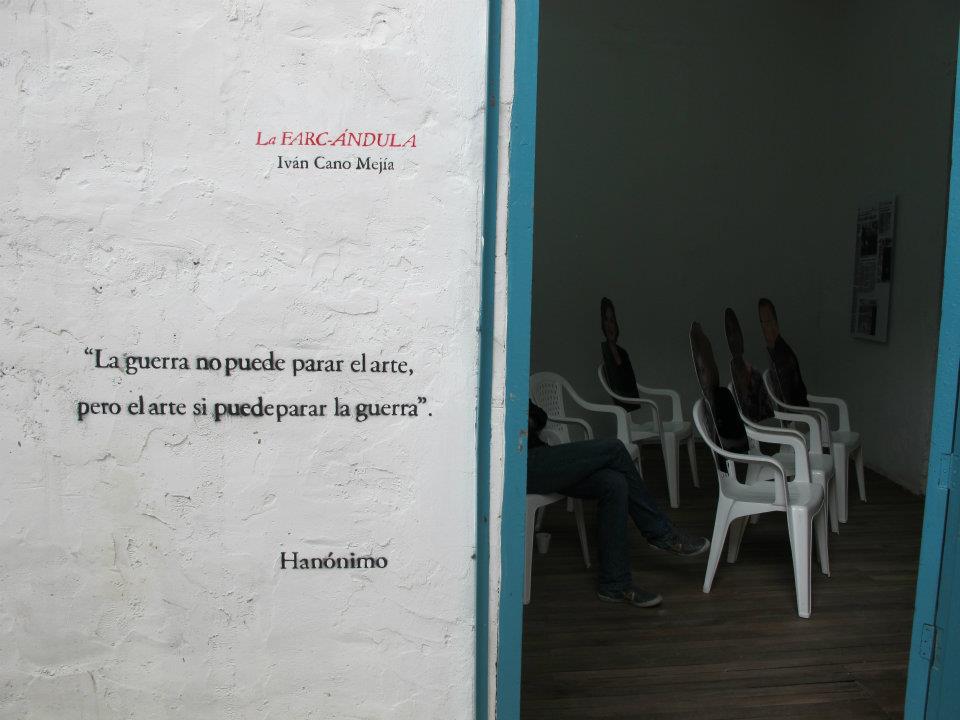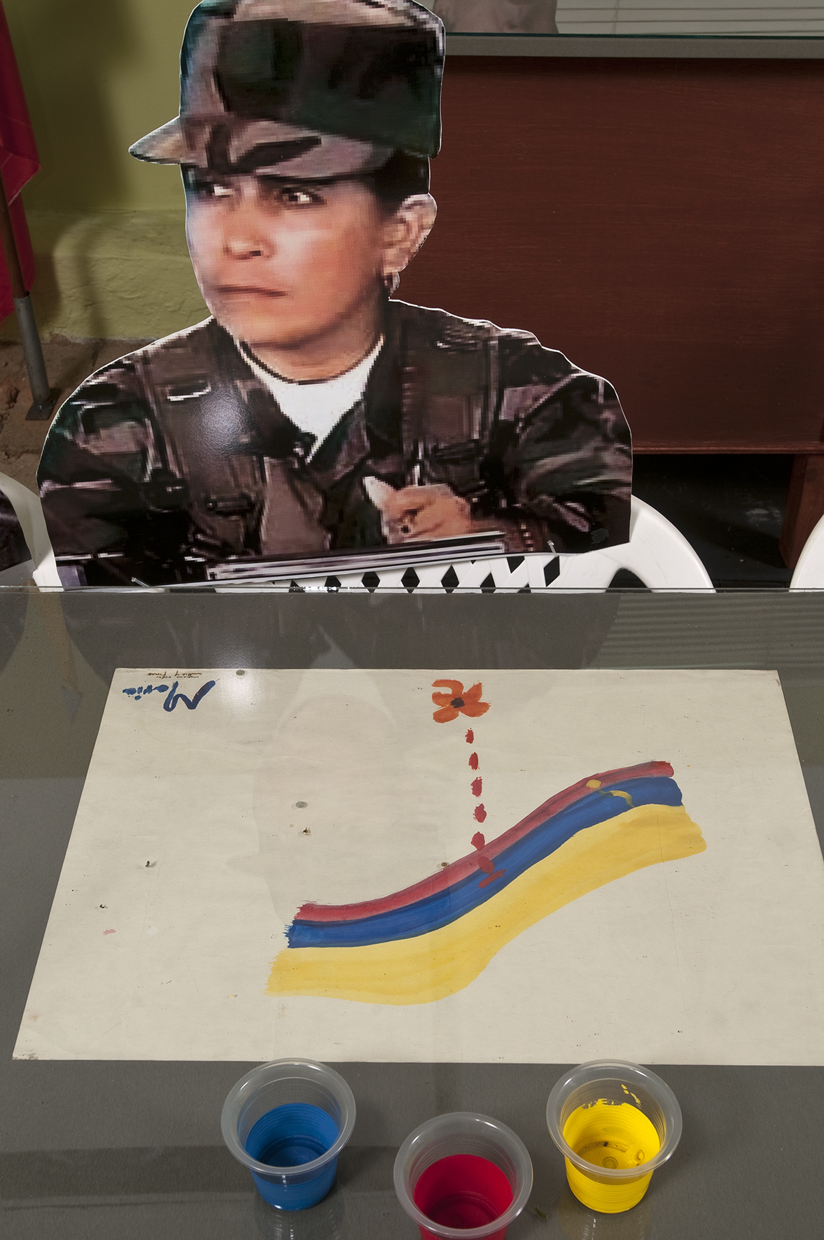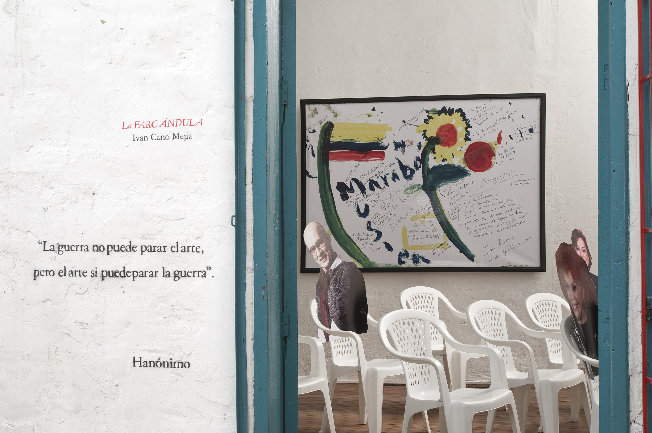Dos salas donde predominan las sillas de plástico baratas, los colores de la bandera colombiana y la imagen del artista David Manzur (en el plotter de un cartón que pintó, en ocho fotografías, en video). Un proyecto de Iván Cano Mejía, que decidió asistir en agosto de 2000 como representante de una organización de artistas a las mesas de diálogo convocadas durante las negociaciones de San Vicente del Caguán. Llegó, habló con la guerrillera encargada de organizar el capítulo de cultura. Le dijo que había llevado una actividad. Ella lo escuchó y aceptó: cada humano sentado en la mesa principal recibiría 1/4 de papel y vinilos amarillo, azul, rojo. No debían preocuparse por los pinceles; de lo que sí, era de saber qué hacer con lo que les habían dado.