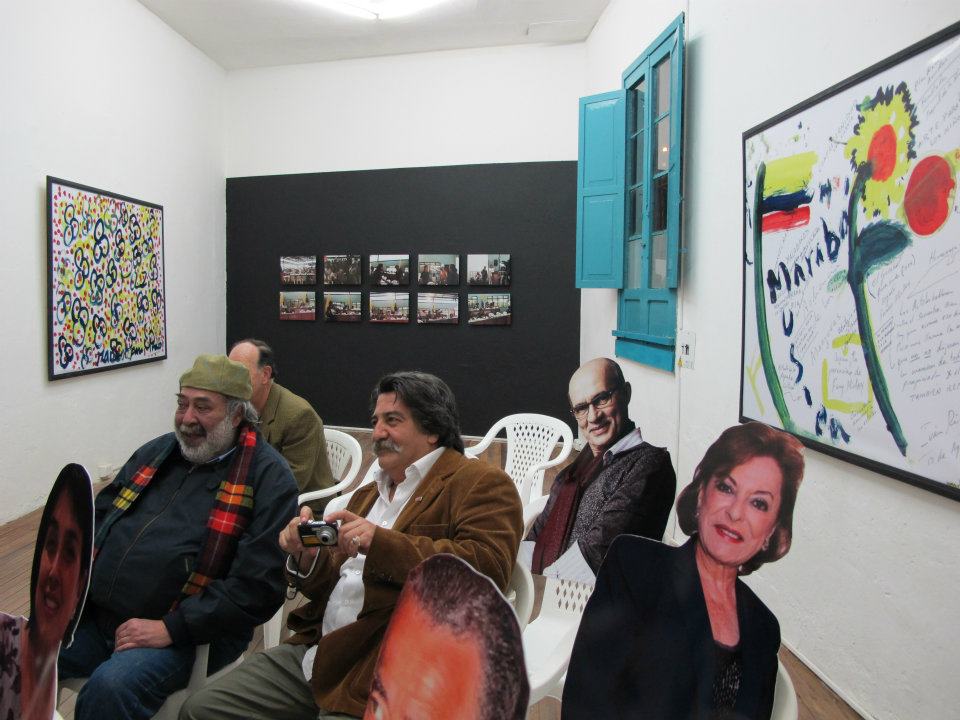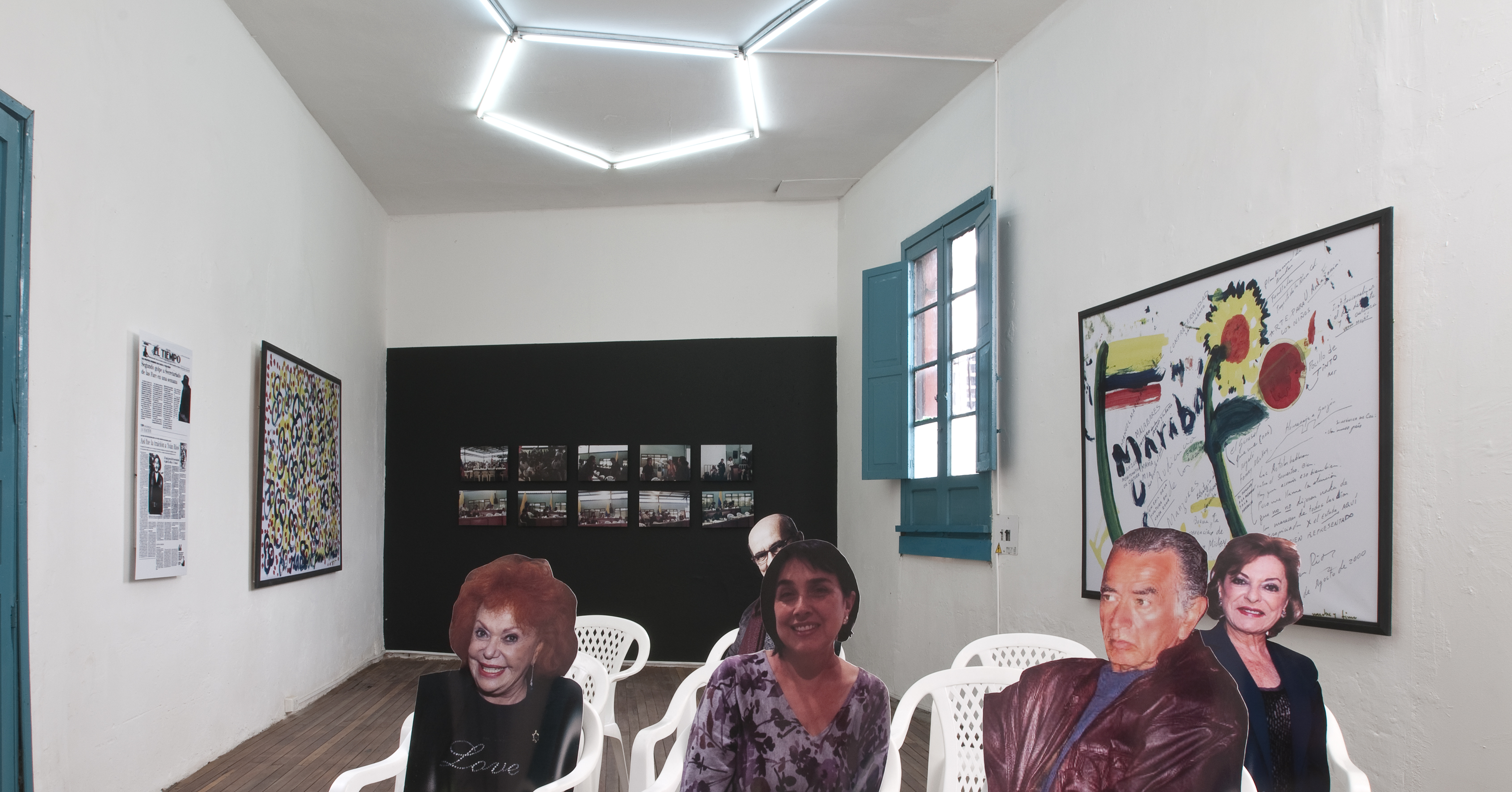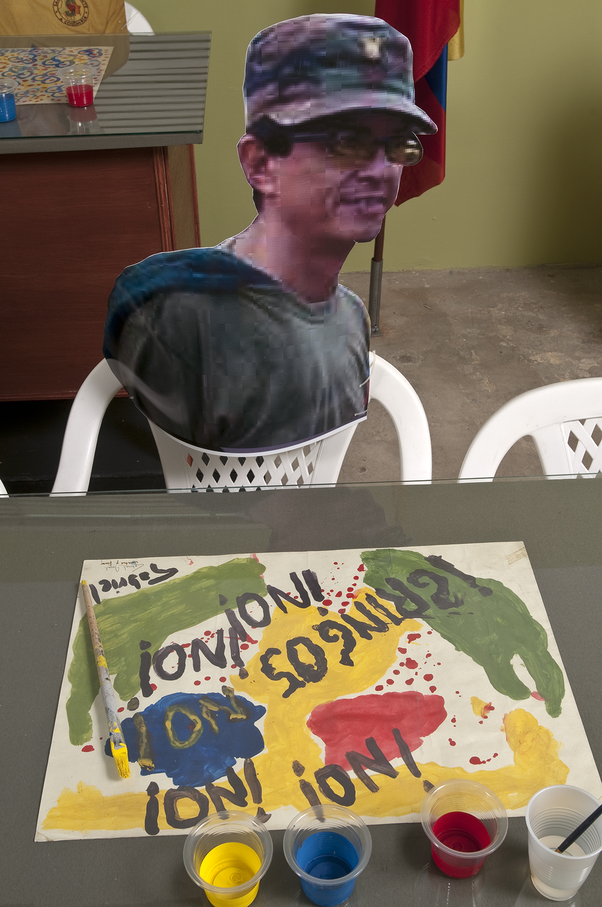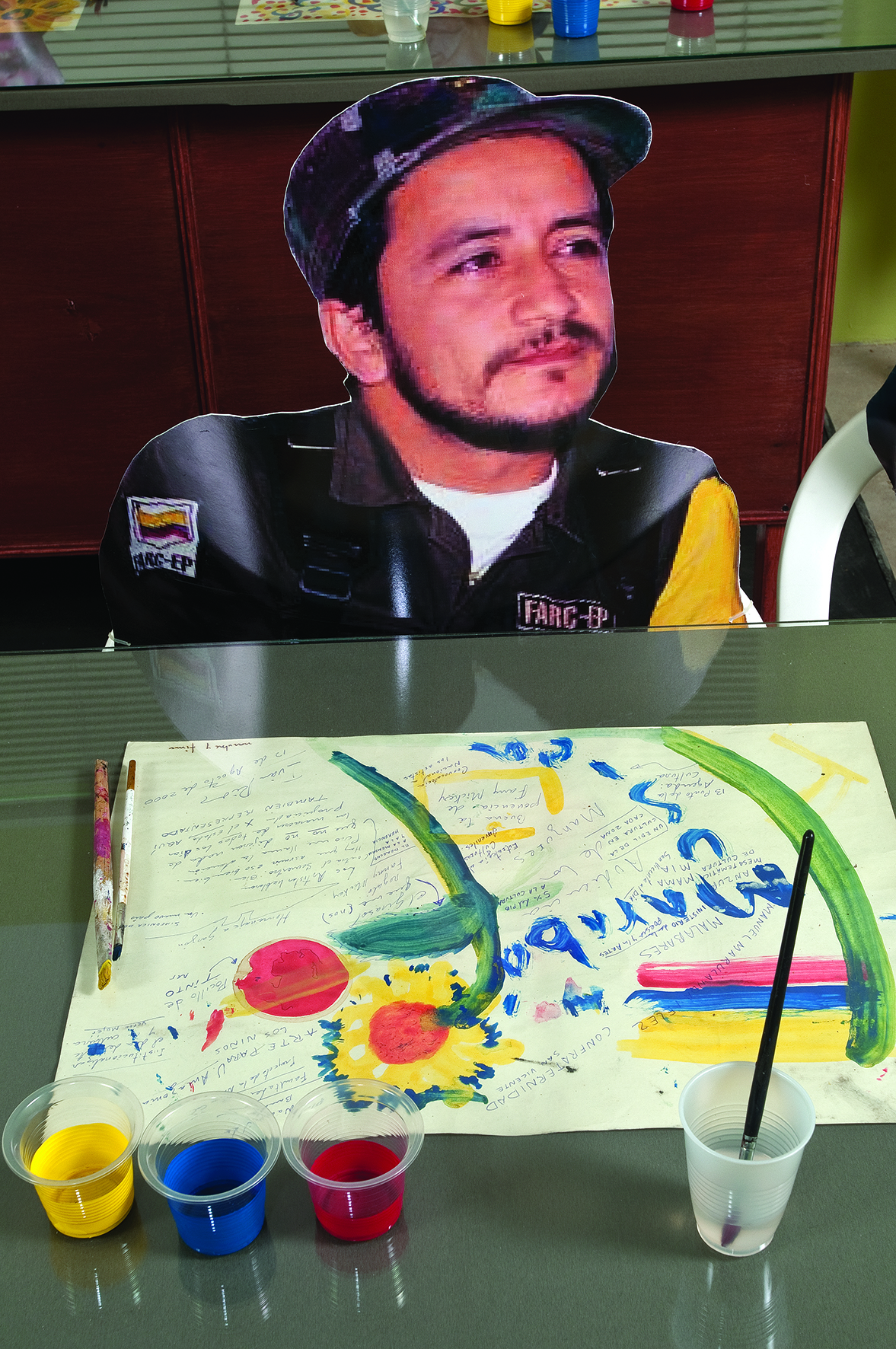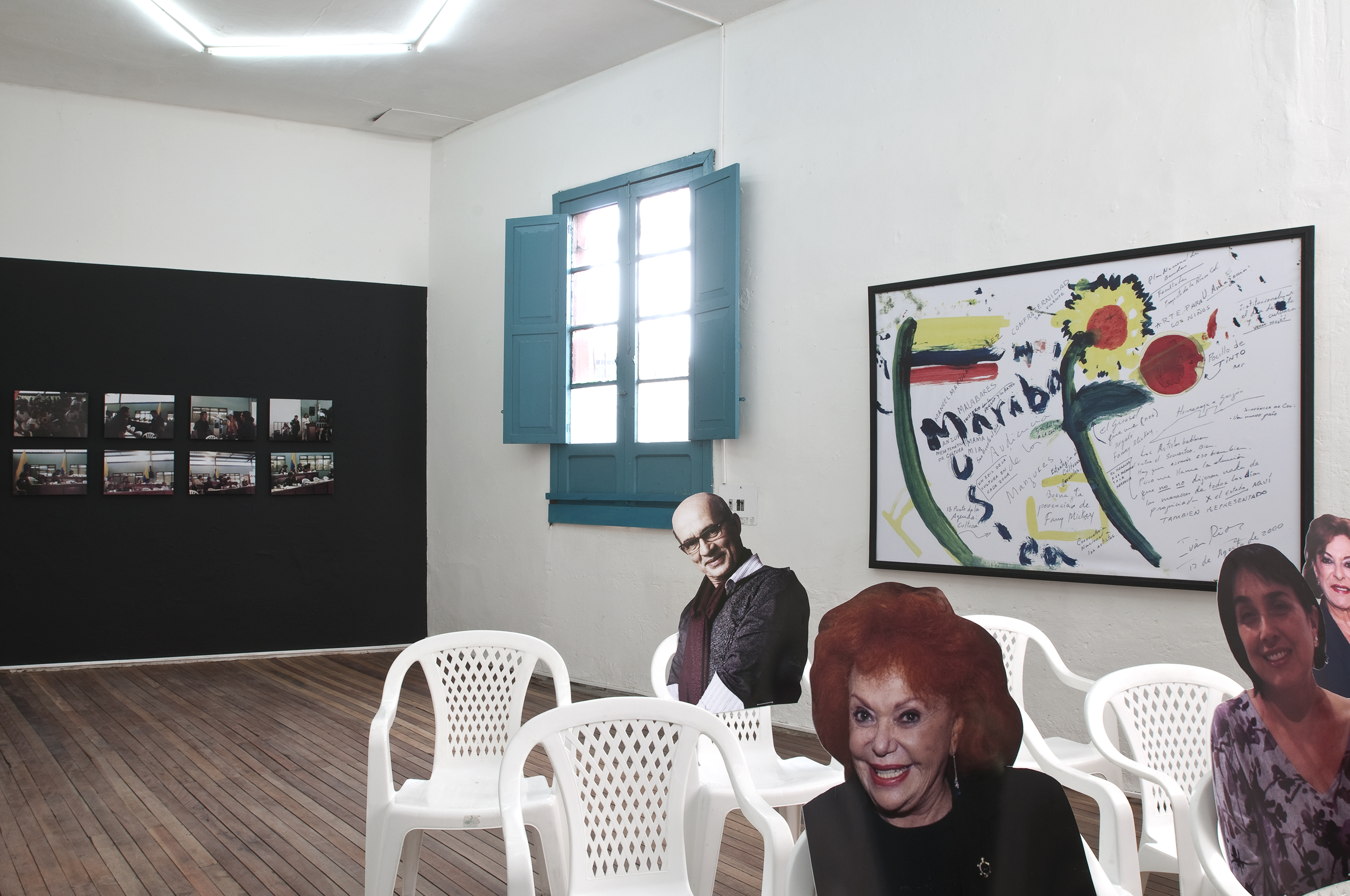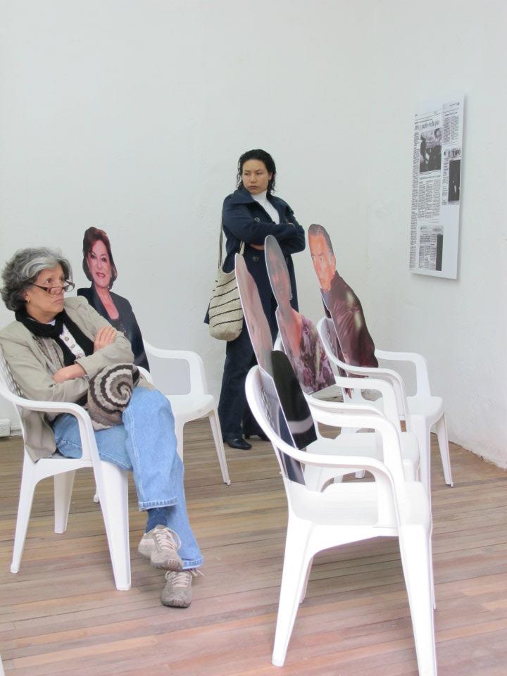 Dos salas donde predominan las sillas de plástico baratas, los colores de la bandera colombiana y la imagen del artista David Manzur (en el plotter de un cartón que pintó, en ocho fotografías, en video). Un proyecto de Iván Cano Mejía, que decidió asistir en agosto de 2000 como representante de una organización de artistas a las mesas de diálogo convocadas durante las negociaciones de San Vicente del Caguán. Llegó, habló con la guerrillera encargada de organizar el capítulo de cultura. Le dijo que había llevado una actividad. Ella lo escuchó y aceptó: cada humano sentado en la mesa principal recibiría 1/4 de papel y vinilos amarillo, azul, rojo. No debían preocuparse por los pinceles; de lo que sí, era de saber qué hacer con lo que les habían dado.