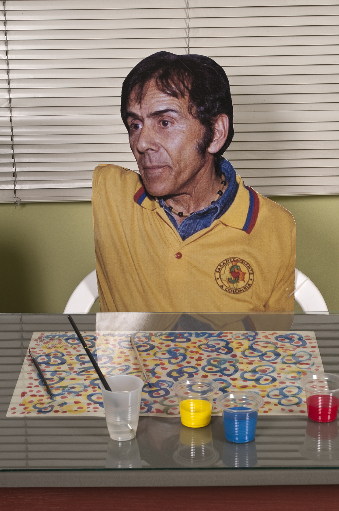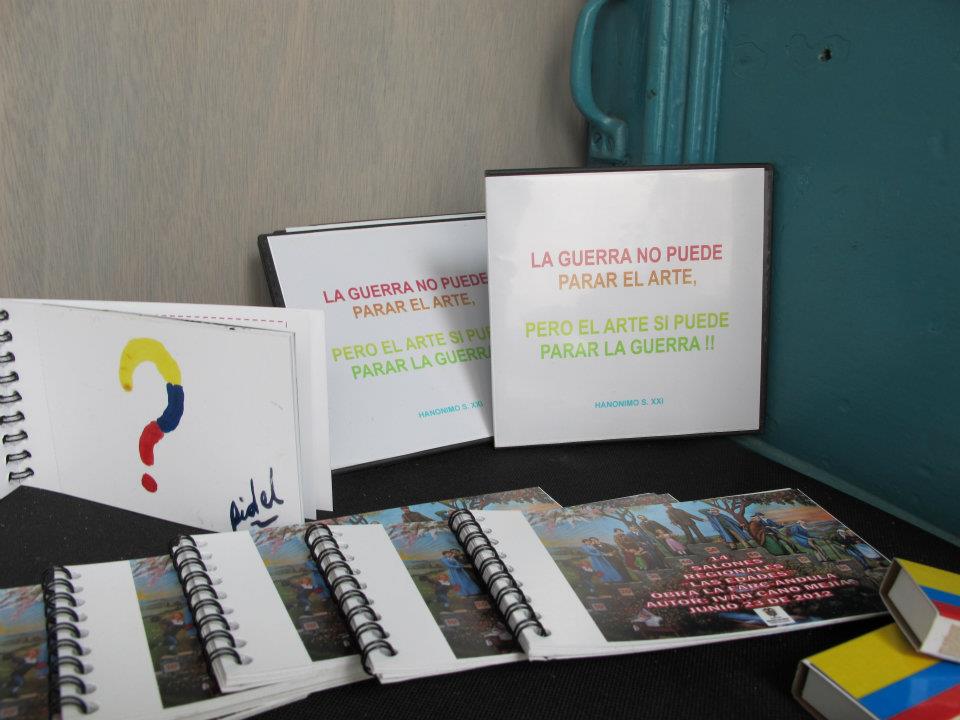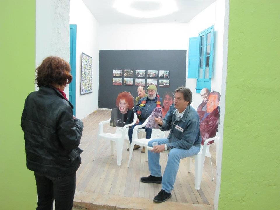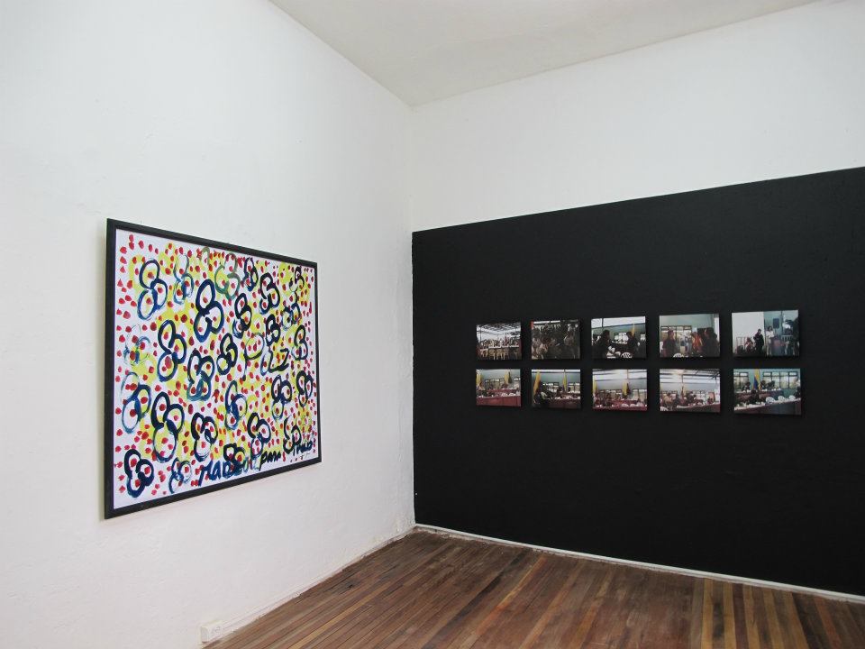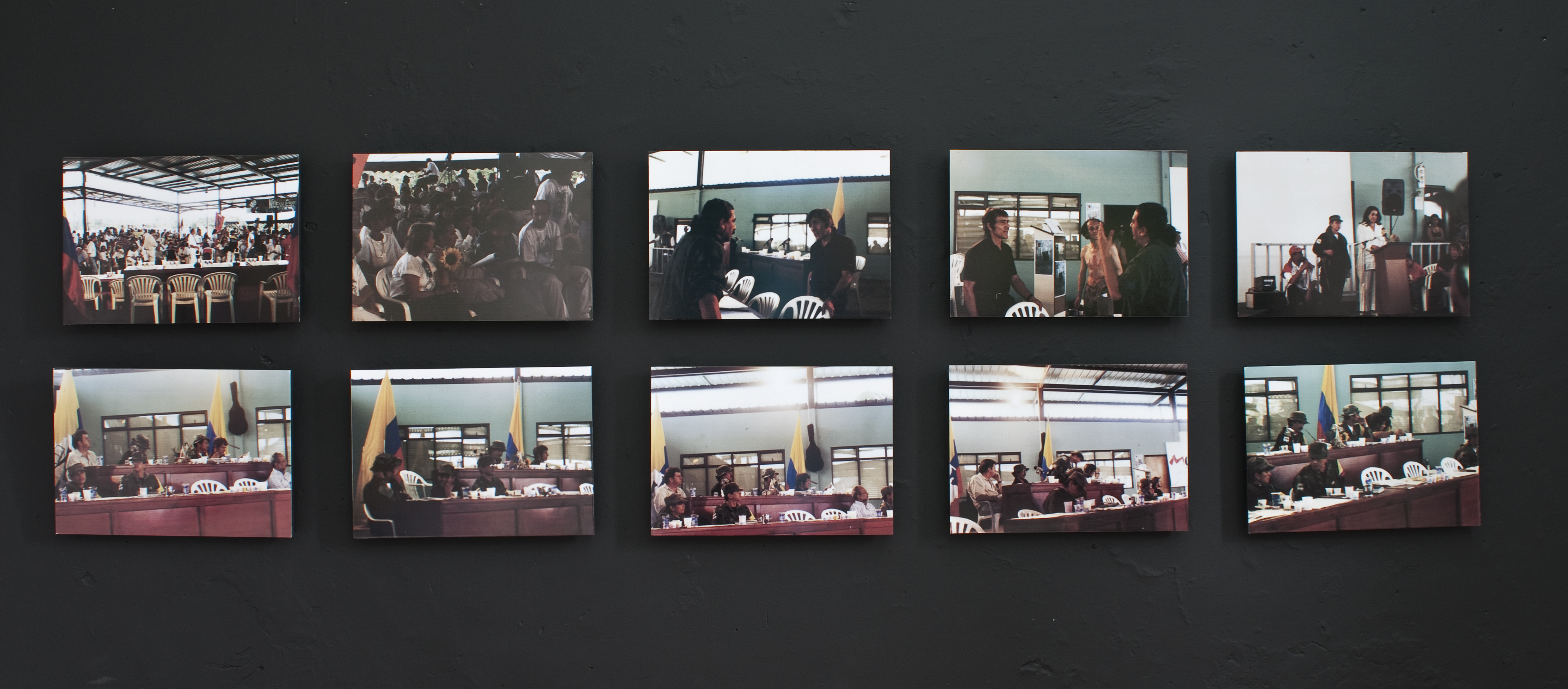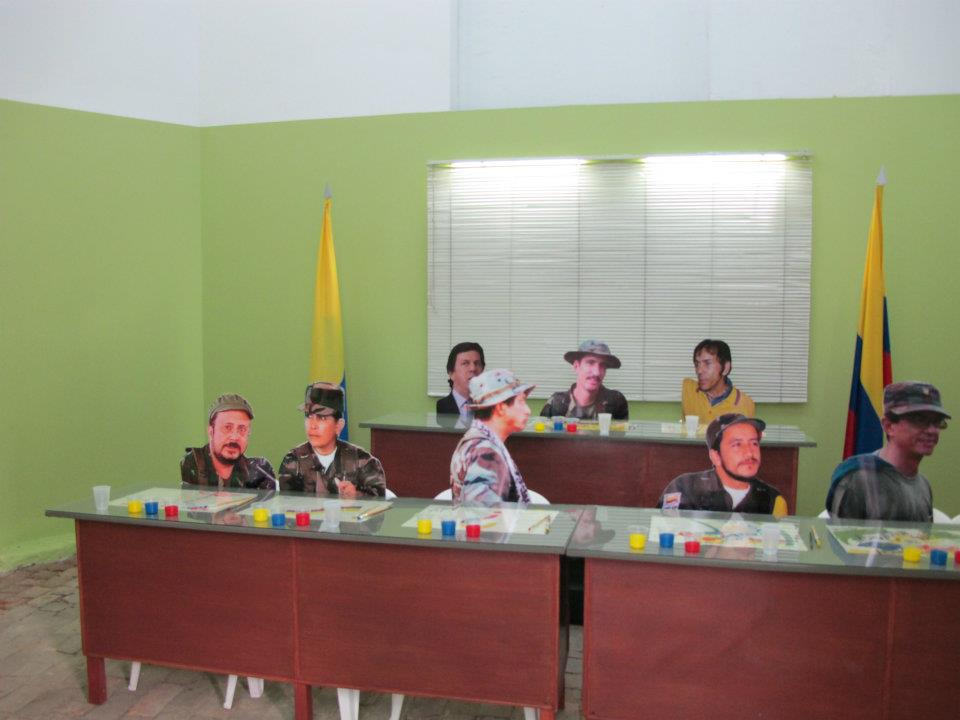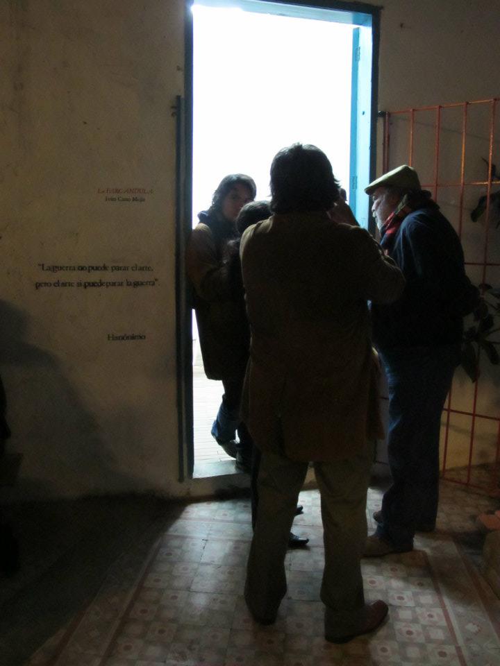 Dos salas donde predominan las sillas de plástico baratas, los colores de la bandera colombiana y la imagen del artista David Manzur (en el plotter de un cartón que pintó, en ocho fotografías, en video). Un proyecto de Iván Cano Mejía, que decidió asistir en agosto de 2000 como representante de una organización de artistas a las mesas de diálogo convocadas durante las negociaciones de San Vicente del Caguán. Llegó, habló con la guerrillera encargada de organizar el capítulo de cultura. Le dijo que había llevado una actividad. Ella lo escuchó y aceptó: cada humano sentado en la mesa principal recibiría 1/4 de papel y vinilos amarillo, azul, rojo. No debían preocuparse por los pinceles; de lo que sí, era de saber qué hacer con lo que les habían dado.