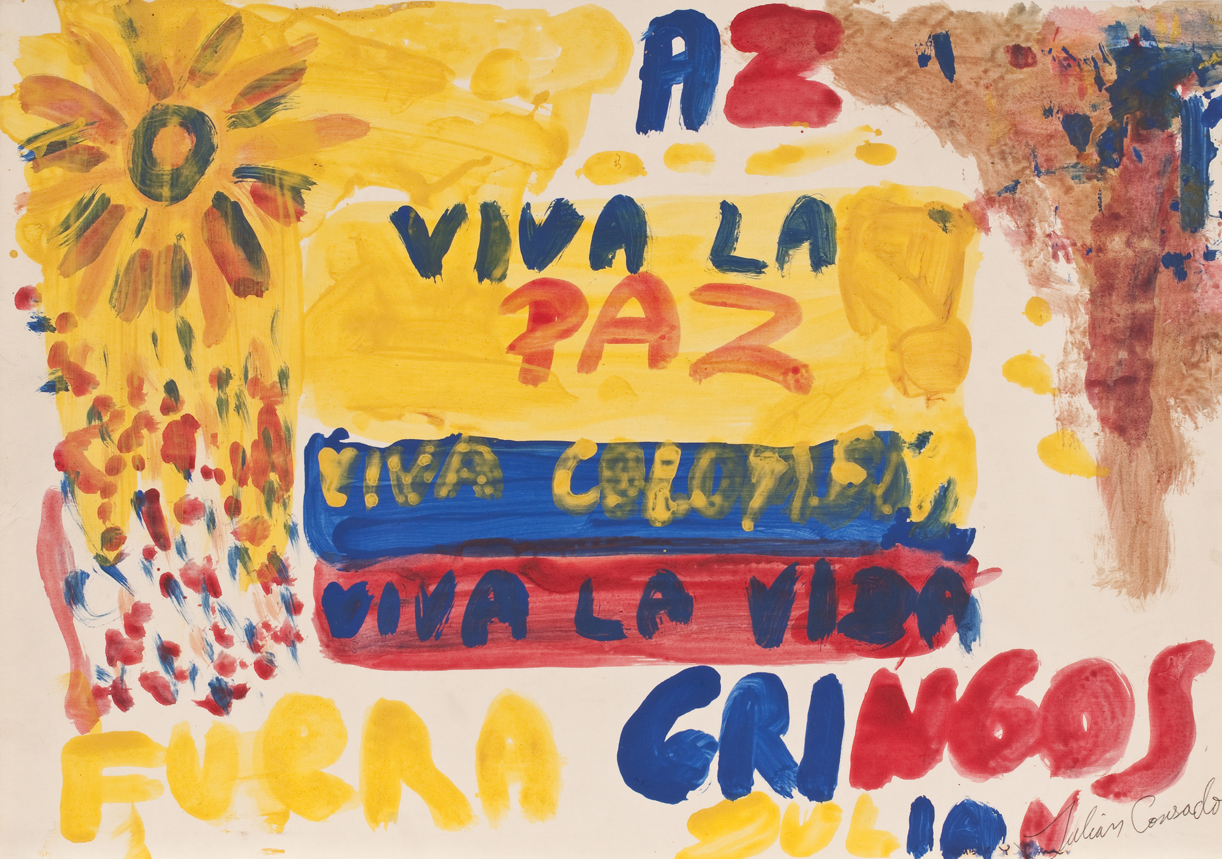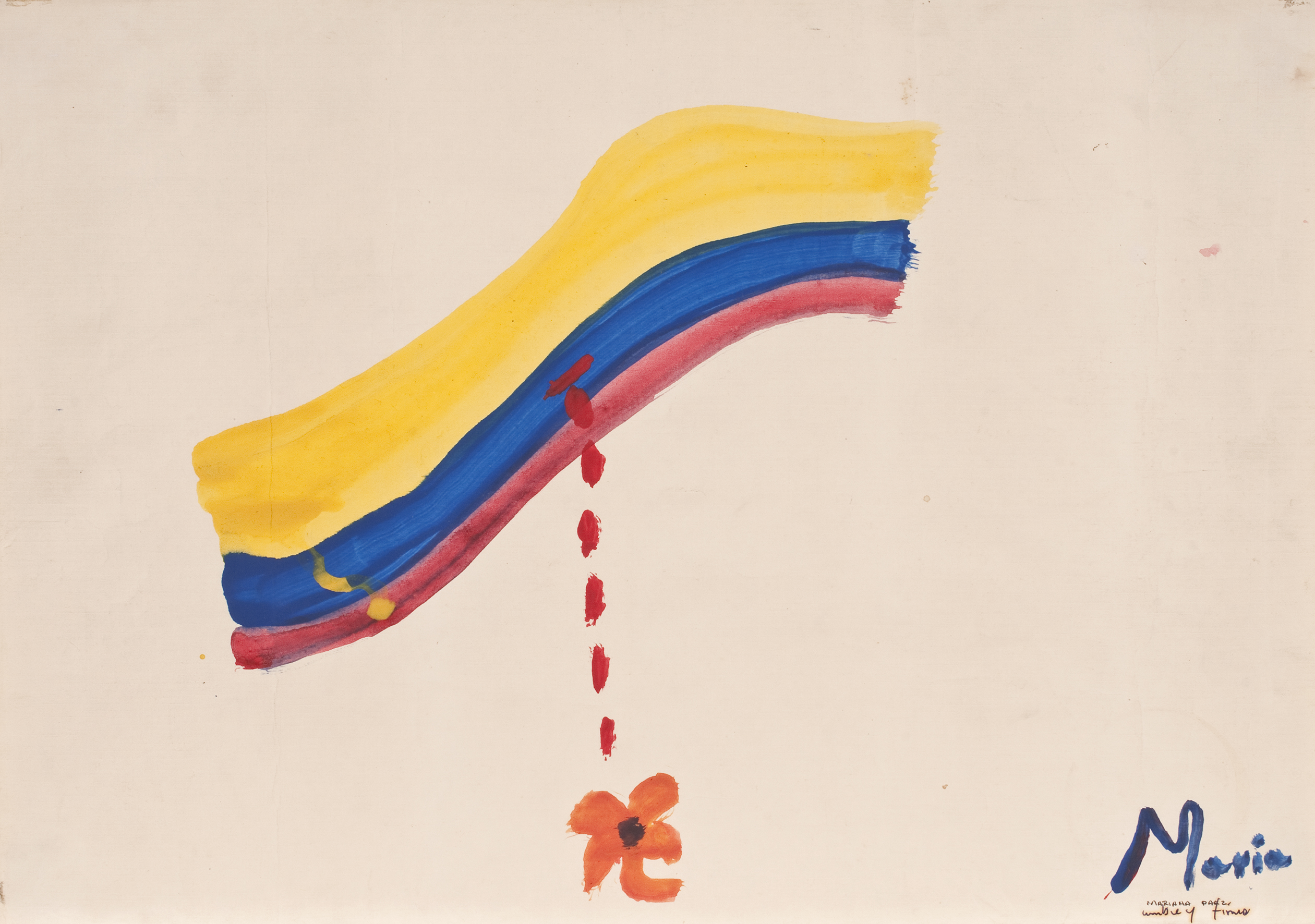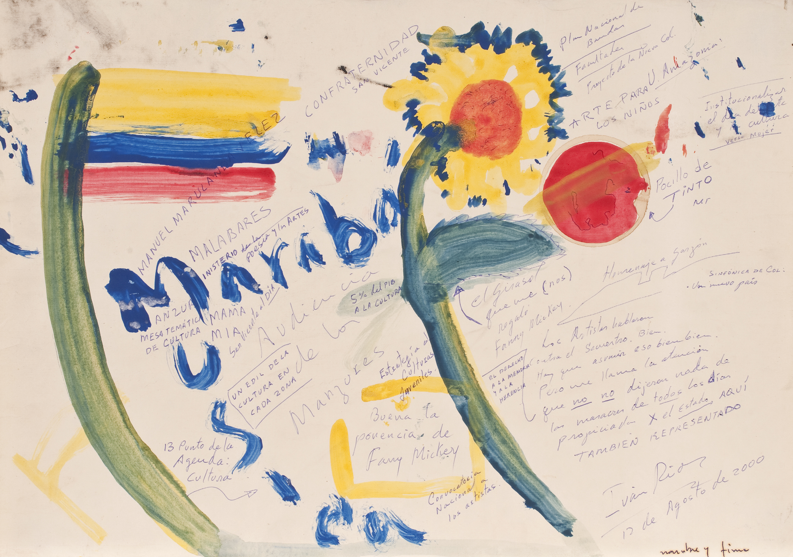 Al Pombo que en ese entonces fungía de “Presidente vocero de los medios de comunicación” de esas conversaciones, no le importó ser vocero de nada y no aceptó el papel. A los demás, poco. Al guerrillero asesinado en 2008 y cuya mano fuera amputada por su escolta para cobrar la recompensa (sublime acto de humanidad), sí. Mucho. Éste usó el soporte como una agenda donde anotó lo que más le interesaba. Pintó como se hacía antes, cuando se hablaba por teléfono y se ponían rayitas. En este caso, banderas, una mancha de café, otras manchas. En algún momento deja entrever un guiño de corrección ideológica (como en el modelo comunista la propiedad privada no existe, el guerrillero enmienda el error típico del pequeñoburgués ilustrado, cuando escribe: “el girasol que me (nos) regaló Fanny Myckey”). Era humano, se equivocaba. Creía en la revolución (y en la gente con quien hacía la revolución).