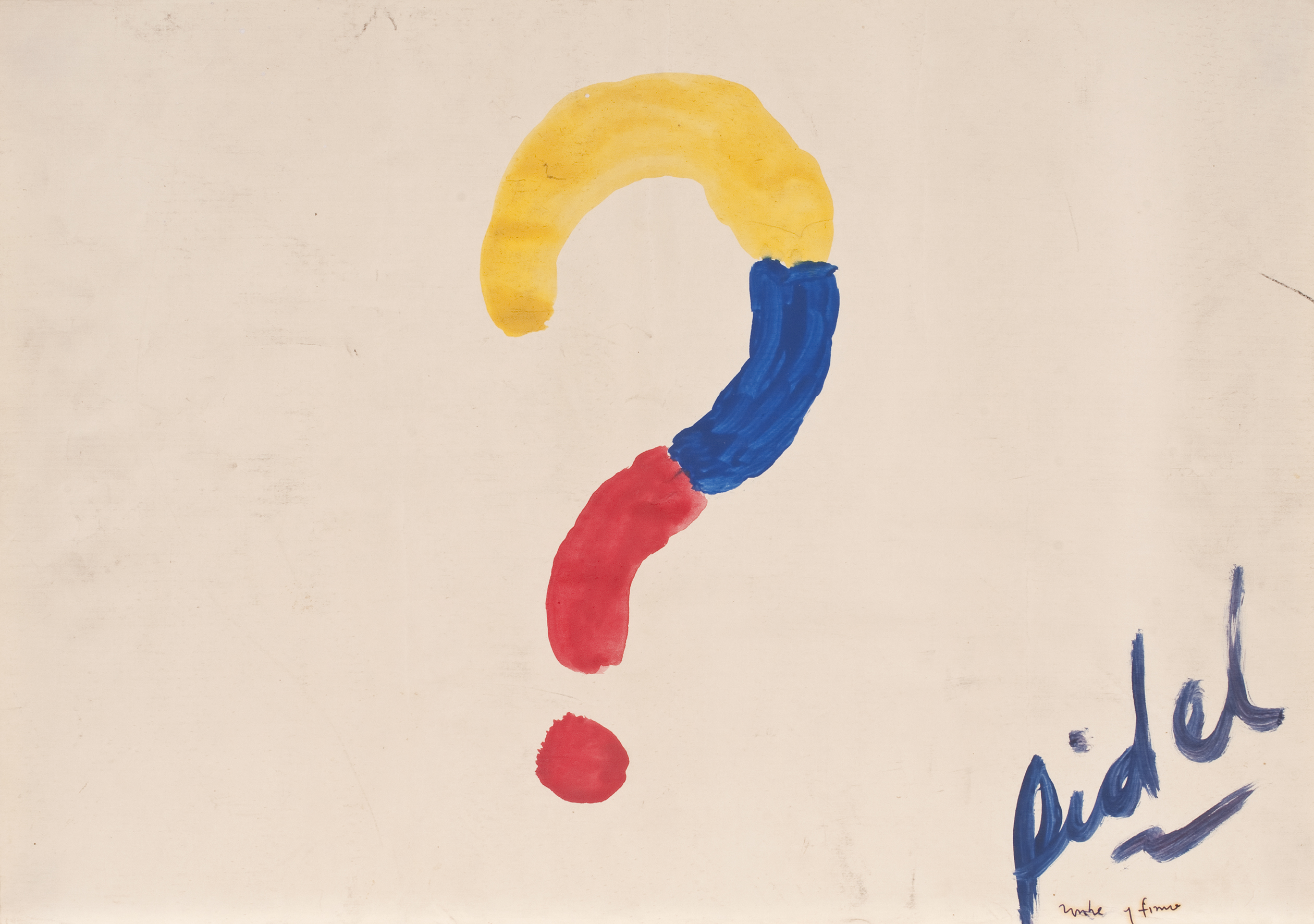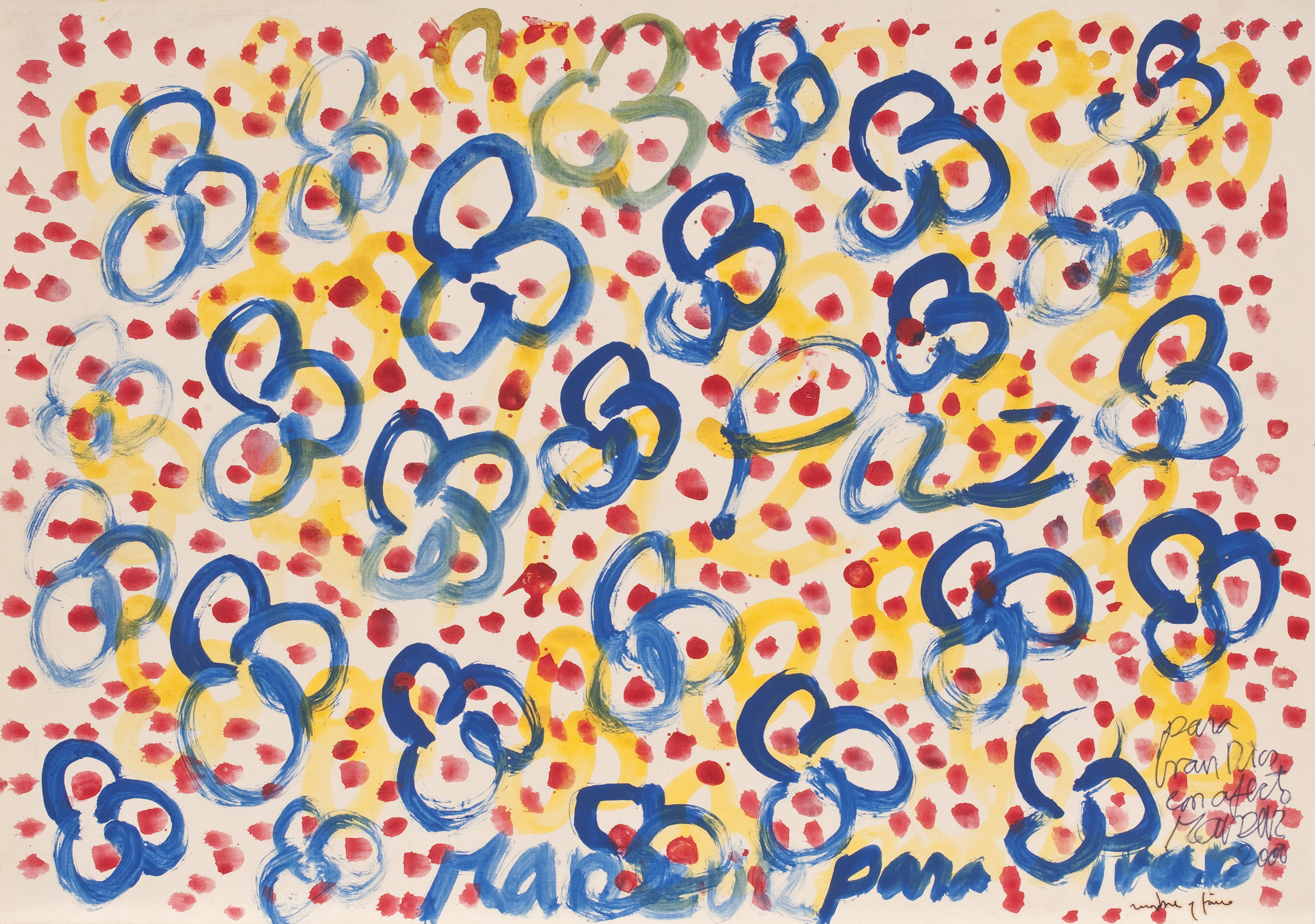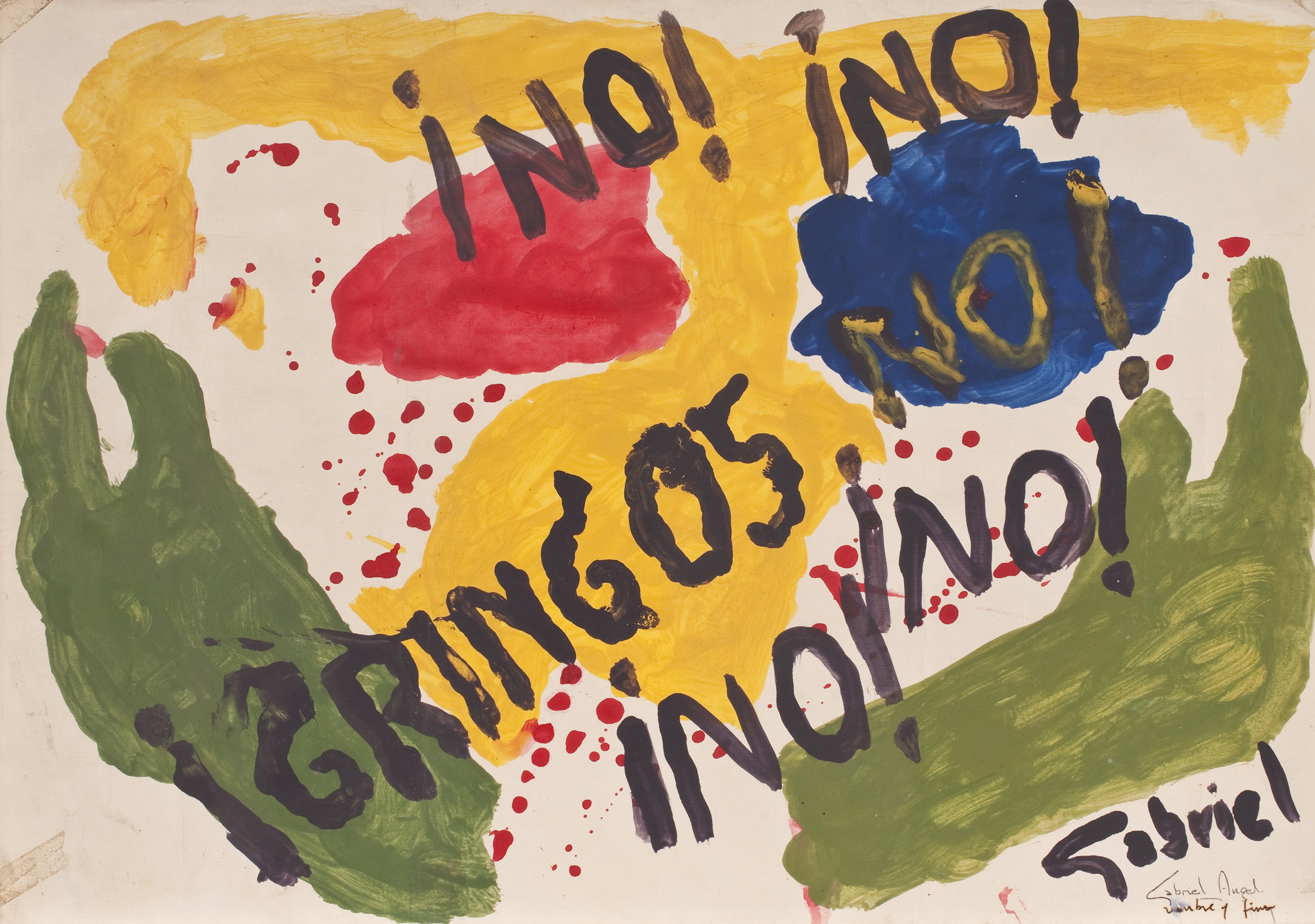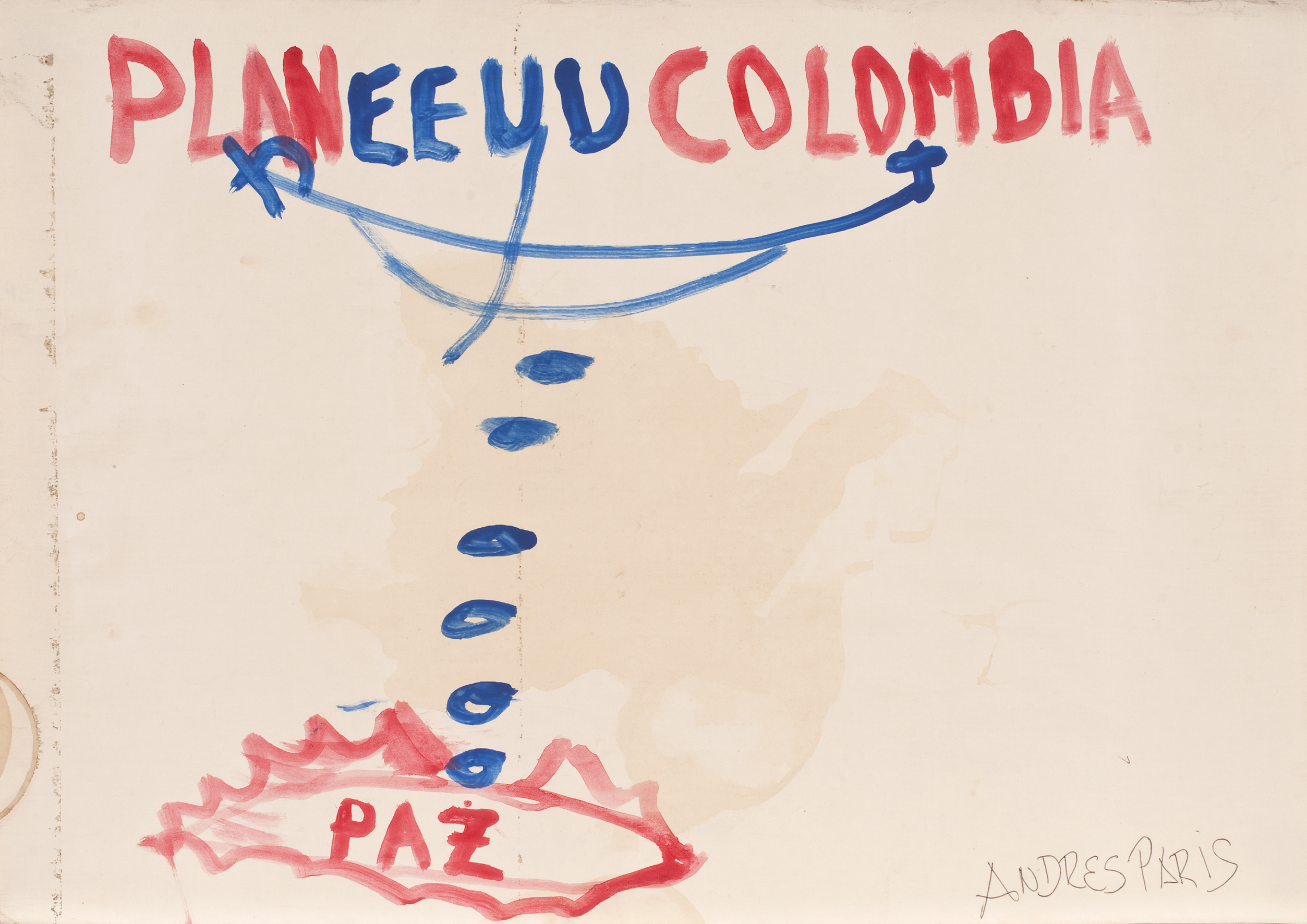 Al Pombo que en ese entonces fungía de “Presidente vocero de los medios de comunicación” de esas conversaciones, no le importó ser vocero de nada y no aceptó el papel. A los demás, poco. Al guerrillero asesinado en 2008 y cuya mano fuera amputada por su escolta para cobrar la recompensa (sublime acto de humanidad), sí. Mucho. Éste usó el soporte como una agenda donde anotó lo que más le interesaba. Pintó como se hacía antes, cuando se hablaba por teléfono y se ponían rayitas. En este caso, banderas, una mancha de café, otras manchas. En algún momento deja entrever un guiño de corrección ideológica (como en el modelo comunista la propiedad privada no existe, el guerrillero enmienda el error típico del pequeñoburgués ilustrado, cuando escribe: “el girasol que me (nos) regaló Fanny Myckey”). Era humano, se equivocaba. Creía en la revolución (y en la gente con quien hacía la revolución).