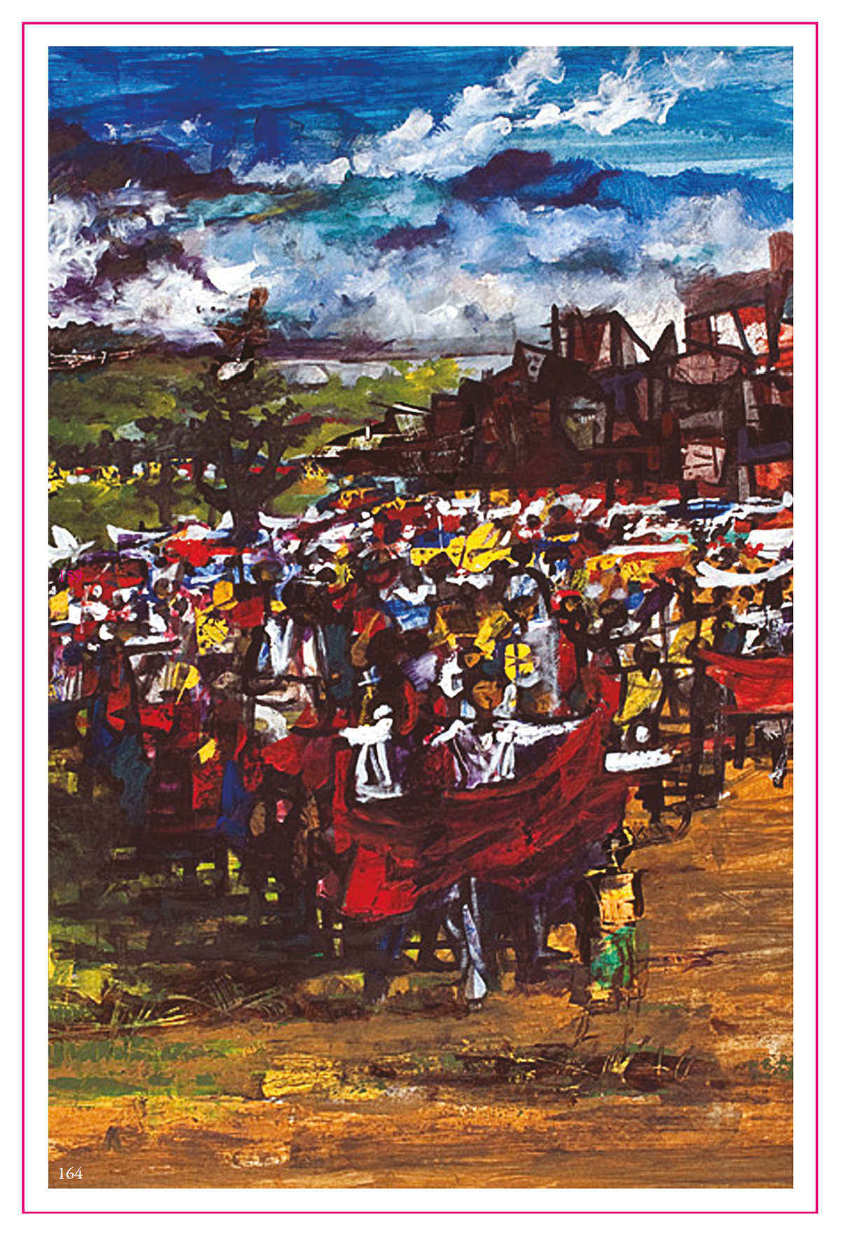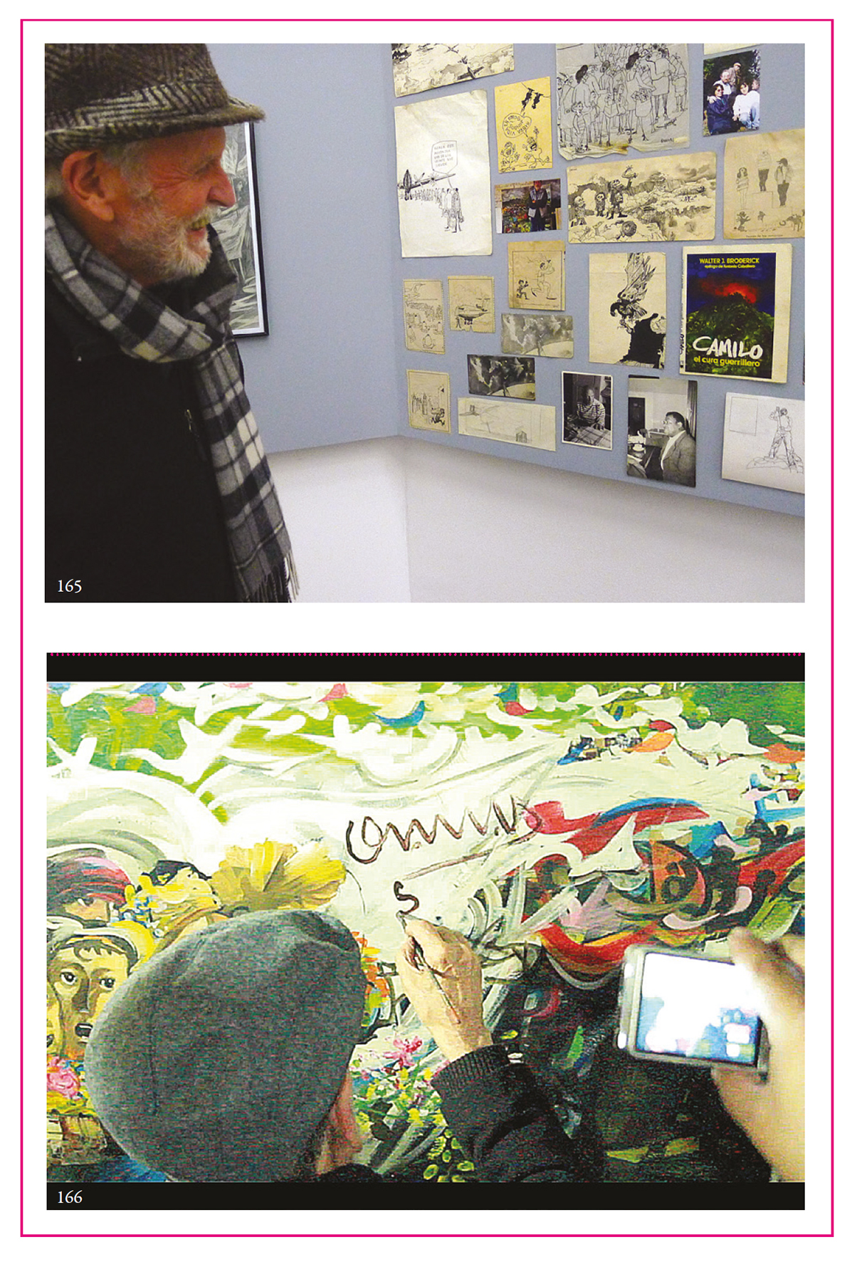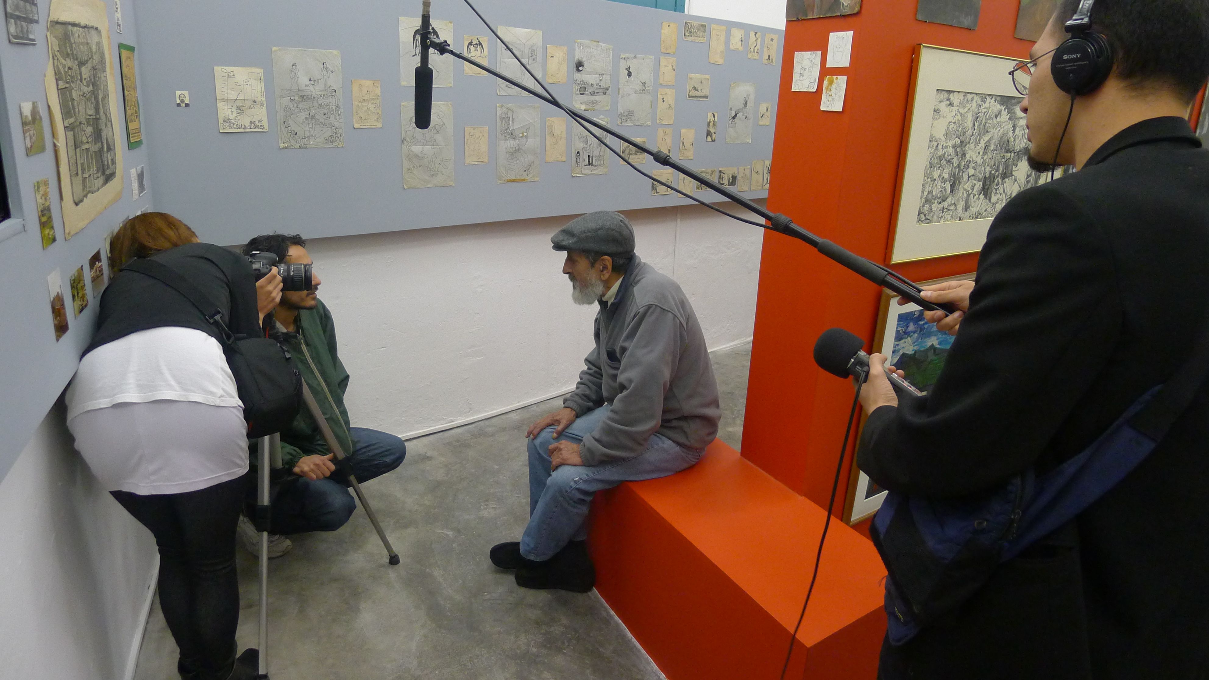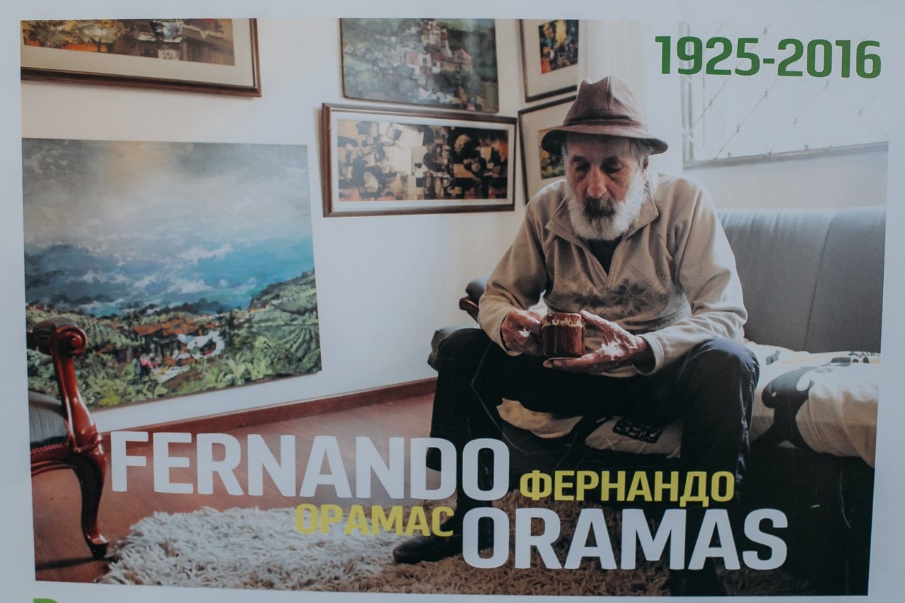 Una de las piezas que más me conmovió fue un video en donde el maestro Orama va a un centro cultural a firmar un mural que había hecho años antes. Hay bullicio y confusión y un tumulto de gente rodea al artista que luce un poco abrumado entre tanto ruido. Comienza a firmar el mural, pero sufre dos percances. Primero lo traiciona el pulso y luego el pincel, que se queda sin tinta.