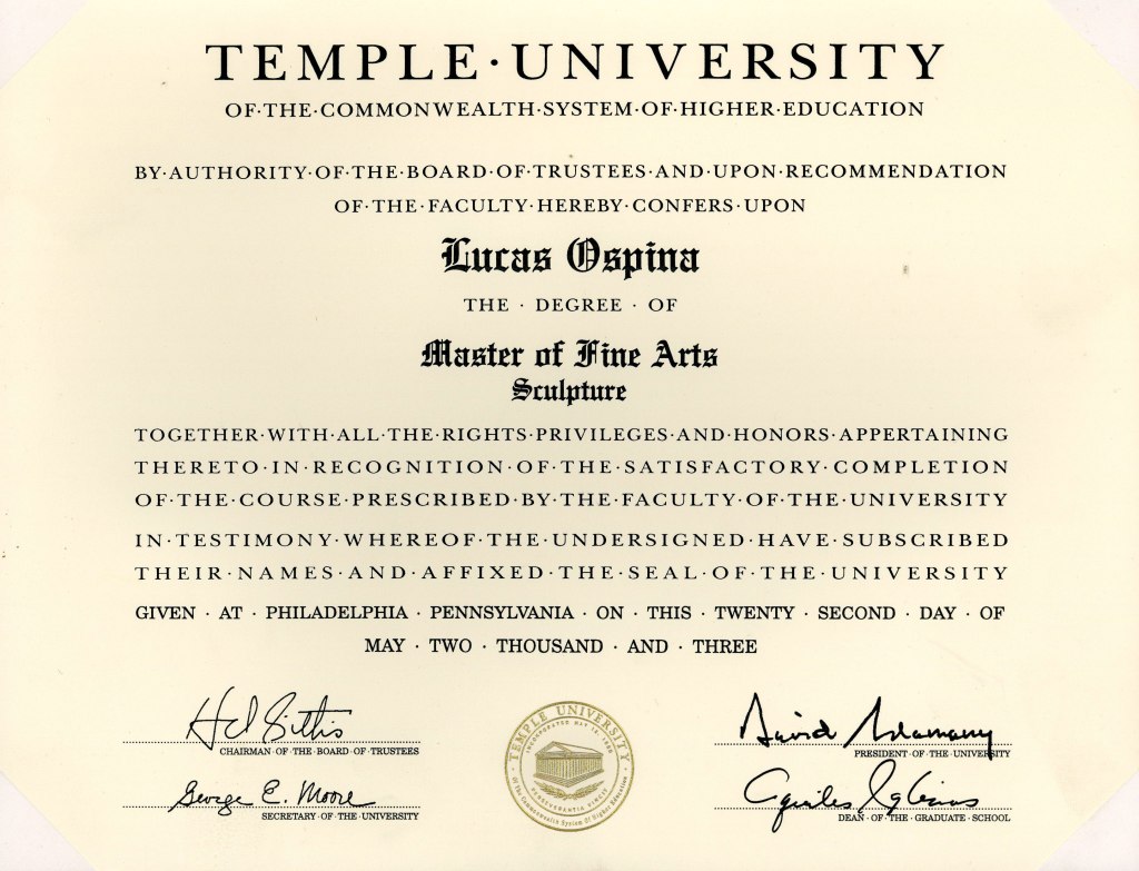 2001–2003 > Maestría > Temple University, Tyler School of Art, Philadephia (MFA in Sculpture)