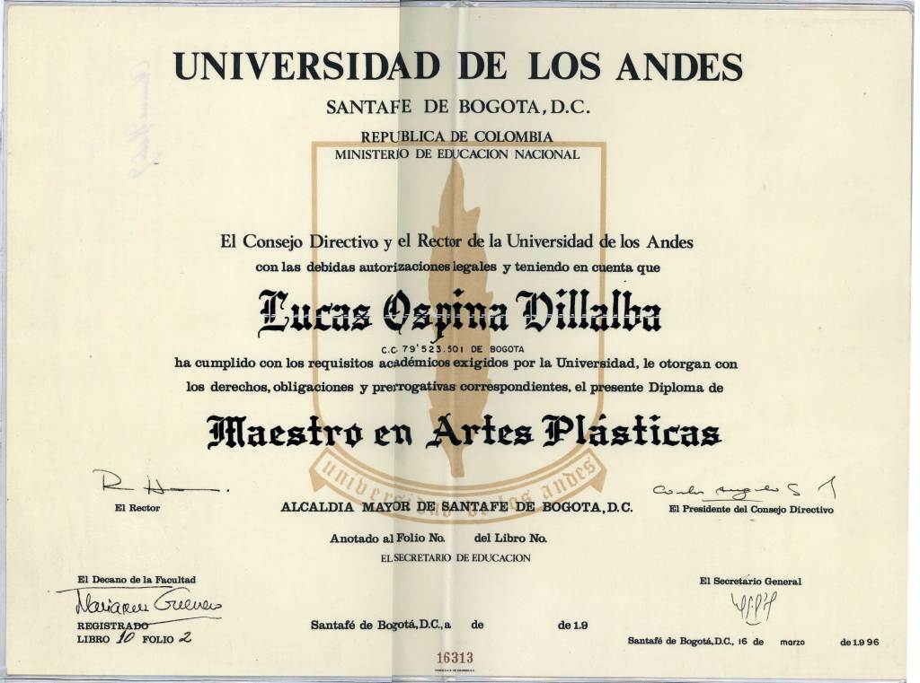 1989–1995 > Pregrado > Maestro en Artes Plásticas Universidad de los Andes, Bogotá