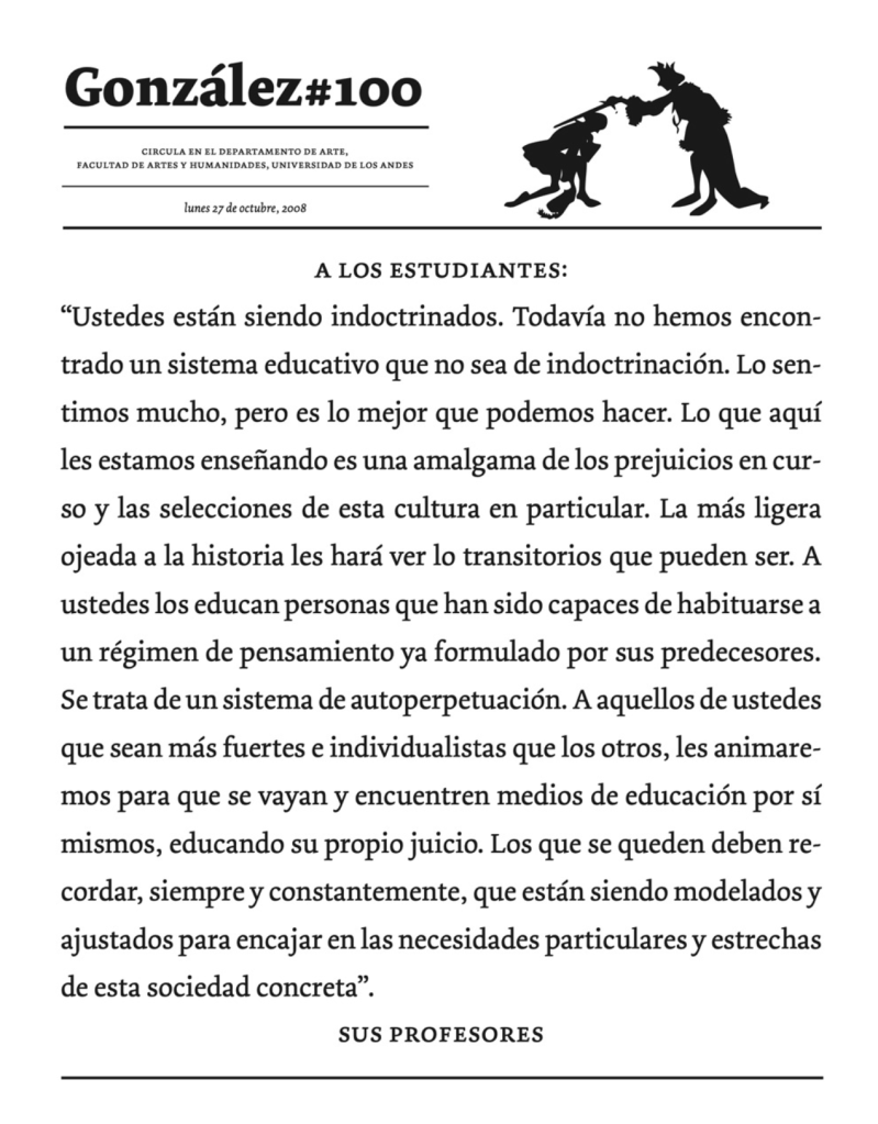 González > Creación del Archivo Institucional de la Hoja González, una publicación activa desde 2005 que circula cada semana del semestre académico y que cuenta el lado B de la Historia y las historias del Departamento de Arte de la Universidad de los Andes.